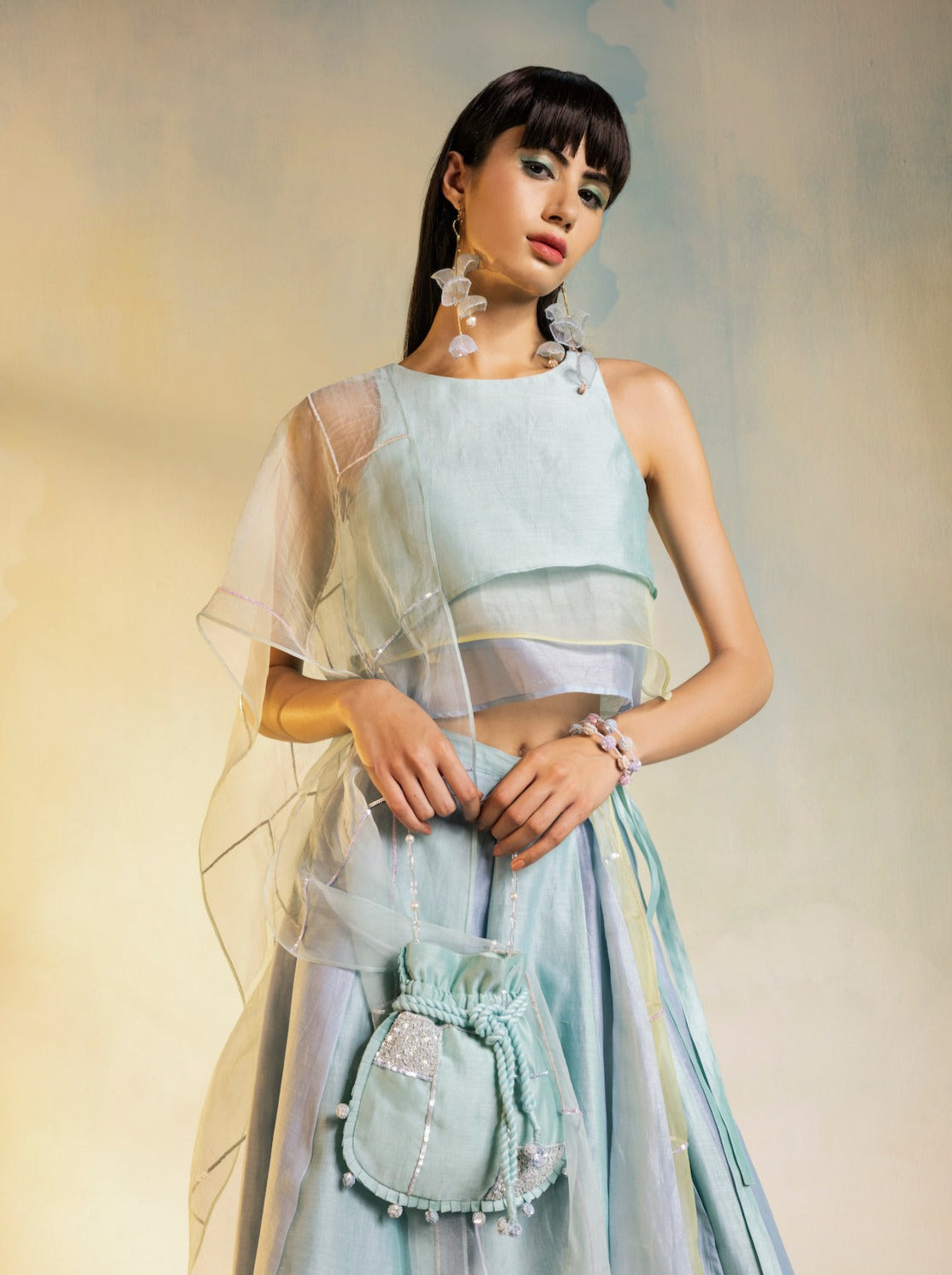 Multicolor layered pastel blouse paired with multicolor pastel wrap around lehenga, highlighted with sequin work and organza inlays. This pastel lehenga set comes with an organza dupatta with sequin hand embroidery.