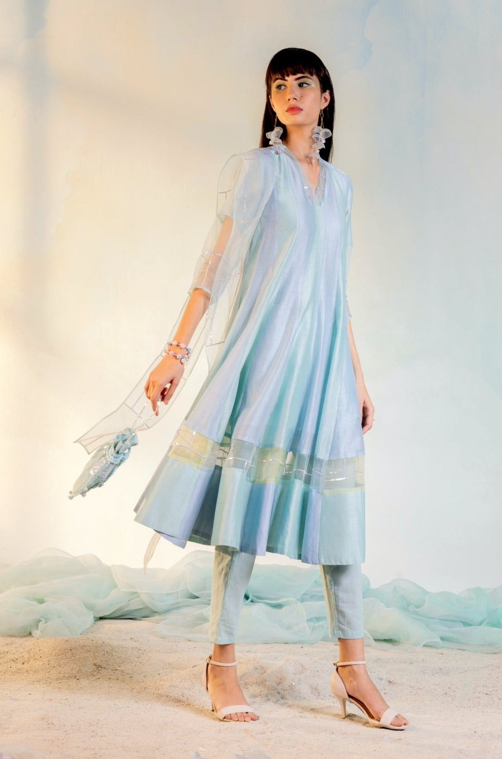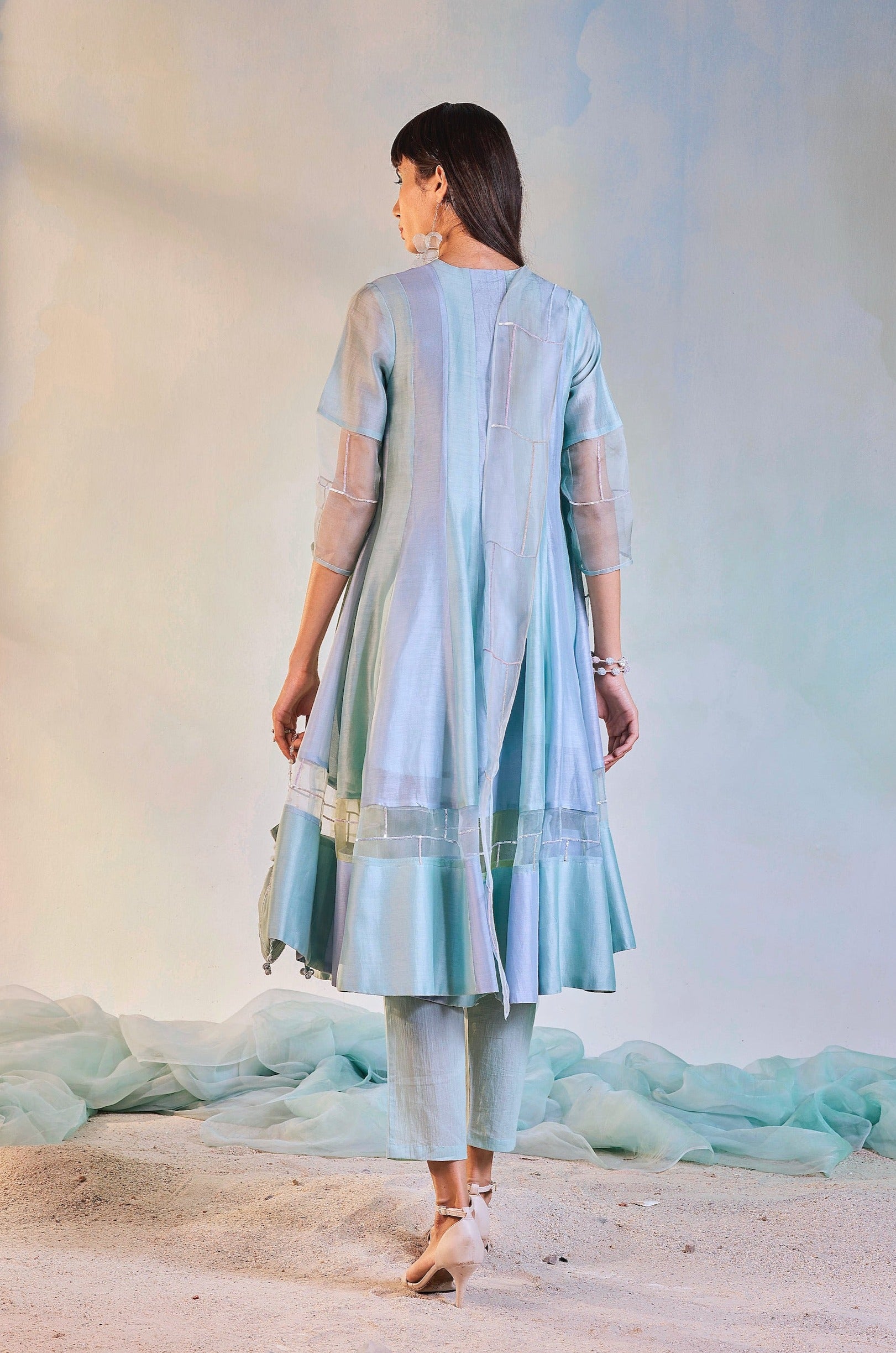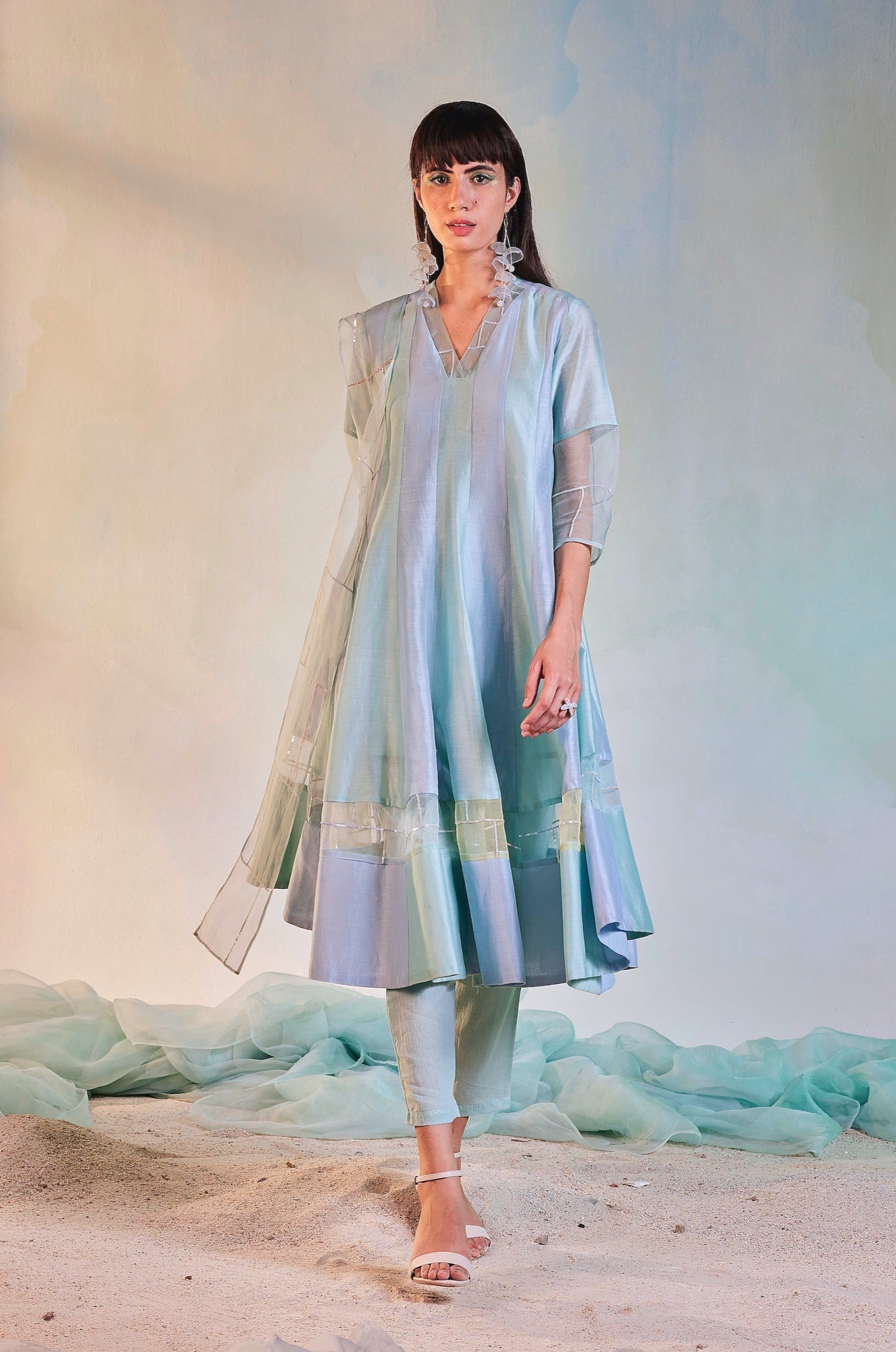 V-Neck Anarkali with sequin hand work on neck and inlay border in organza, paired with straight cotton pants and narrow organza dupatta with sequin work. Pleasant, elegant and chique!