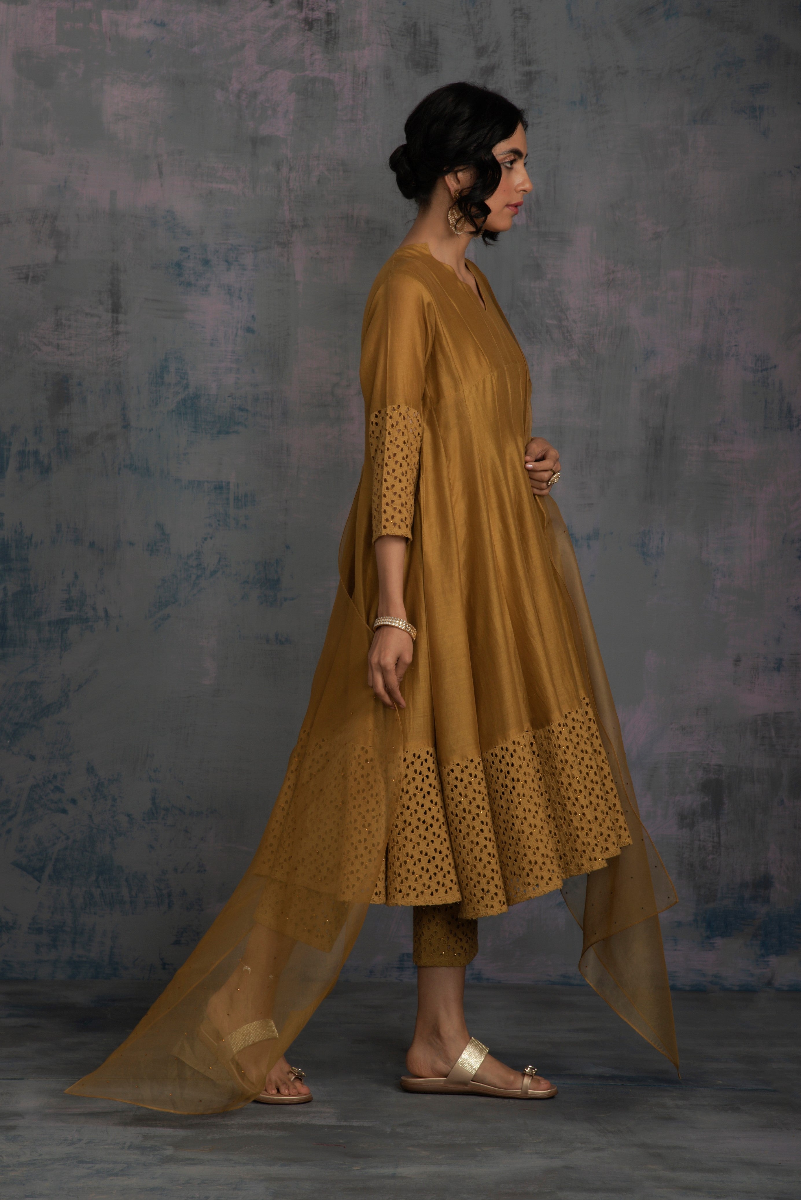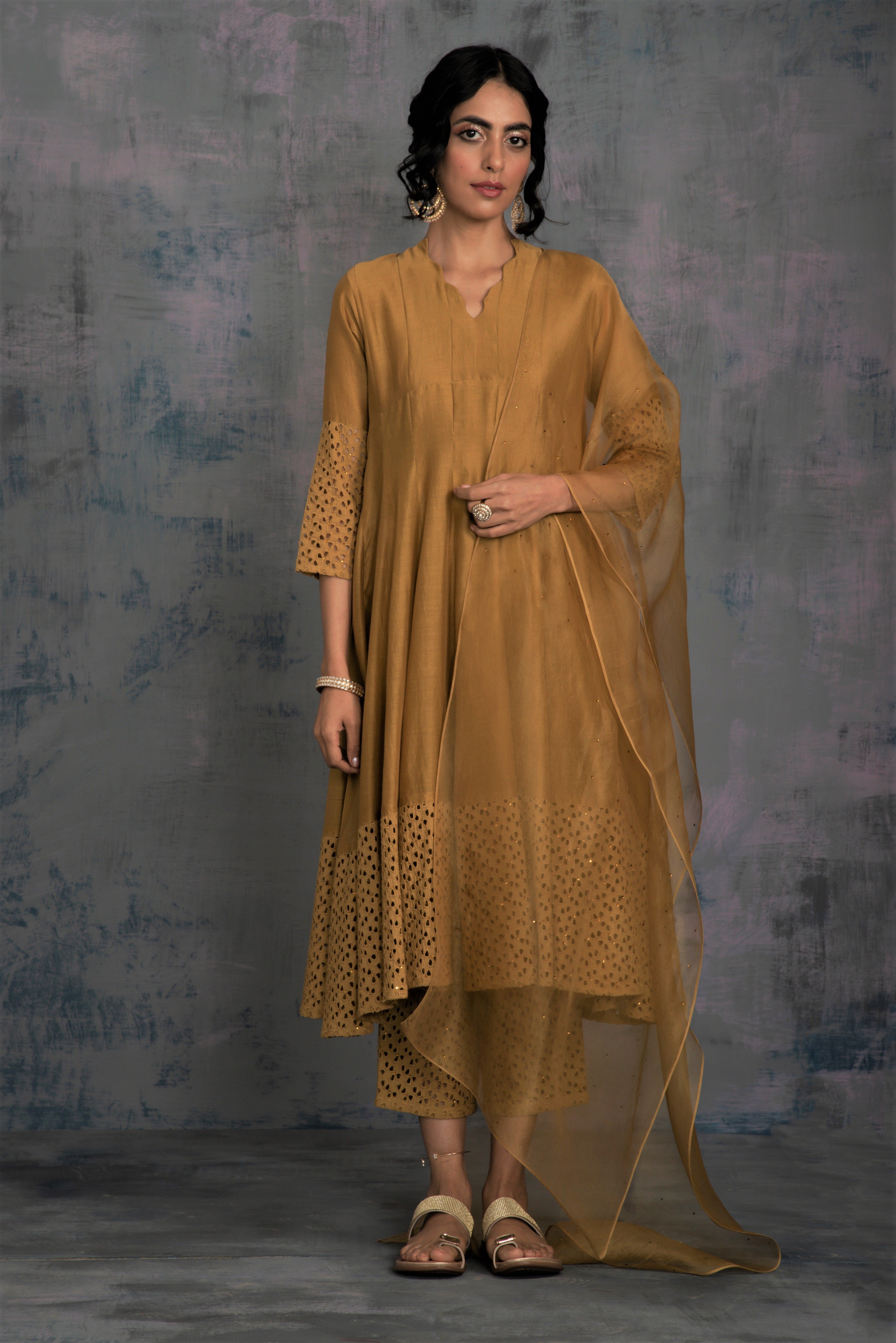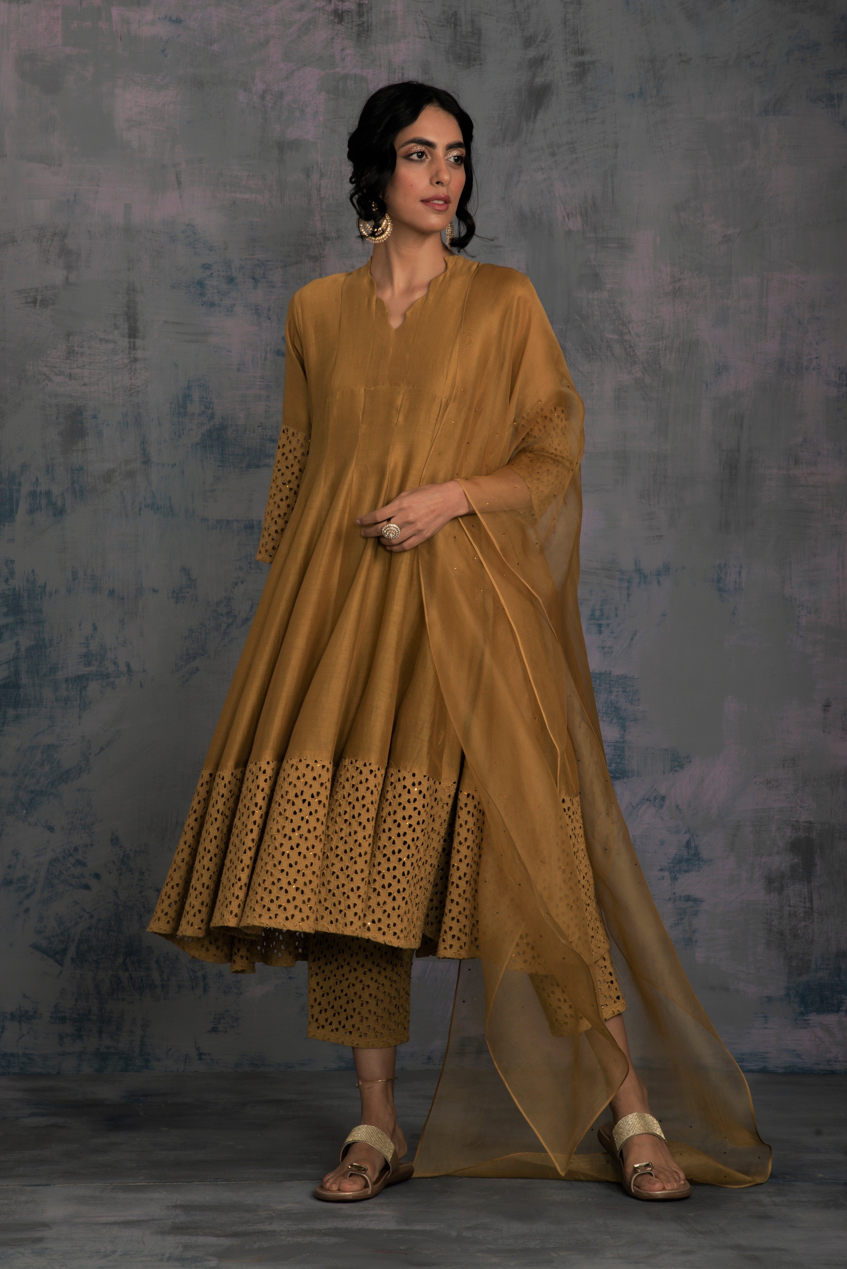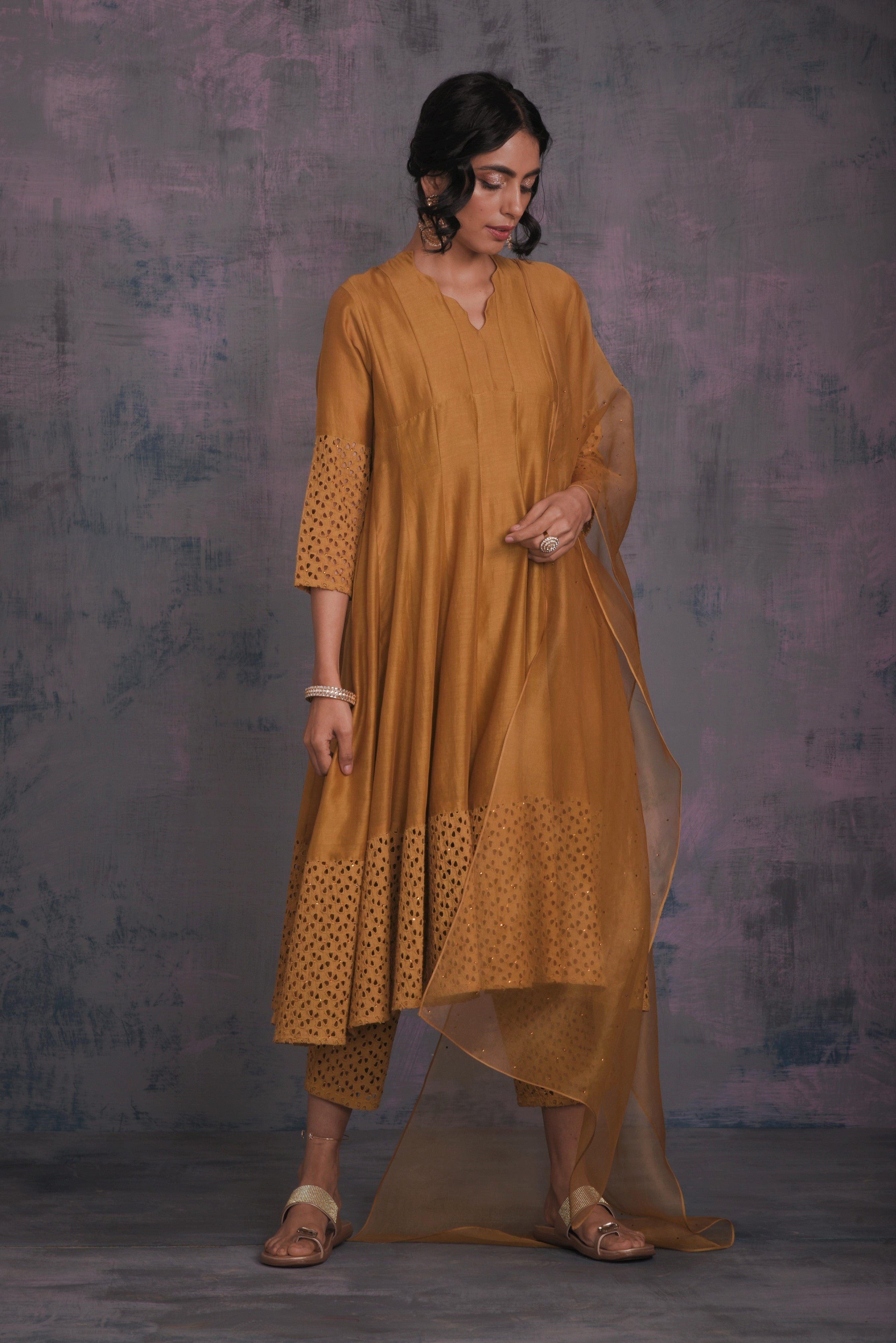 Chanderi golden kurta with jagged neckline and cutwork on sleeve & hem studded with swarovski. This kalidar kurta is paired with straight cutwork pants studded with swarovski and organza dupatta embellished with swarovski.