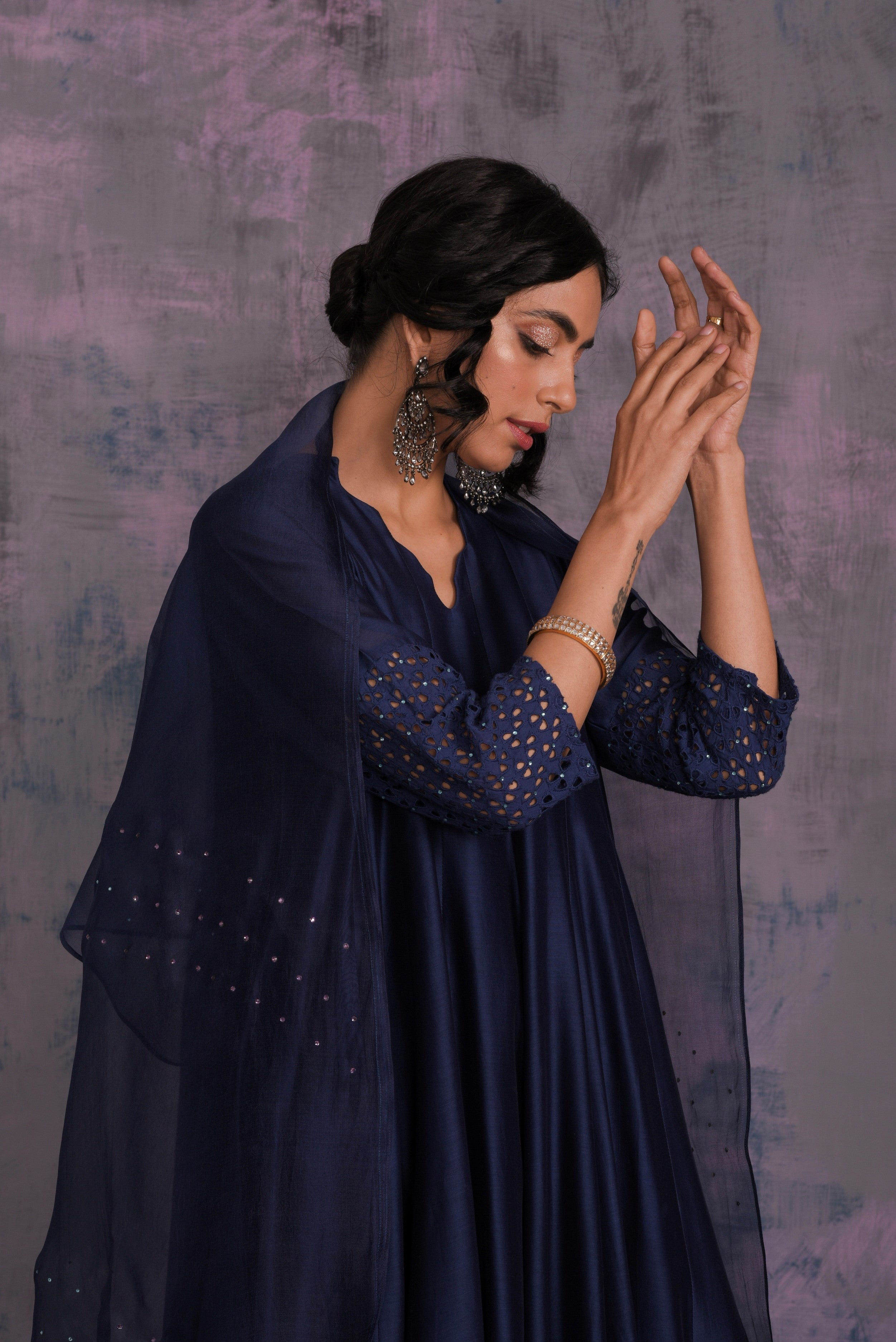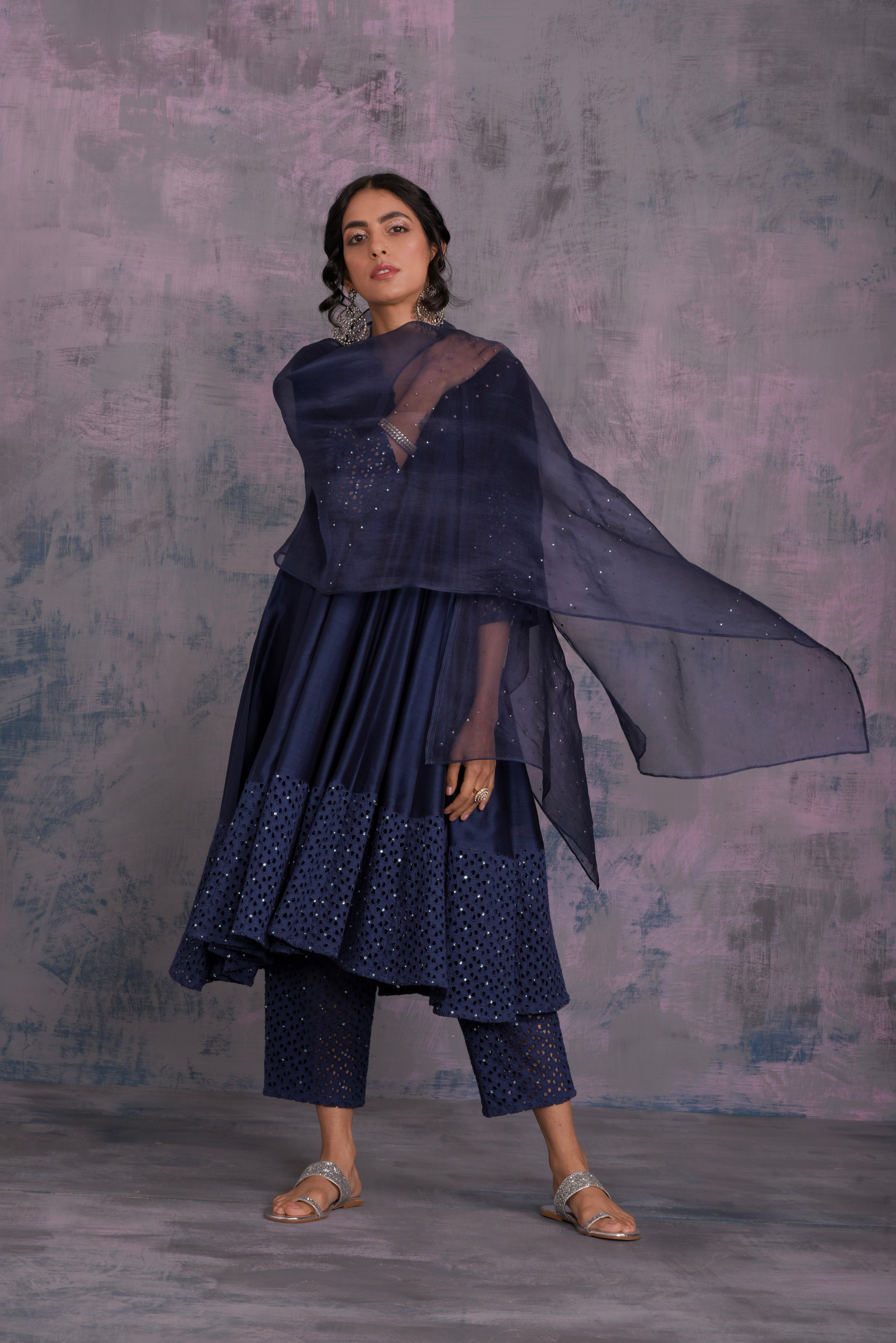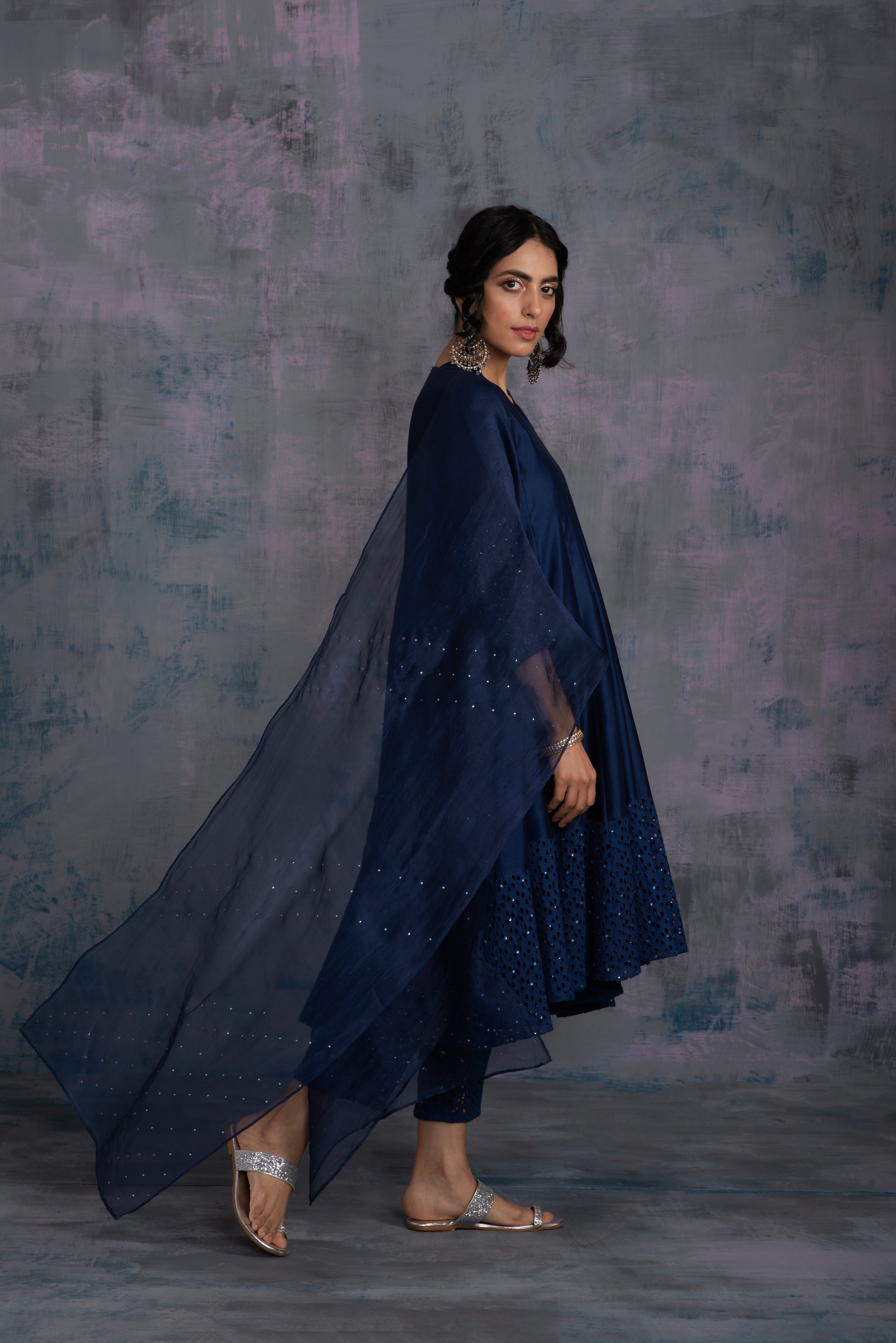 Chanderi midnight blue kurta with jagged neckline and cutwork on sleeve & hem studded with swarovski. This kalidar kurta is paired with straight cutwork pants studded with swarovski and organza dupatta embellished with swarovski.