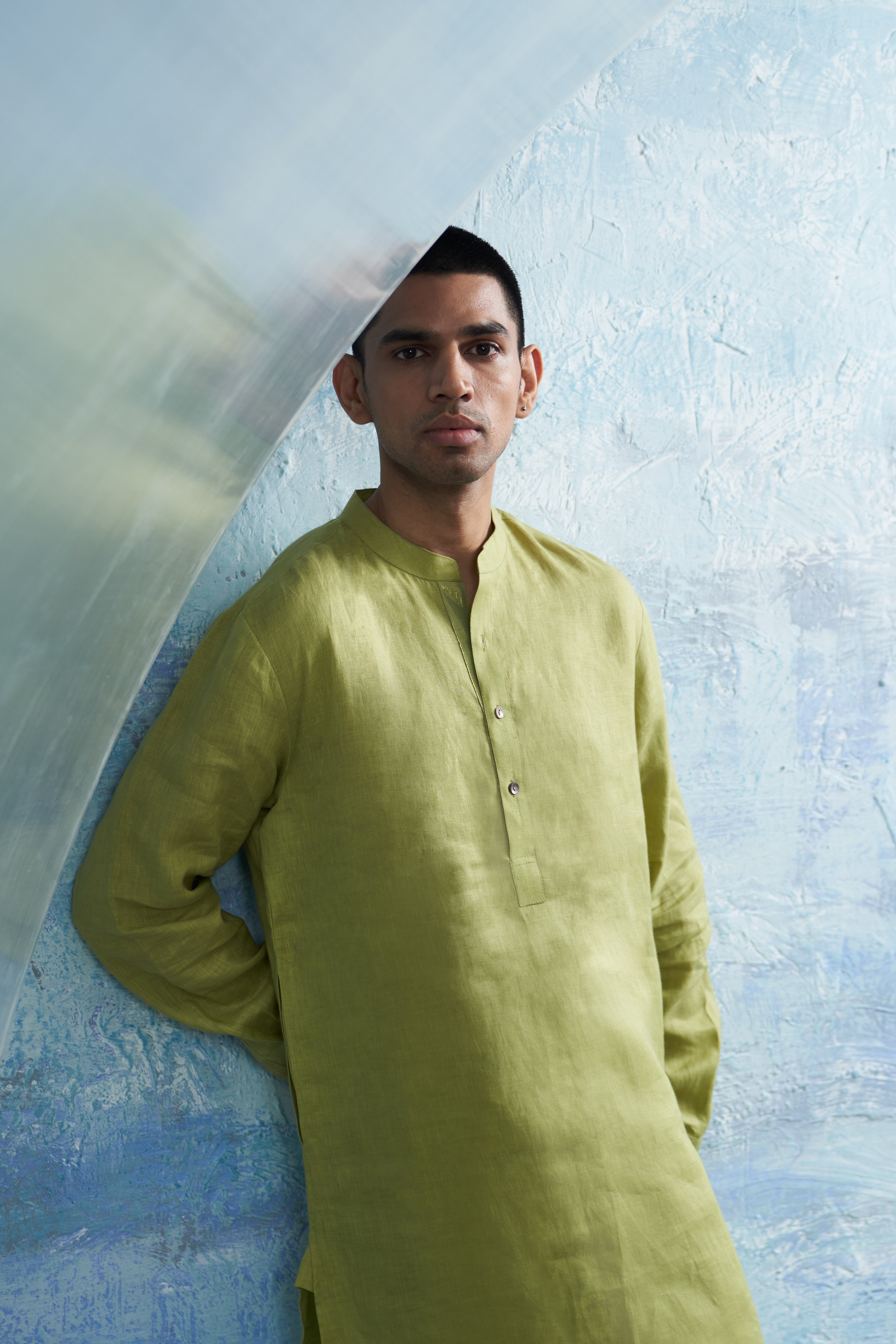 Our classic straight kurta in sheen green linen, a signature piece from our Aura collection. This exquisite kurta features a subtle touch of shimmer on the placket and cuffs, adding a hint of glamour to its timeless design. Paired with cotton satin salwar for a classic look, it can also be effortlessly styled with straight pants for an endearing ensemble.