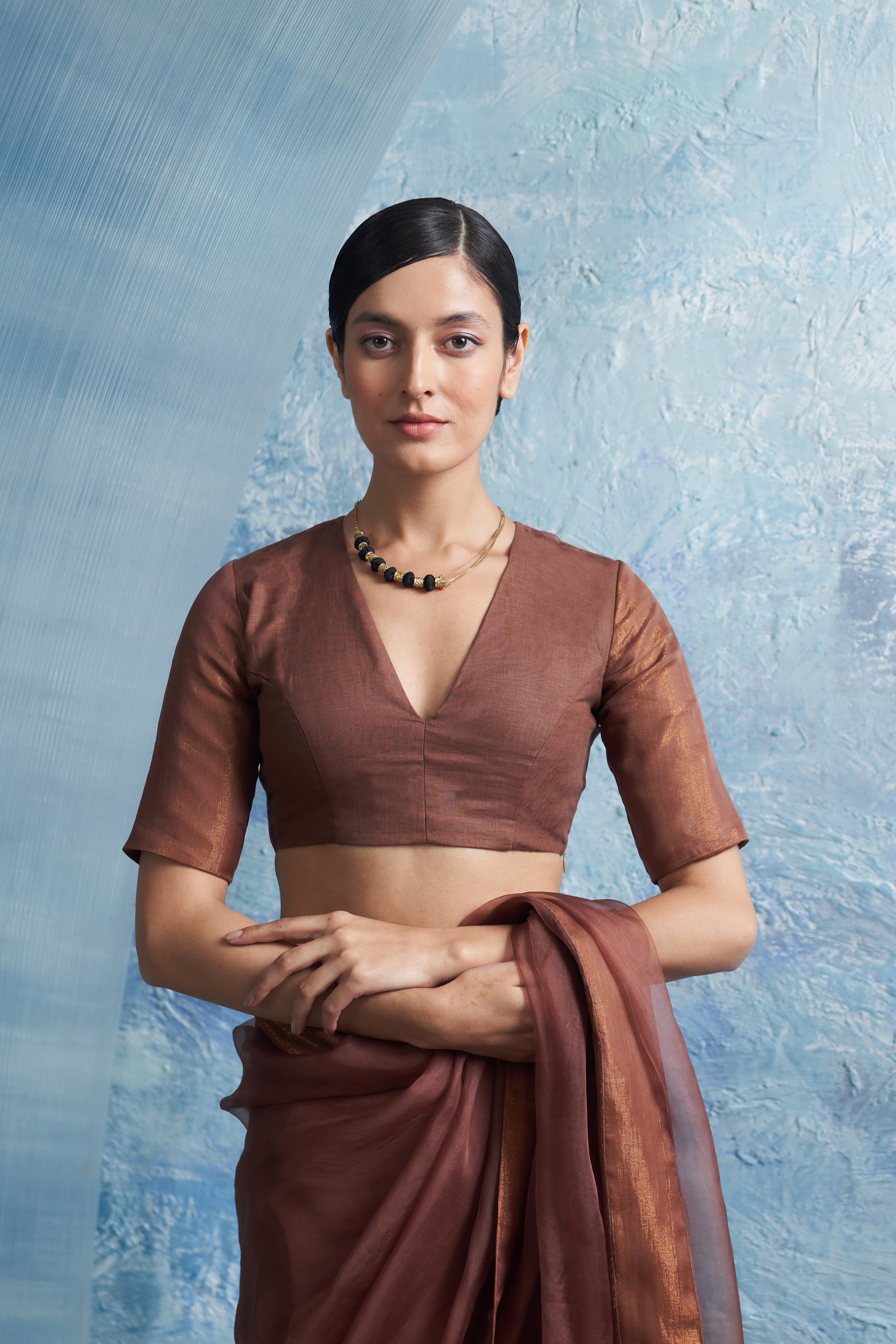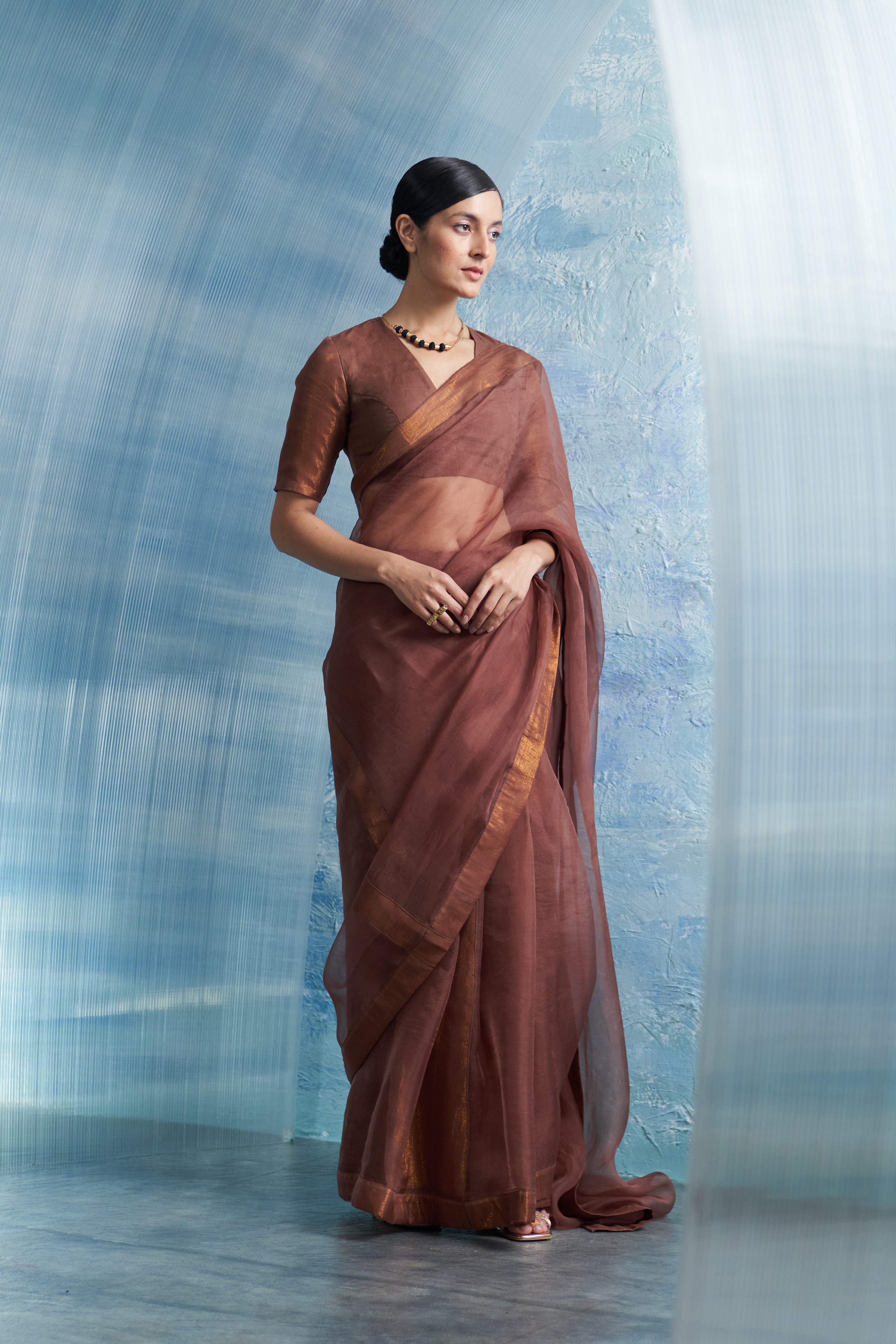 Aura Woody Brown Saree With-Sleeve Blouse