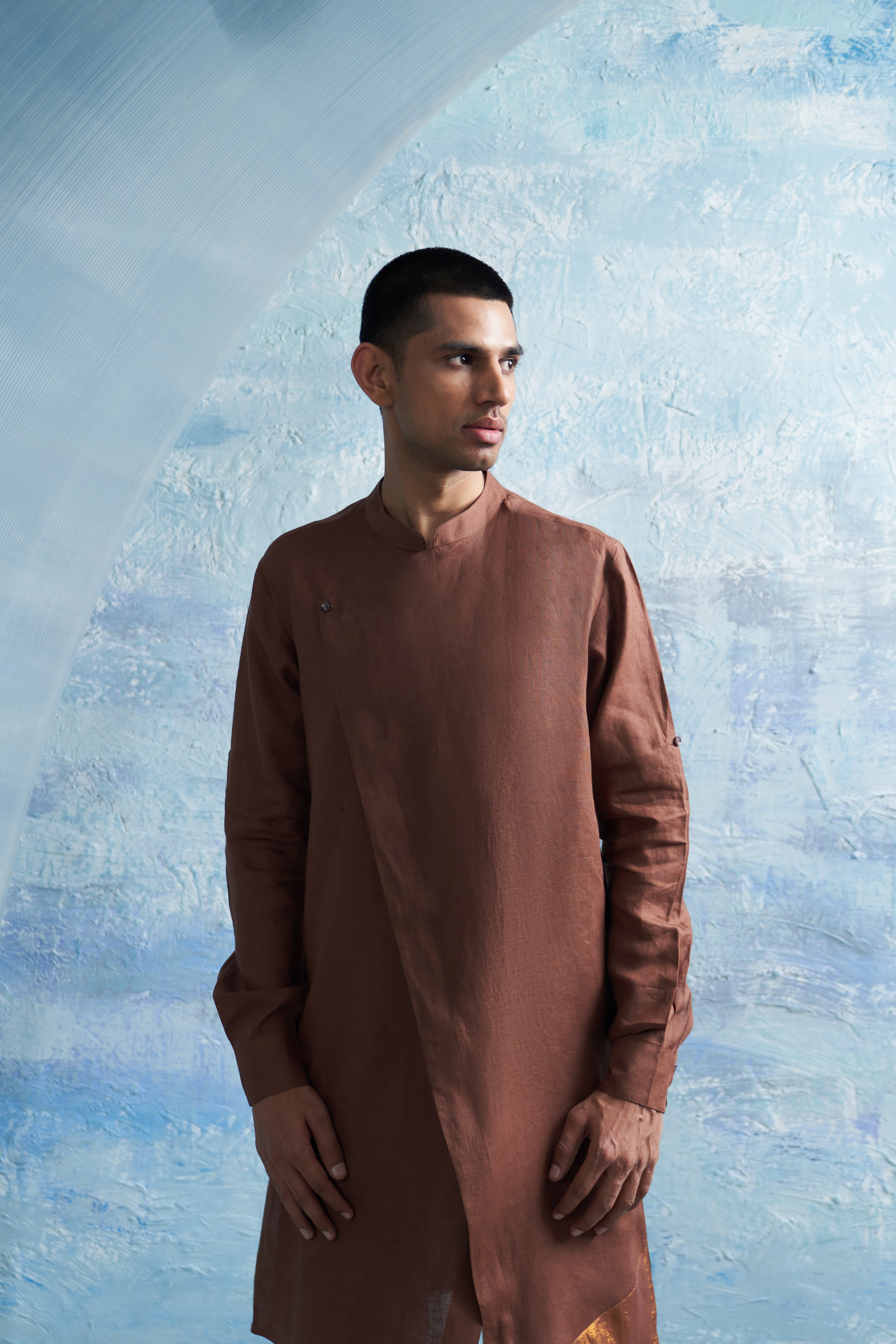 Discover our contemporary take on the timeless kurta, featuring slant overlapping front panels for a modern edge. Presented in a new hue of woody brown, this statement color sets the tone for the season. With a subtle shimmer diagonal patch at one end, this ensemble exudes sophistication and charm, perfect for making a bold statement. Paired with classic straight cotton pants, this set offers a harmonious blend of tradition and innovation.