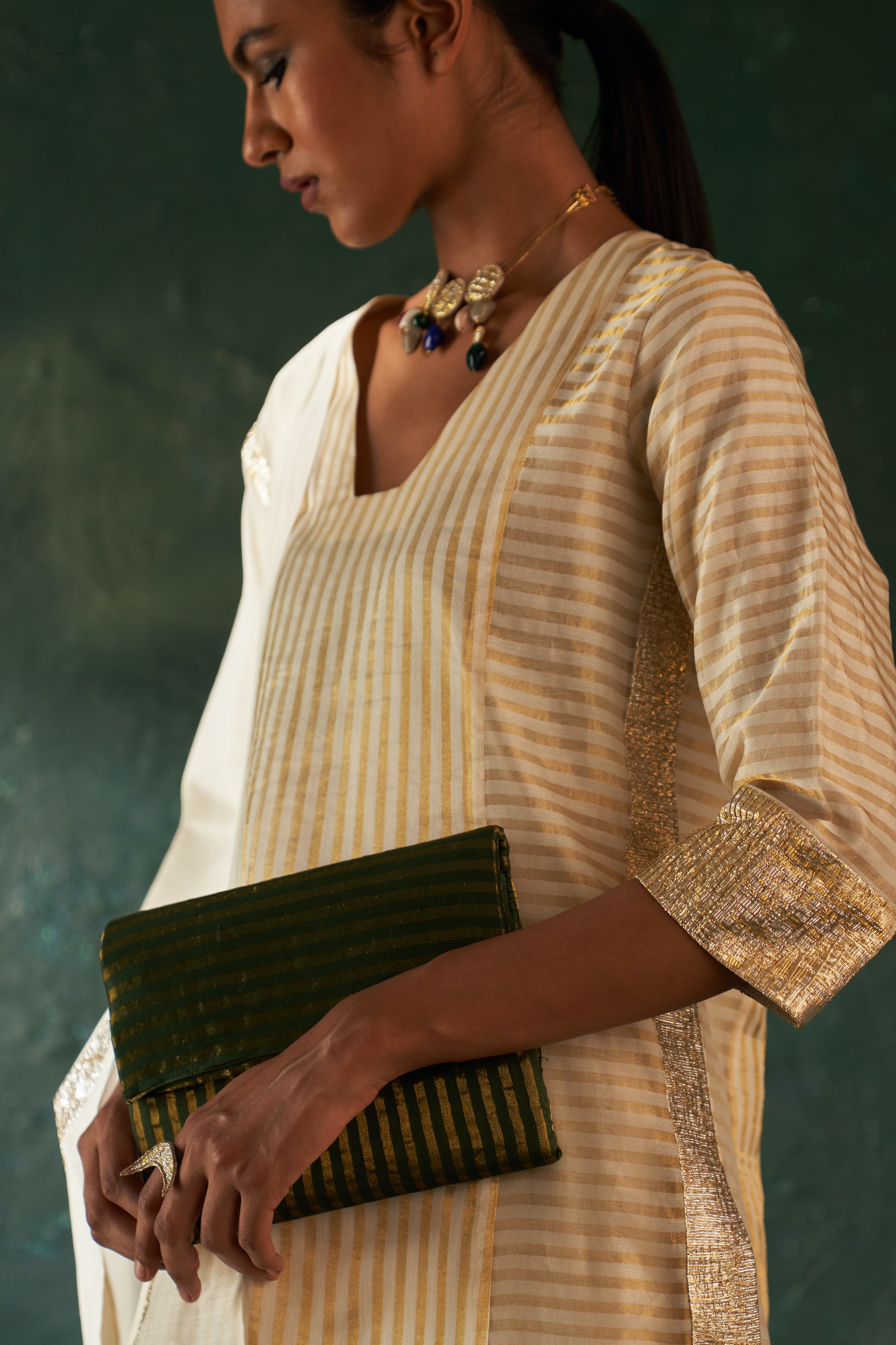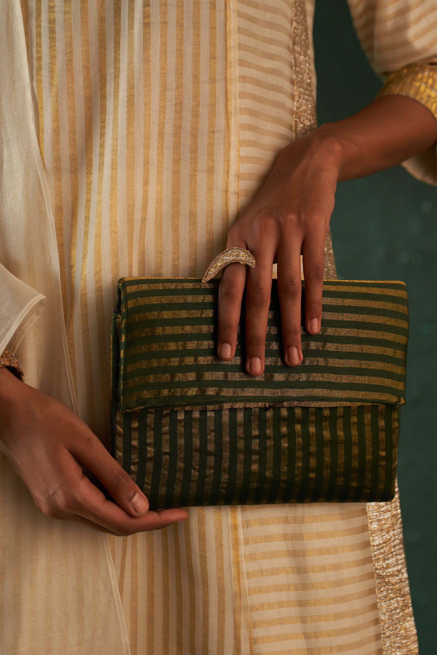 This classic hand clutch is designed with a deep green stripe tissue, providing the perfect elegant accompaniment to any ensemble. Its versatility allows it to effortlessly complement any look or occasion.