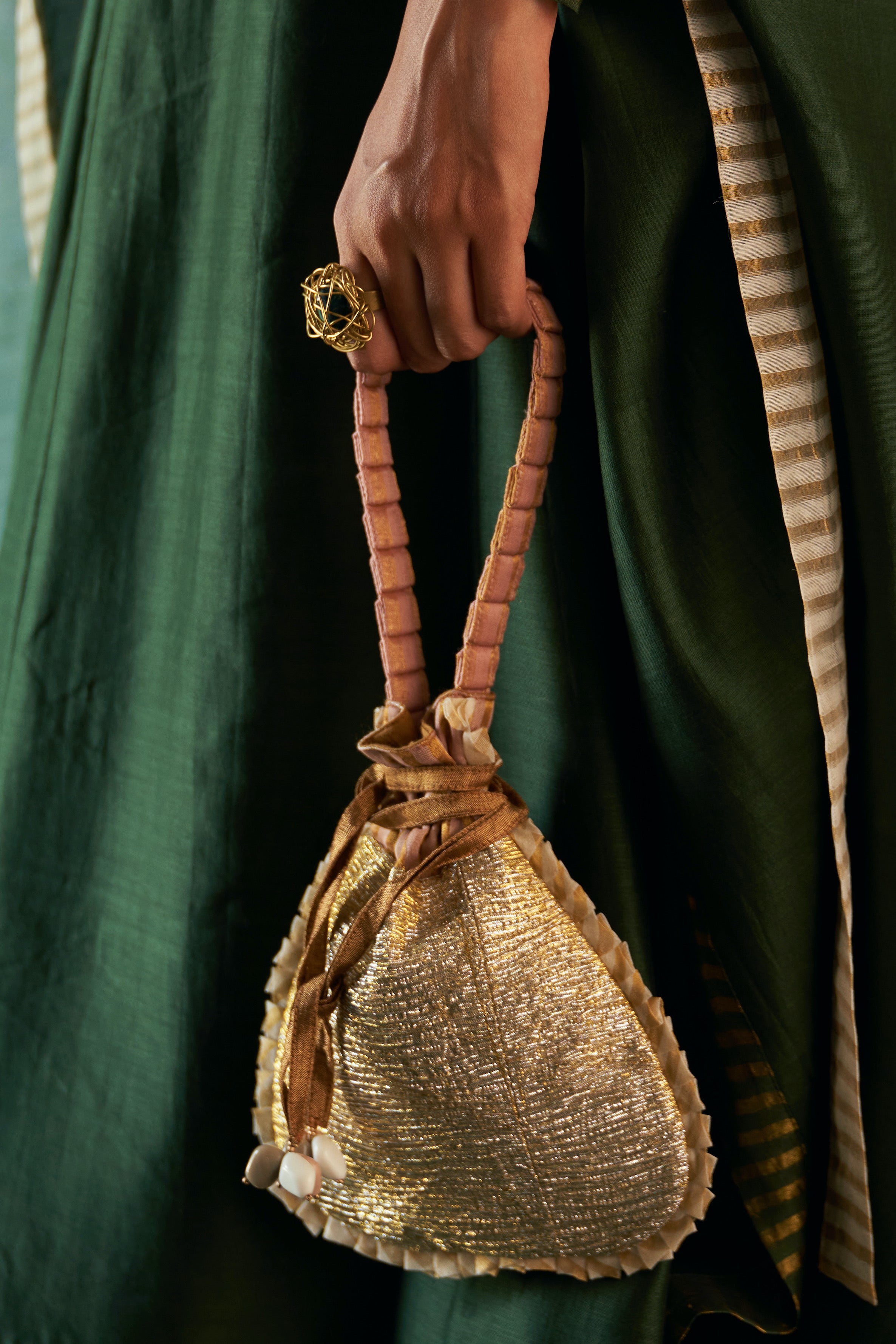 Glittery potli has a glitter of gota all over. Comes with a pleated string and shell tassels. Carry it as per your mood and occasion with ease to complement your outfits. Designed with intricate details to add a sparkle to your style, this unique potli will make you feel like a modern day royalty.