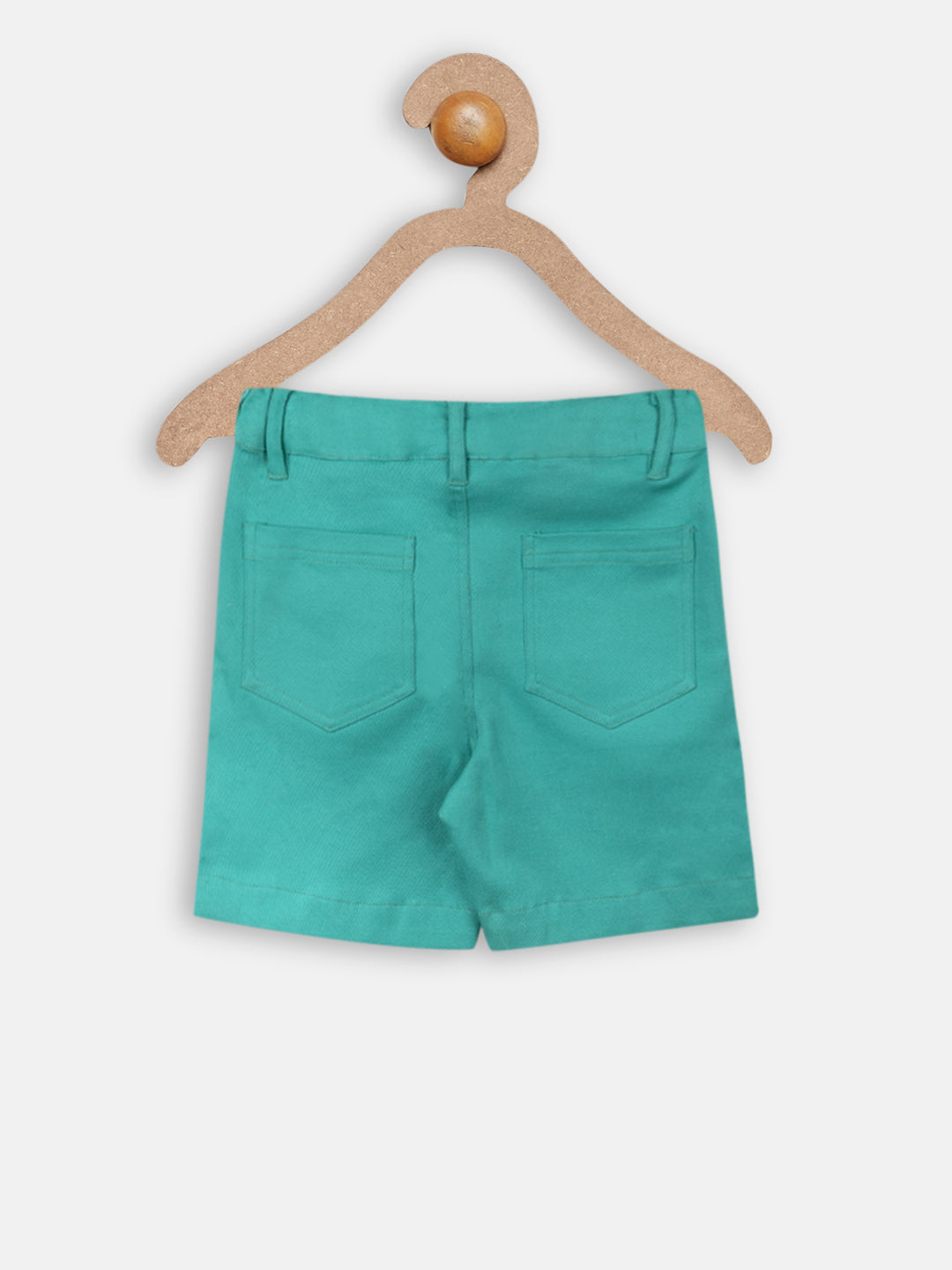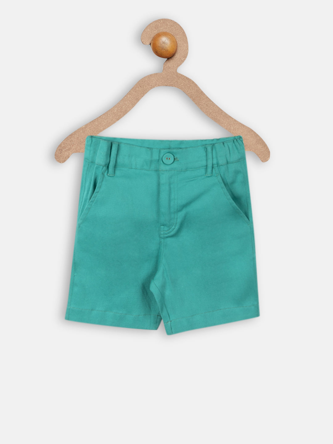 A pair of green shorts, a fly with button closure, partially elasticated waistband with belt loops