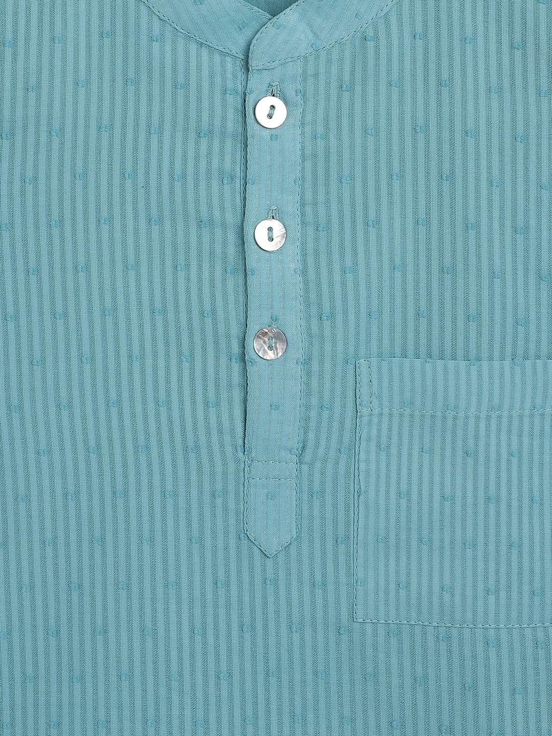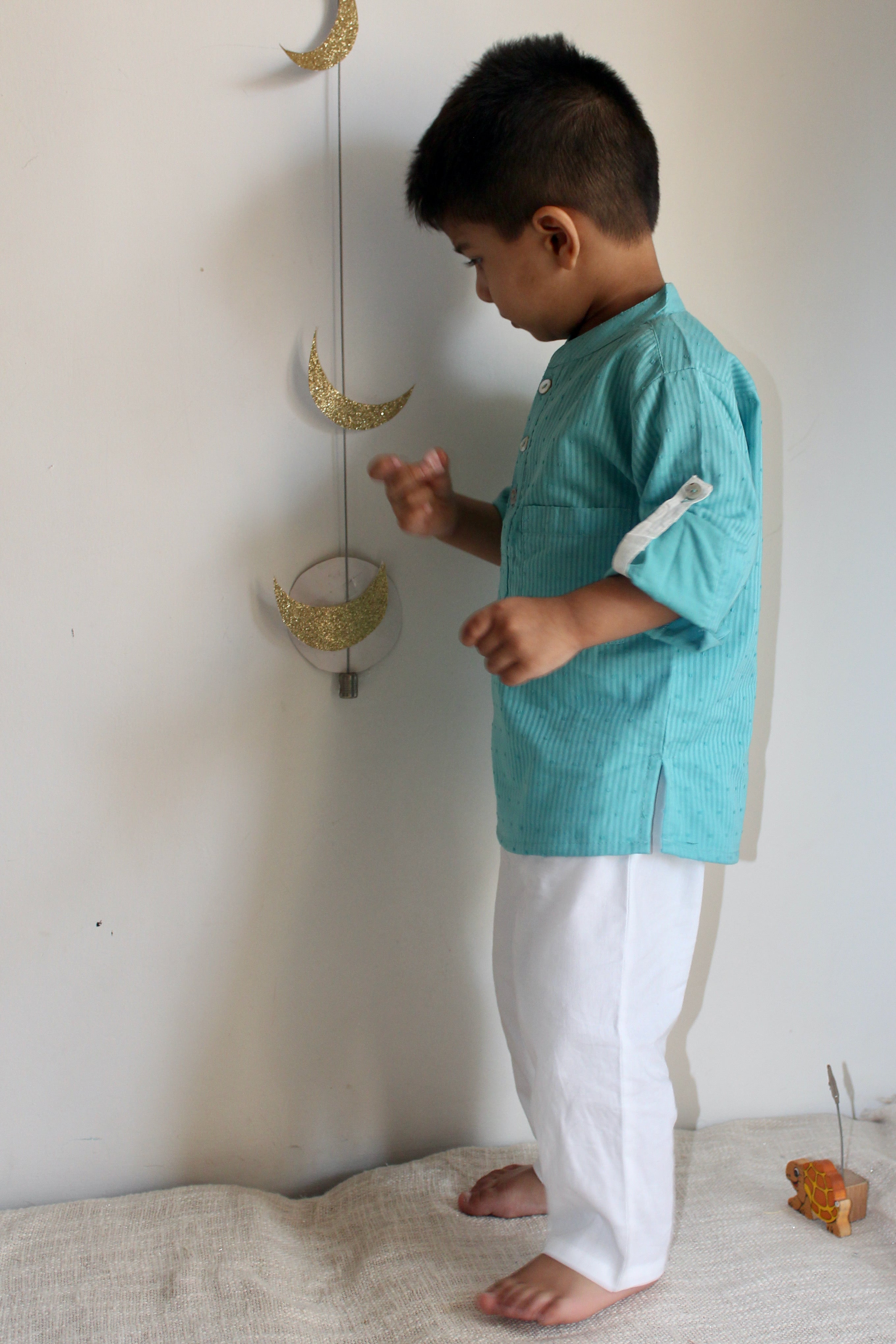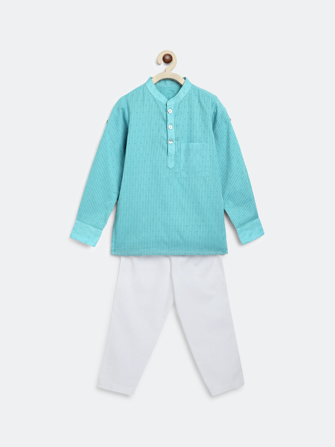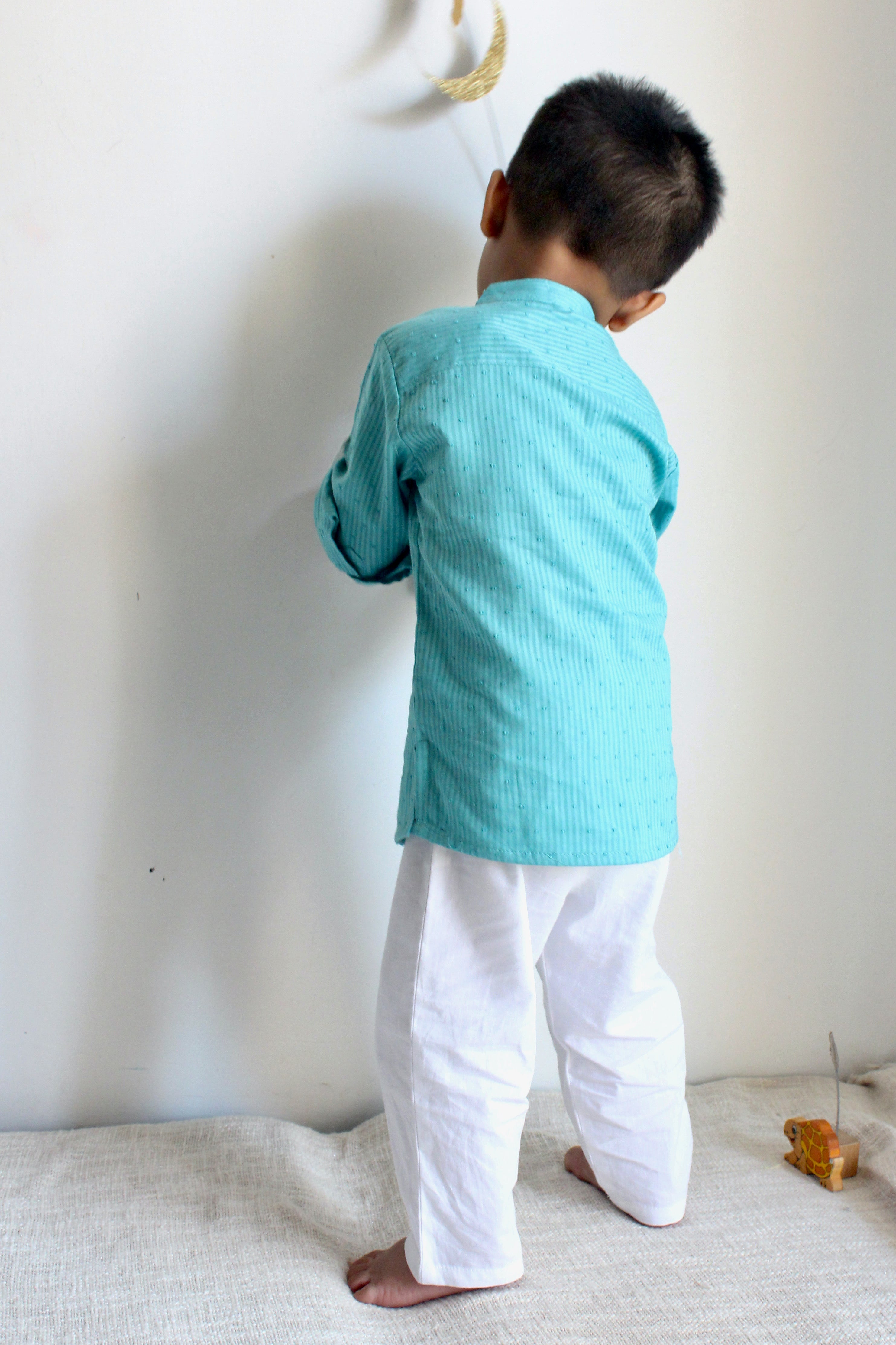 Your little boy will look fantastic and neat in this Cotton Tropical Blue Kurta Set! Ideal for any jovial occasion, the soft dobby cotton Kurta with roll up sleeves and a contarst color lapel comes with white elasticated pyjamas for coziness and style. Crimp-free design, so he'll always look super spiffy!