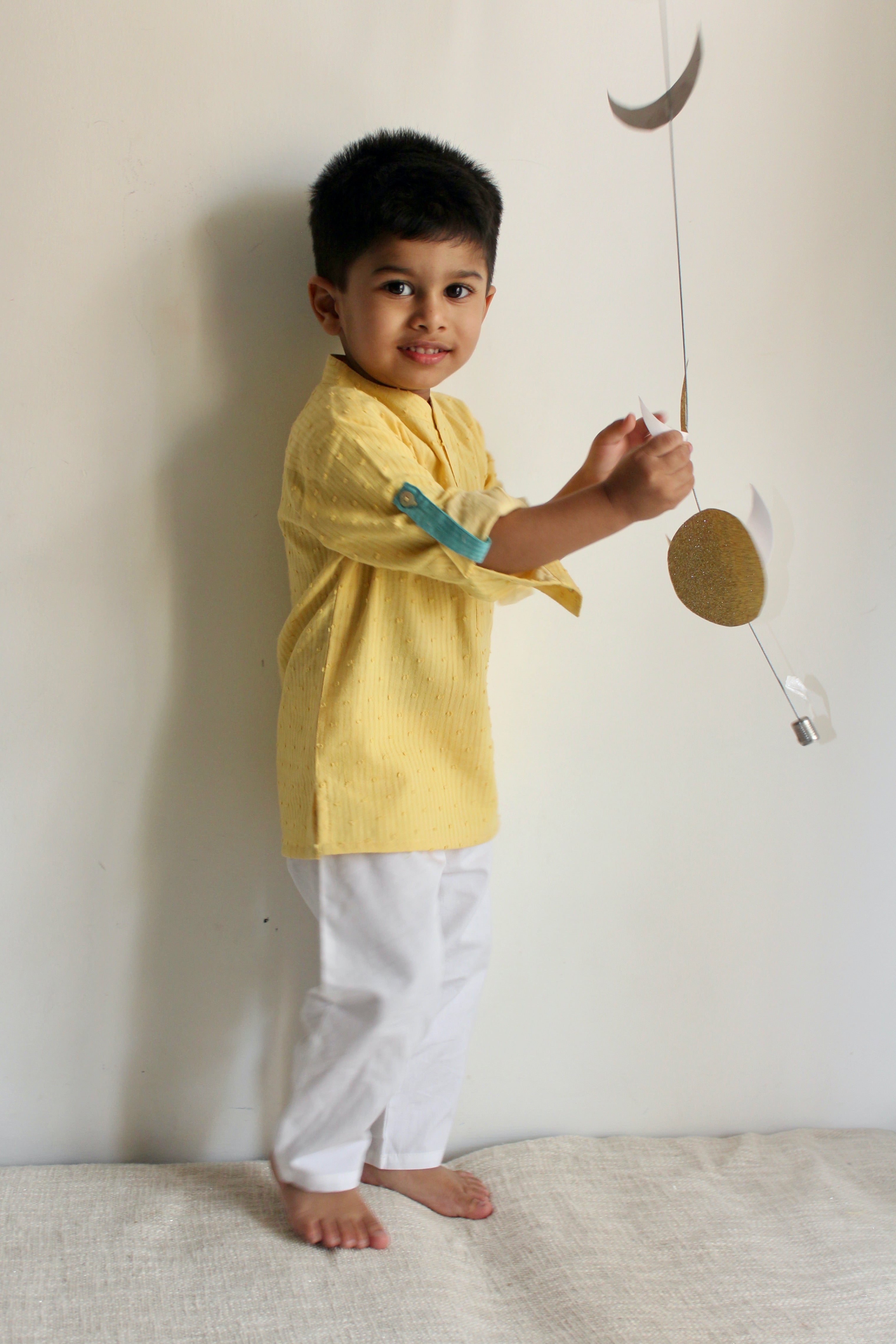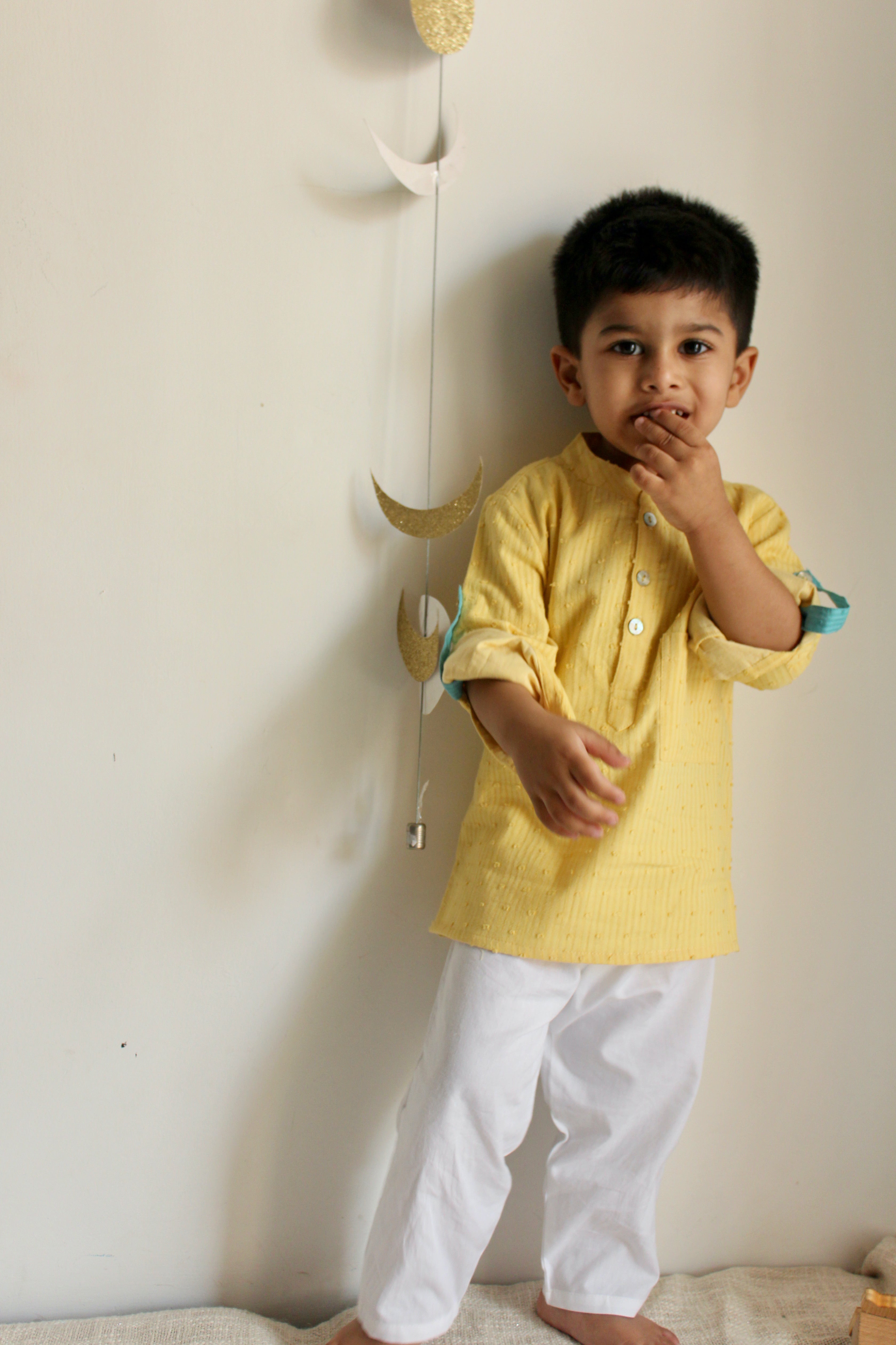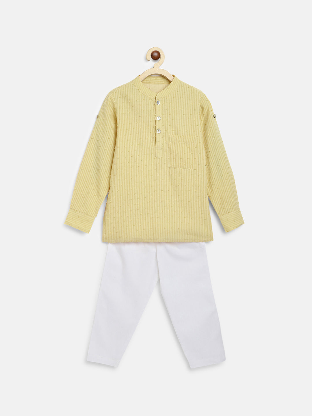 He'll be the jolliest - and neatest - kid around in this super spiffy Cotton Yellow Kurta Set! Perfect for any festive occasions, the soft dobby cotton Kurta with roll-up sleeves and a contrast-color lapel pairs fabulously with the elasticated white pyjamas for all-day comfort and style. No more creases, just smiles!