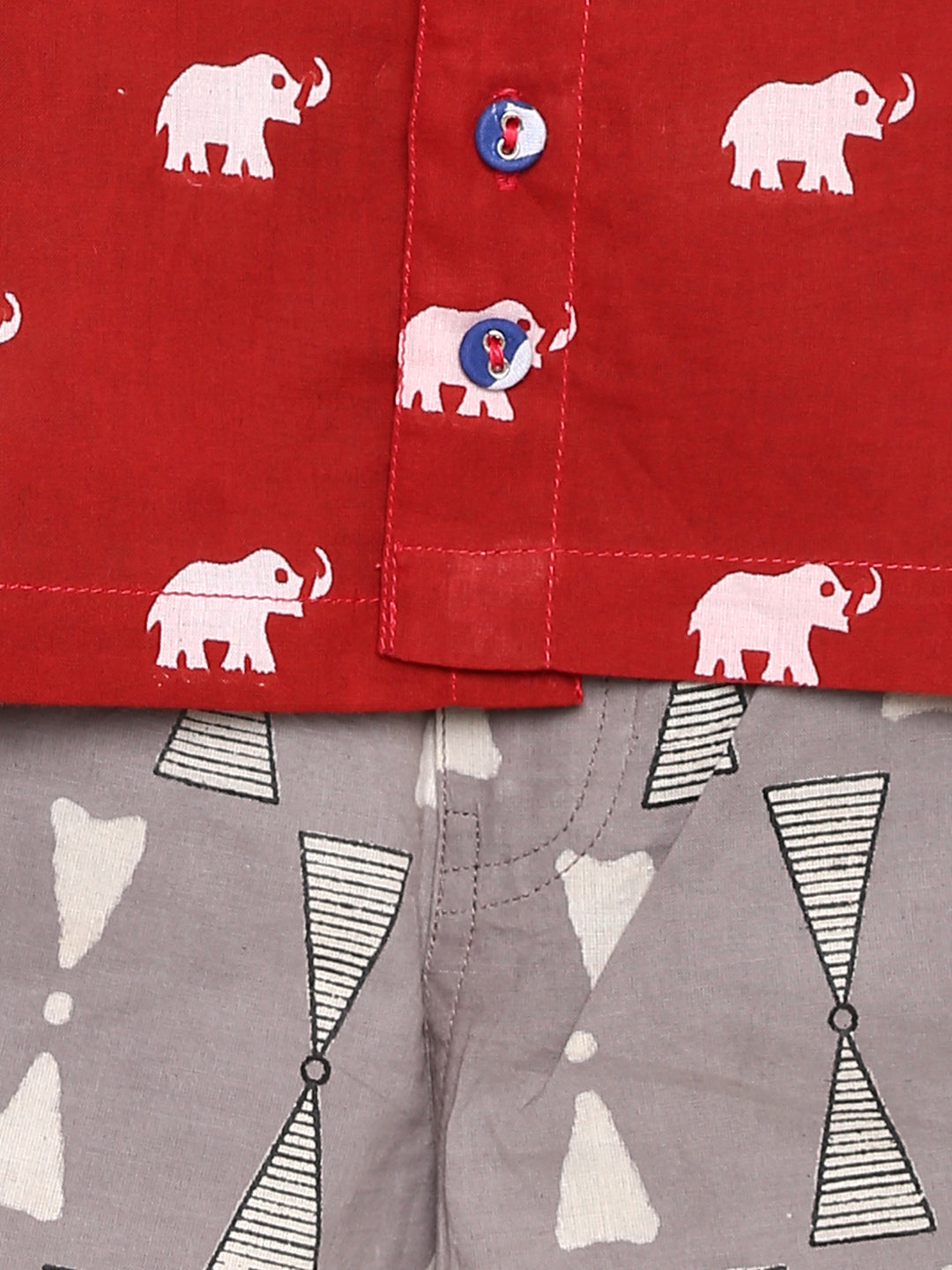 Red elephant printed cotton shirt paired with quirky grey printed shorts. The combination makes for a funky look.