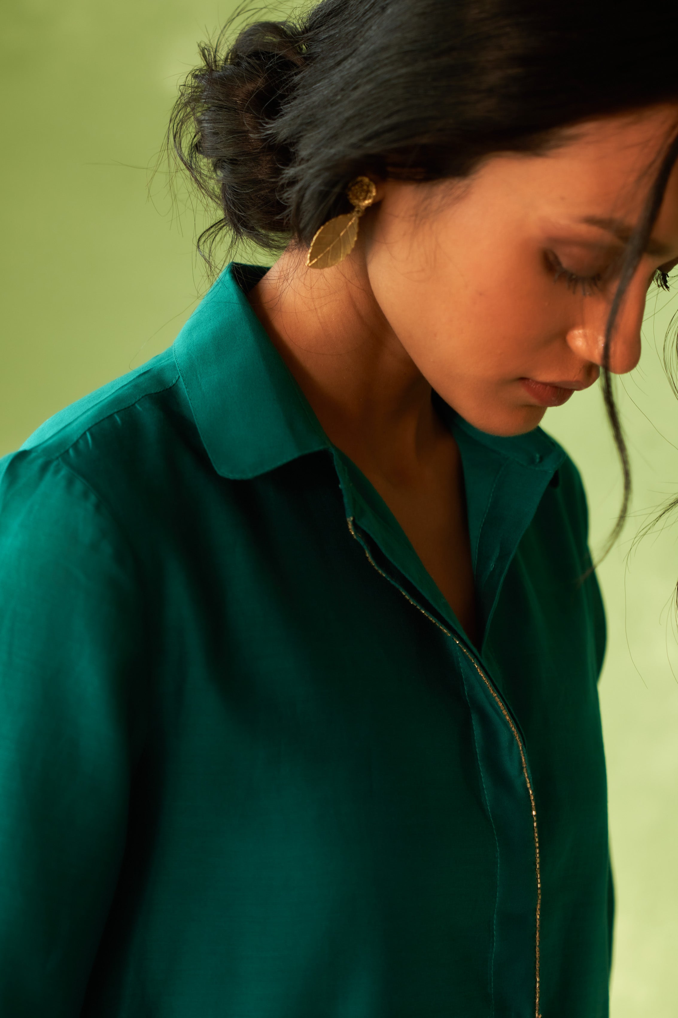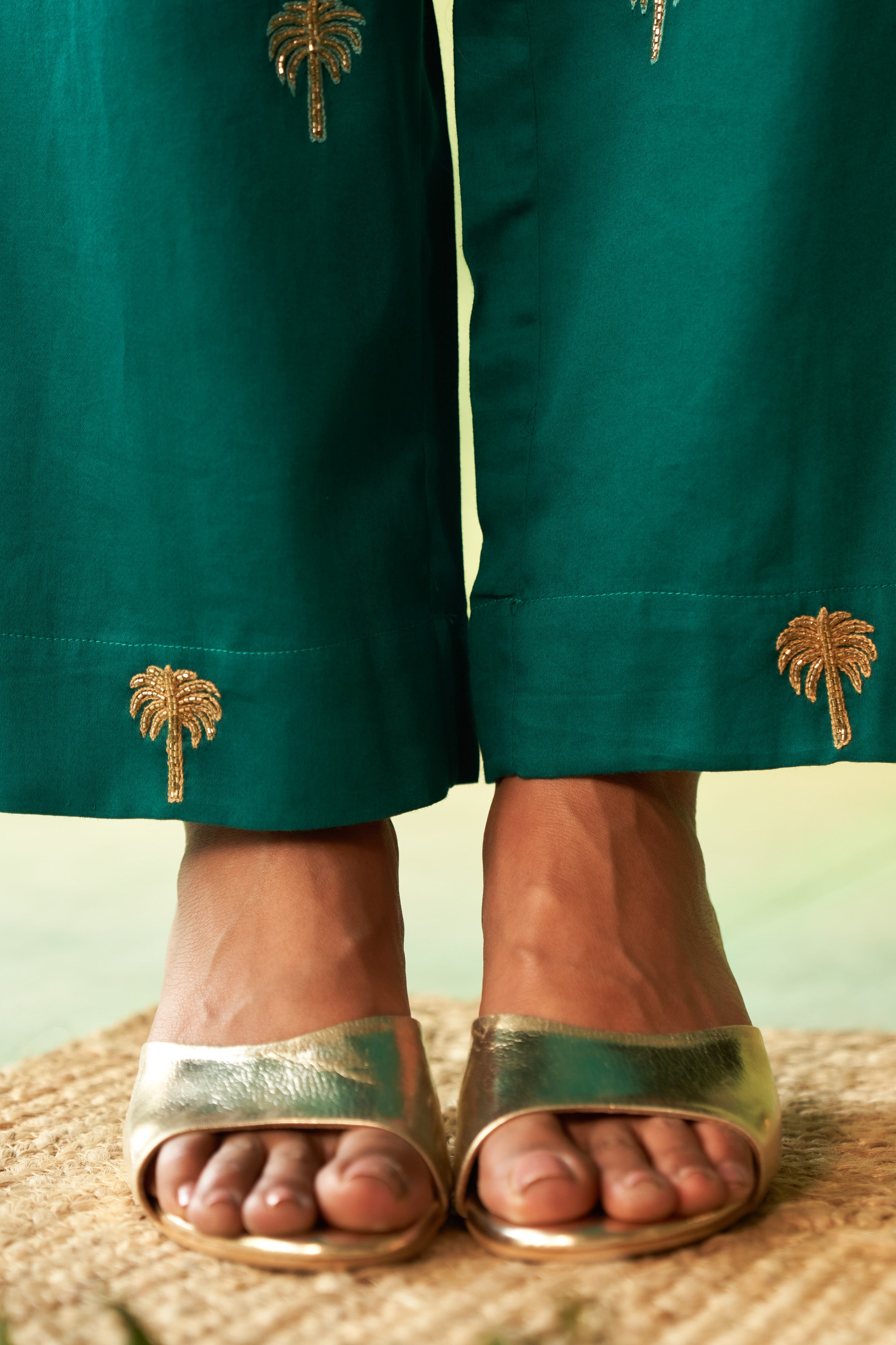 Collared hi-low kurta featuring tall palm tree embroidery on the front and back panels, creating a bold yet balanced statement. The placket is subtly detailed with cut dana work, adding just the right hint of shimmer. Paired with long straight pants adorned with a single palm tree motifs , this set is perfect for understated festive dressing.