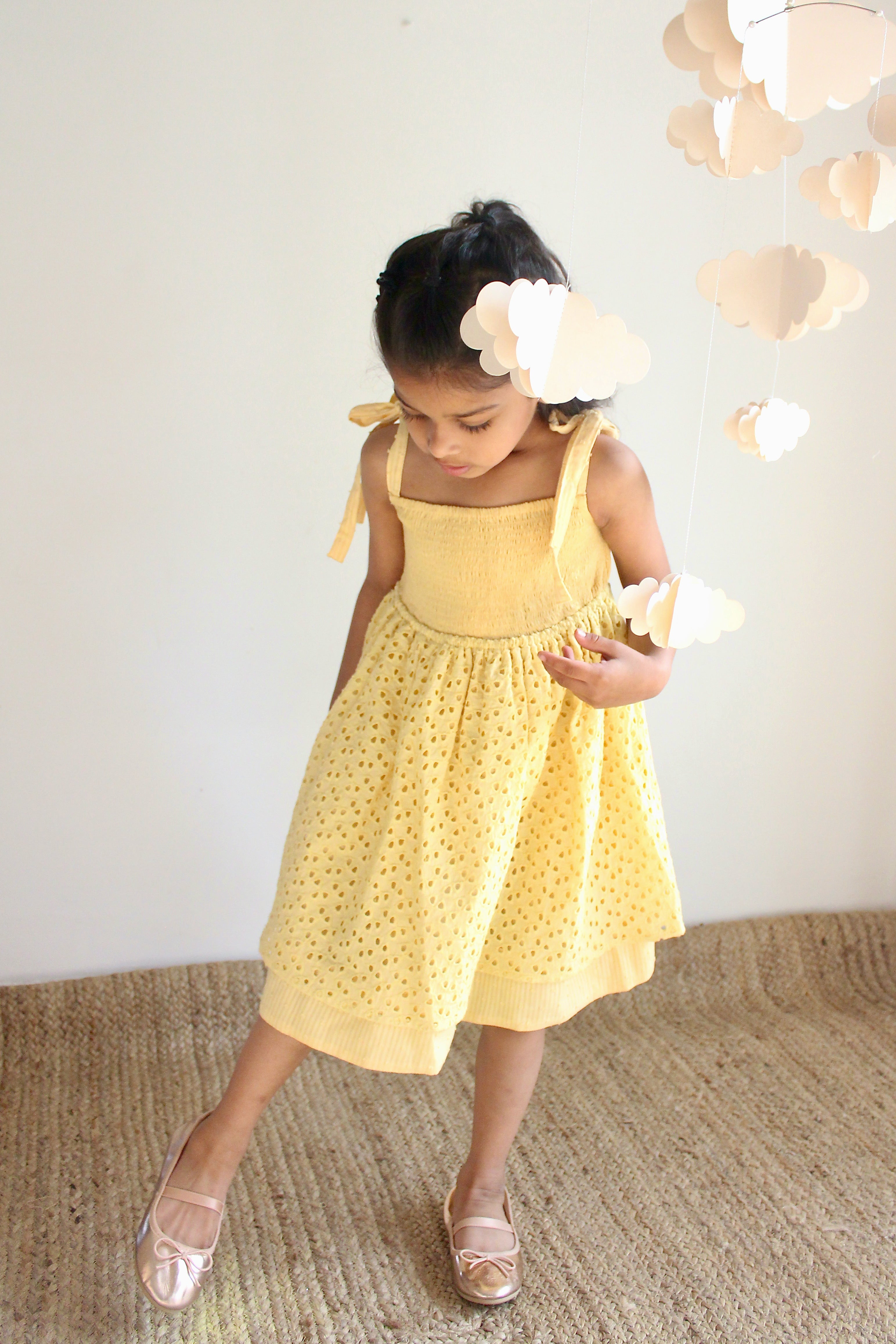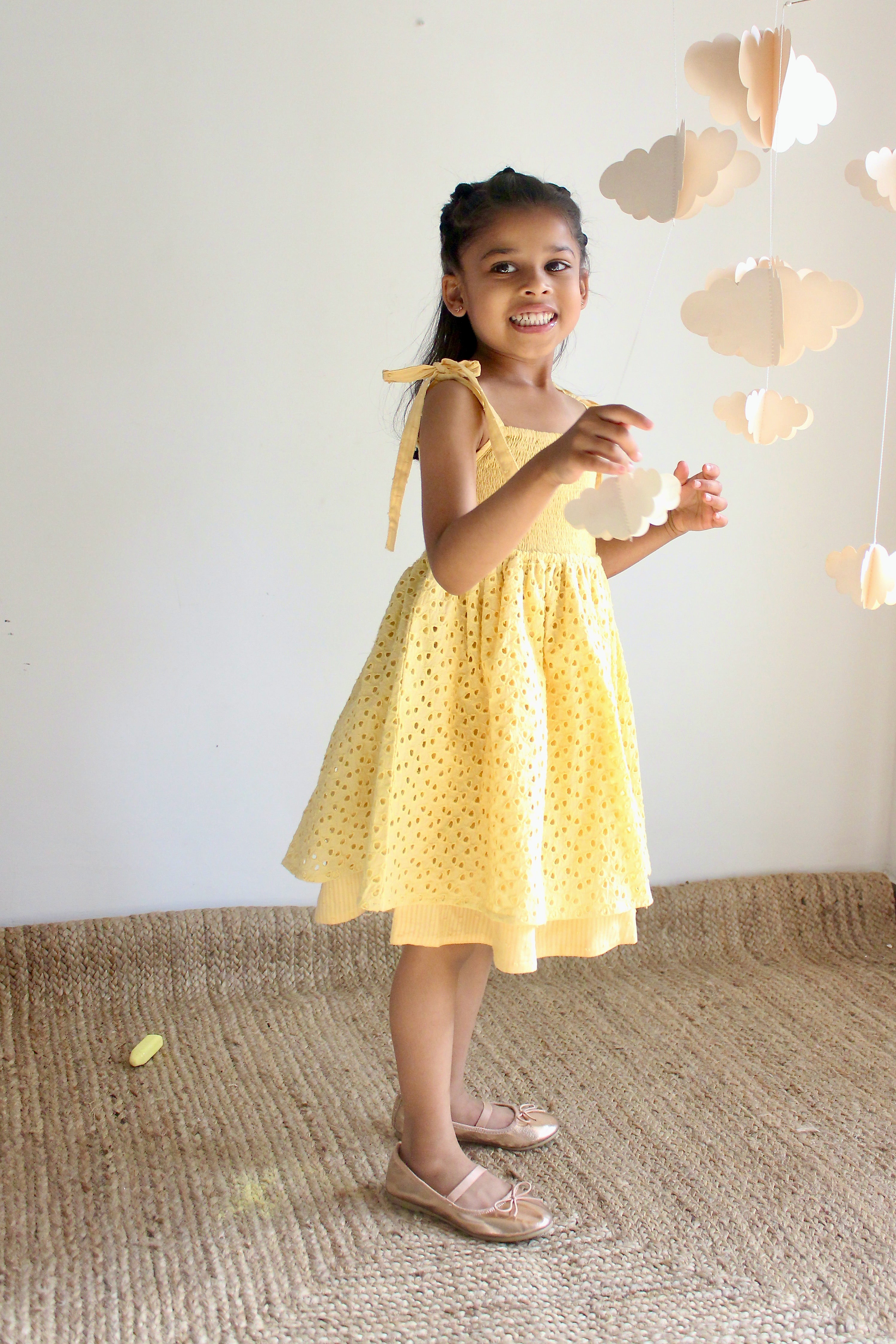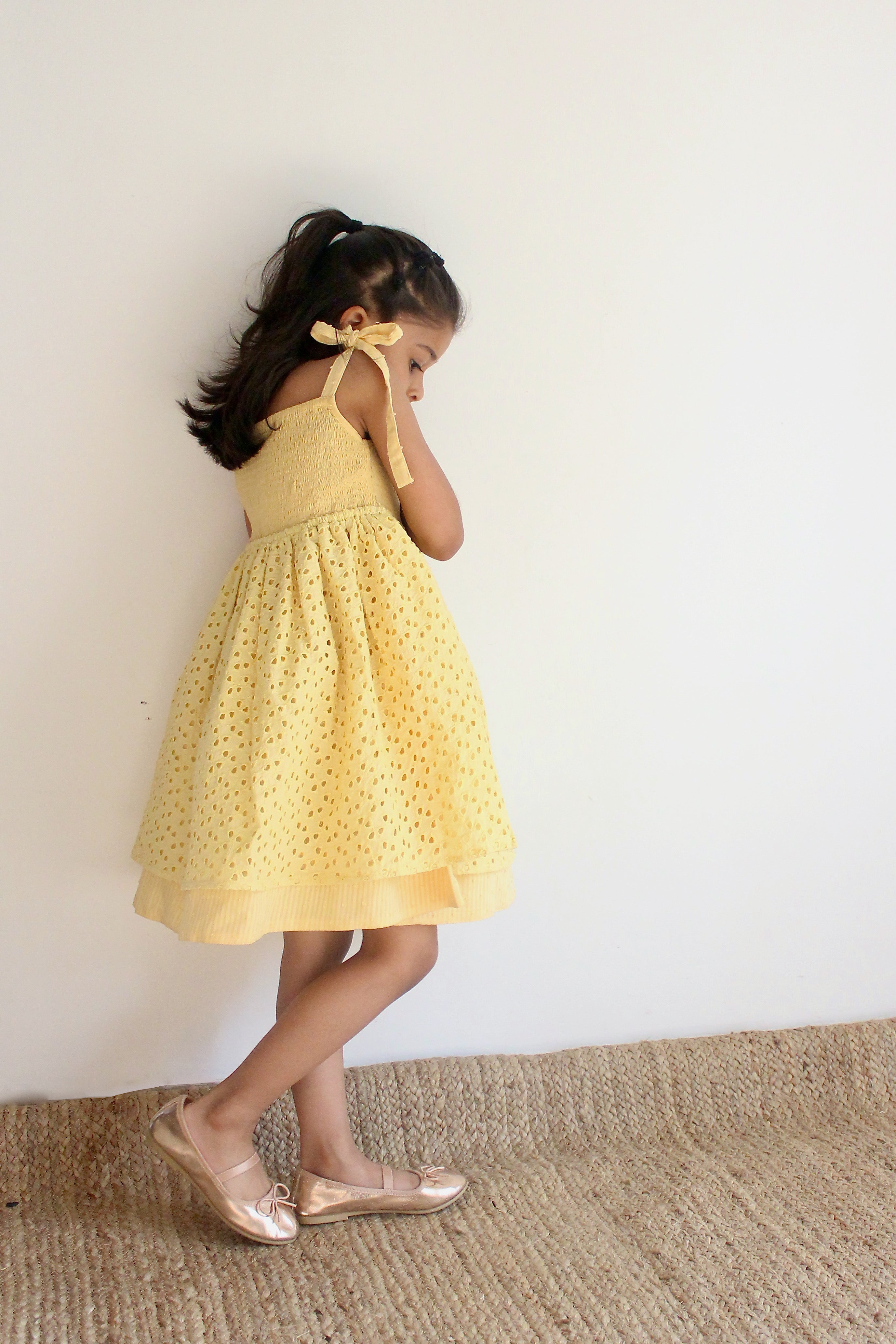 Girls Yellow Tie-up Smocking Dress