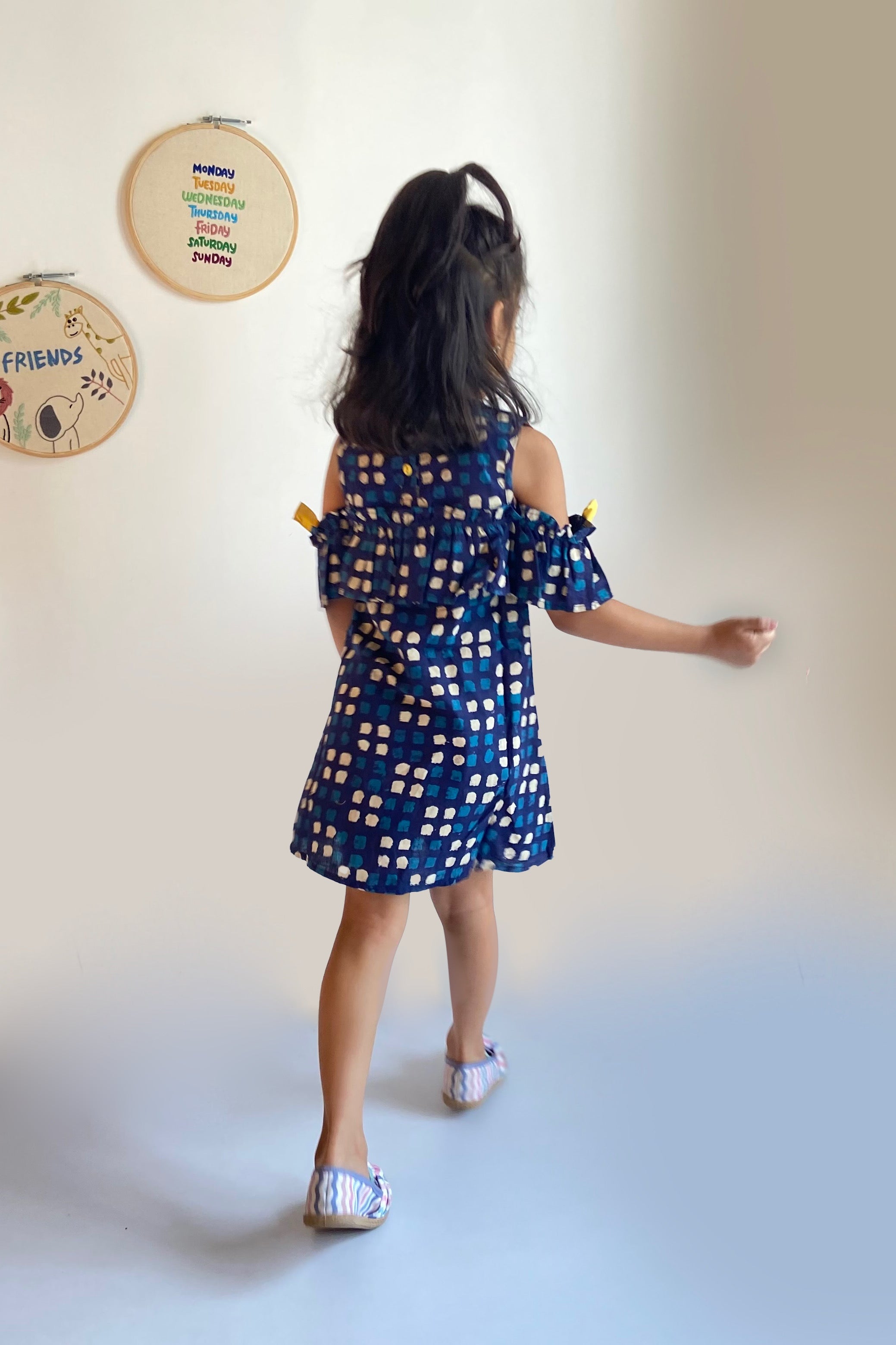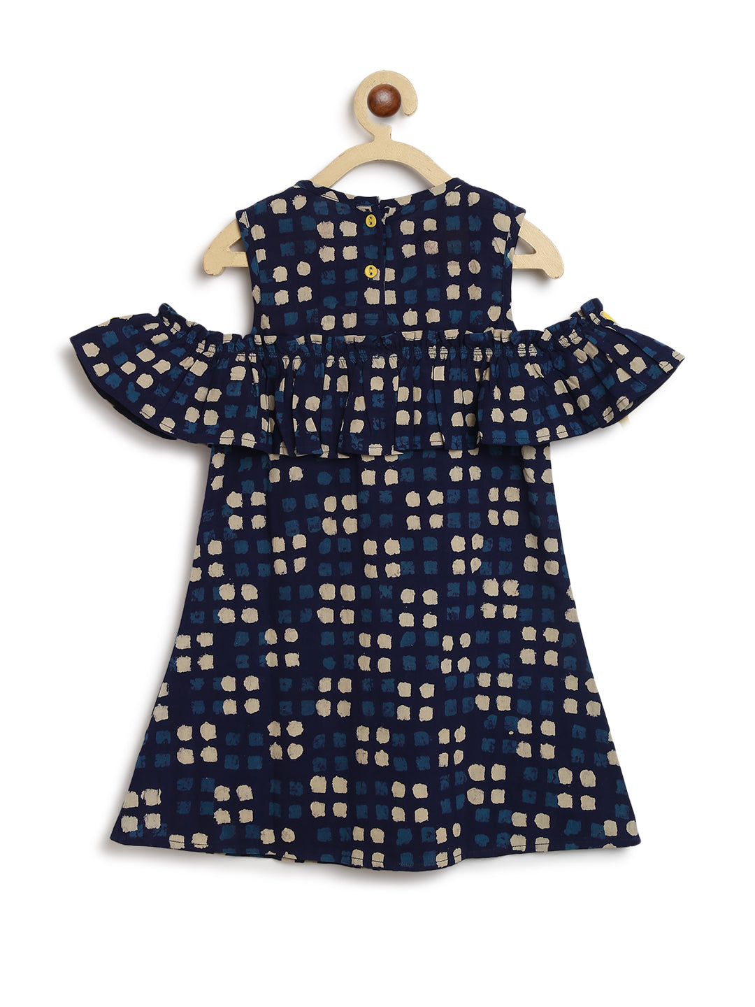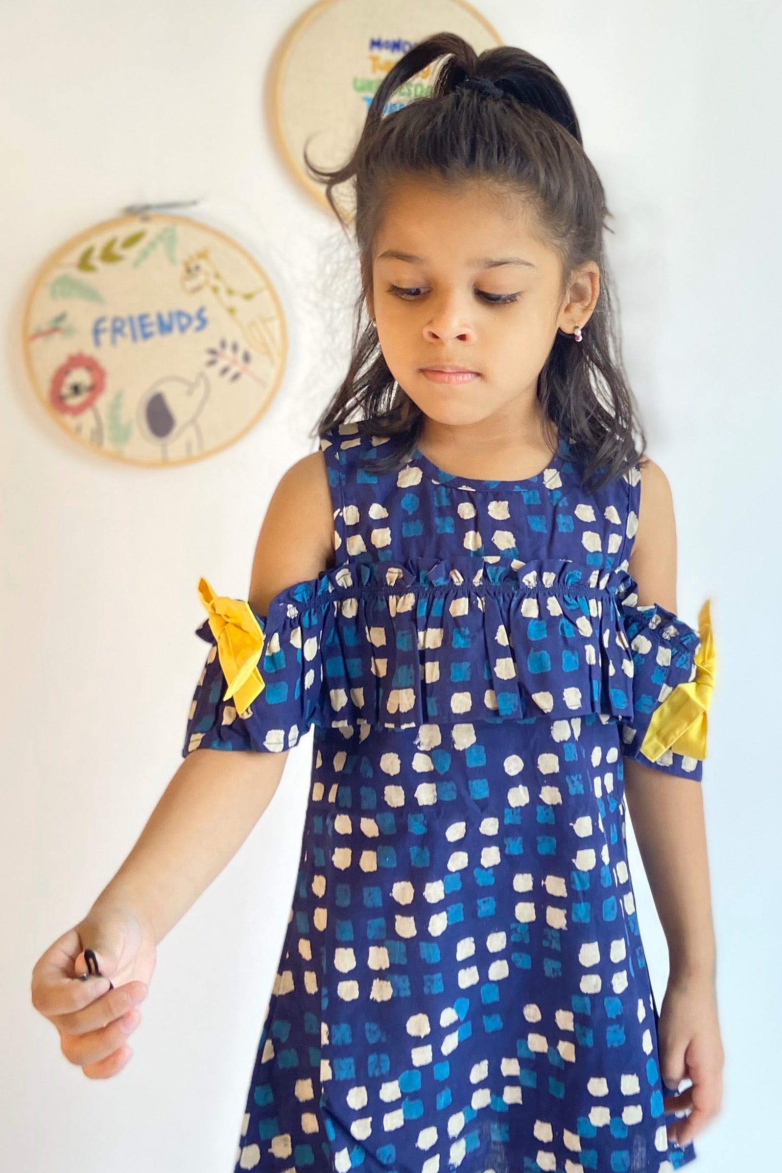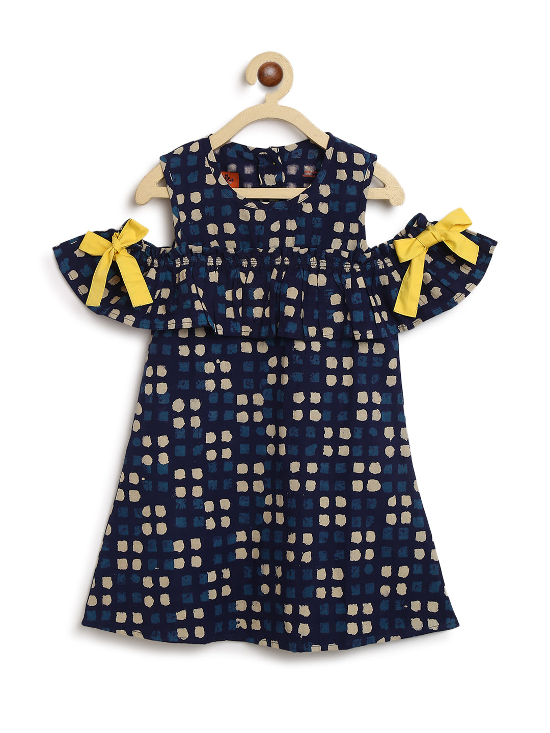 Spunky ruffled cold shoulder dress with contrast bows on sleeves just perfect for your little princess.