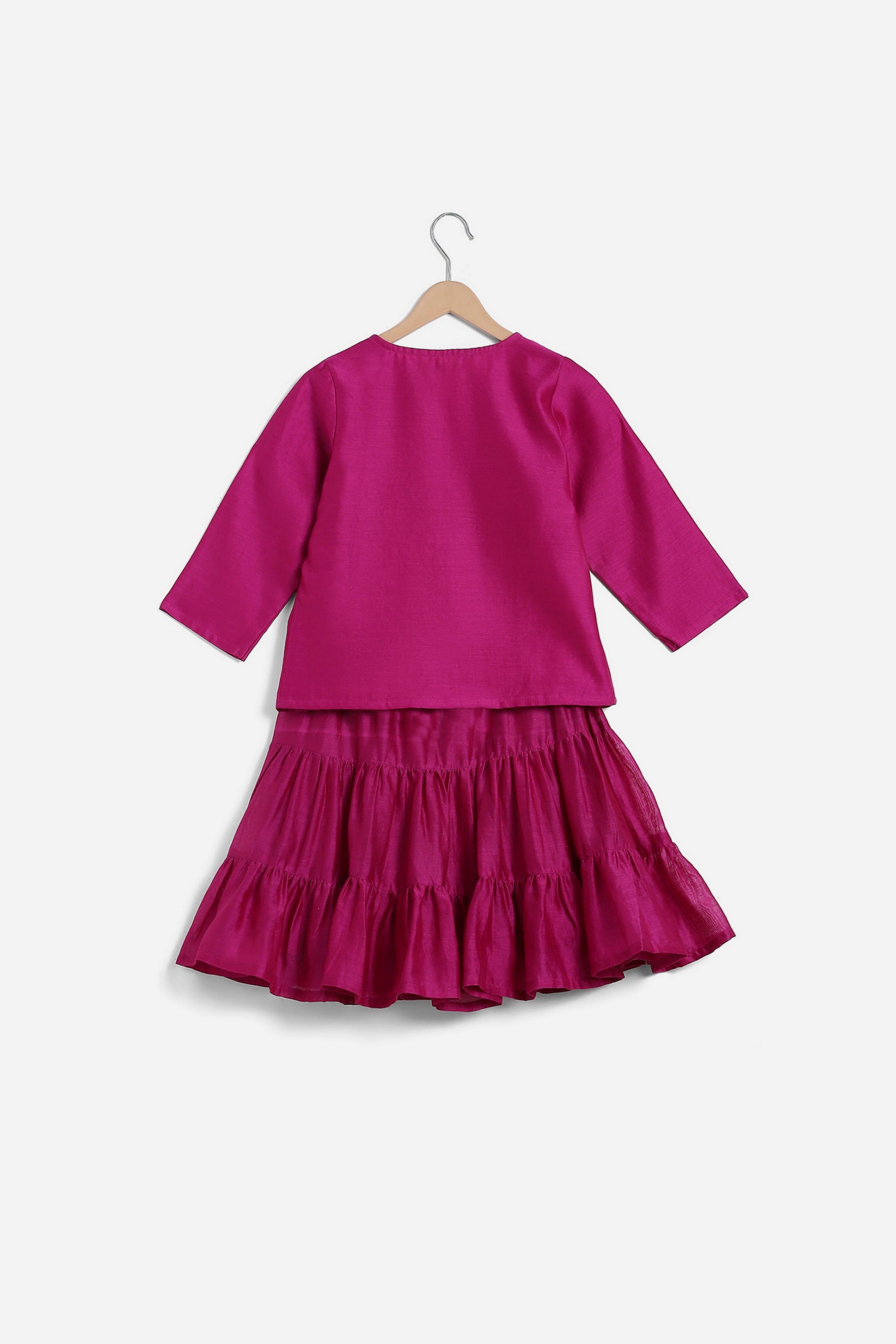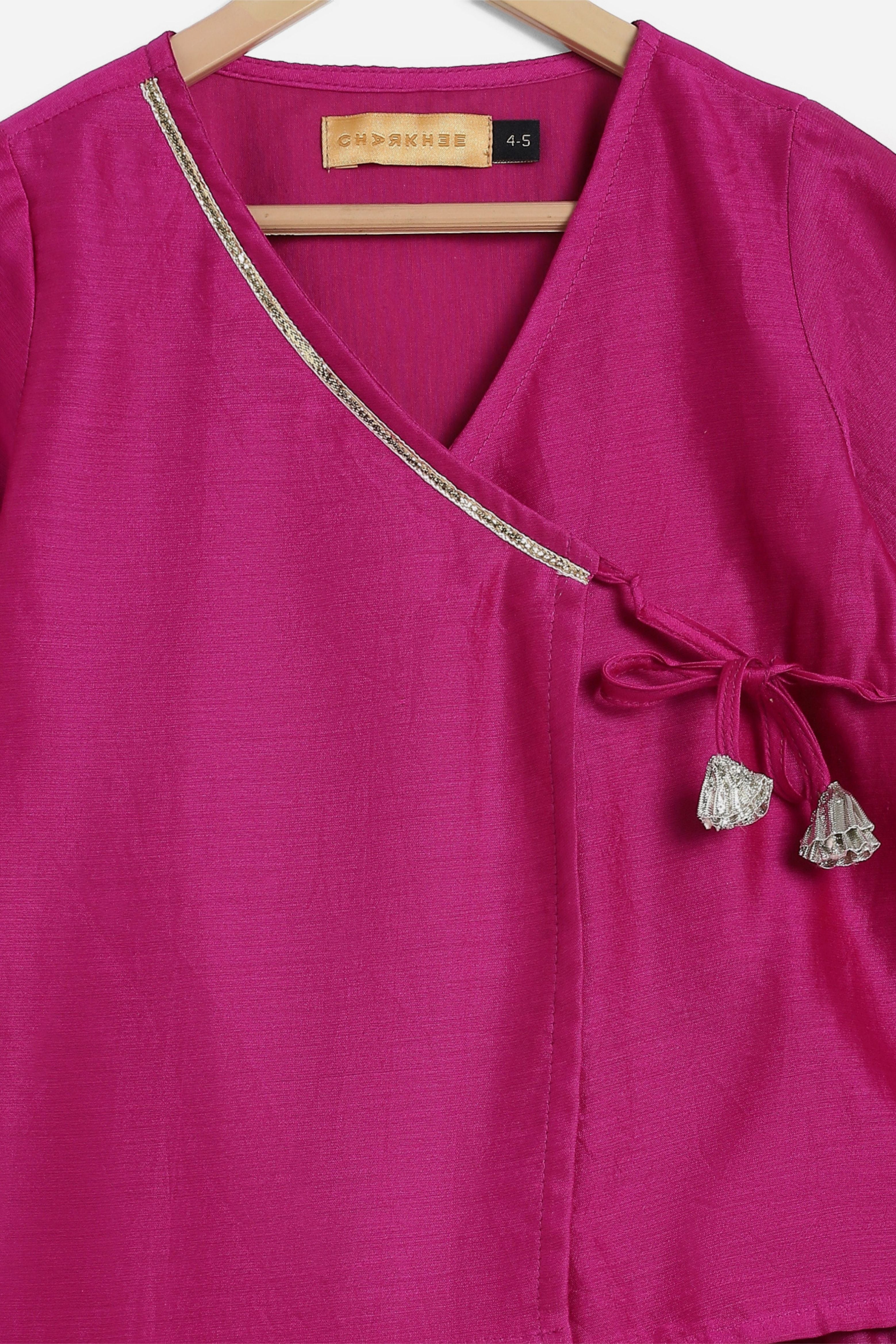 This Chanderi Angrakha Style Lehenga for girls showcases elegant lace details that enhance its sophisticated charm. The set features a classic tie-up Angrakha top paired with a graceful tiered short skirt, blending traditional craftsmanship with contemporary design. Perfect for special occasions, it offers comfort and style in one exquisite ensemble.