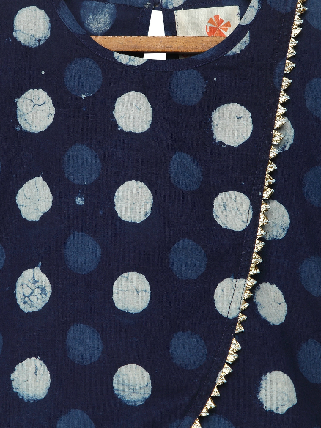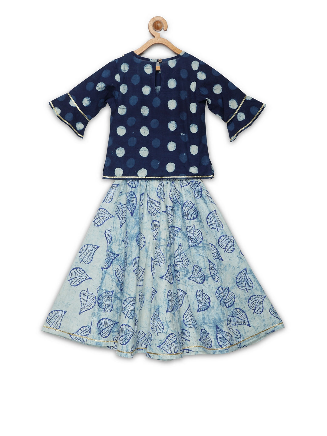 block printed lehenga set with gota work. Bell sleeves and front flap gives a contemporary cute look.