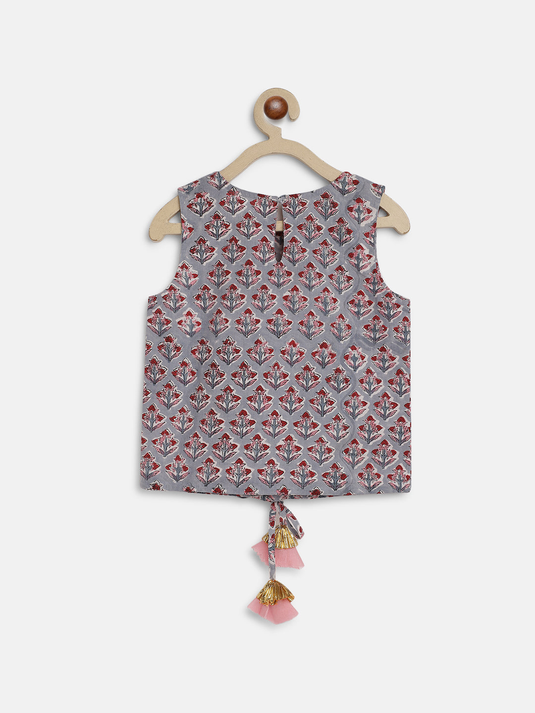 This Girls' Cotton Block Print Tie-Up Lehenga Set is a must-have for your lil' fashionista. She'll love the sleeveless tie-up top with its round neckline and button fastening at the back, paired with a fun tier skirt. Perfect for twirling, dancing and dreaming! Ready, set, blast off into style!