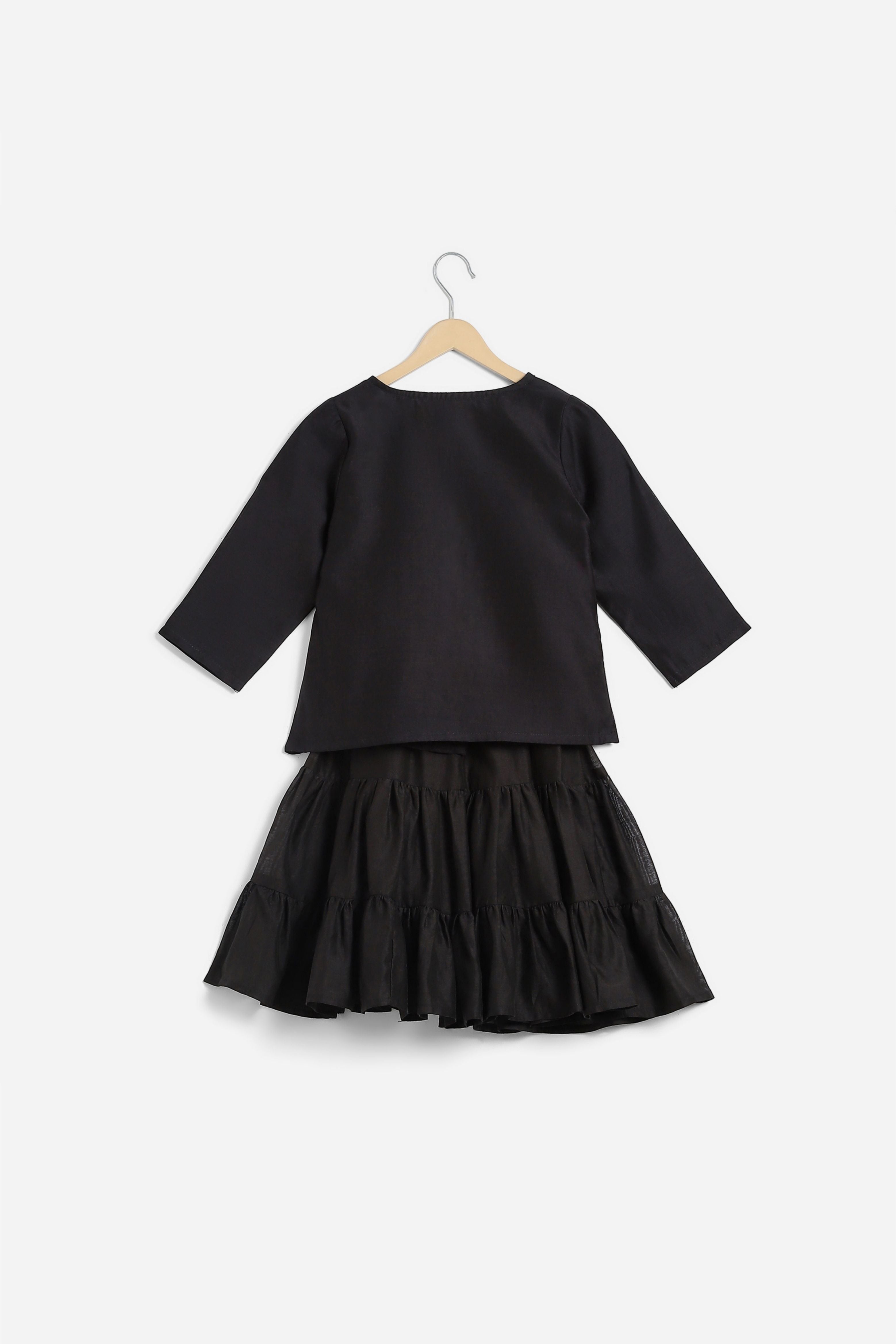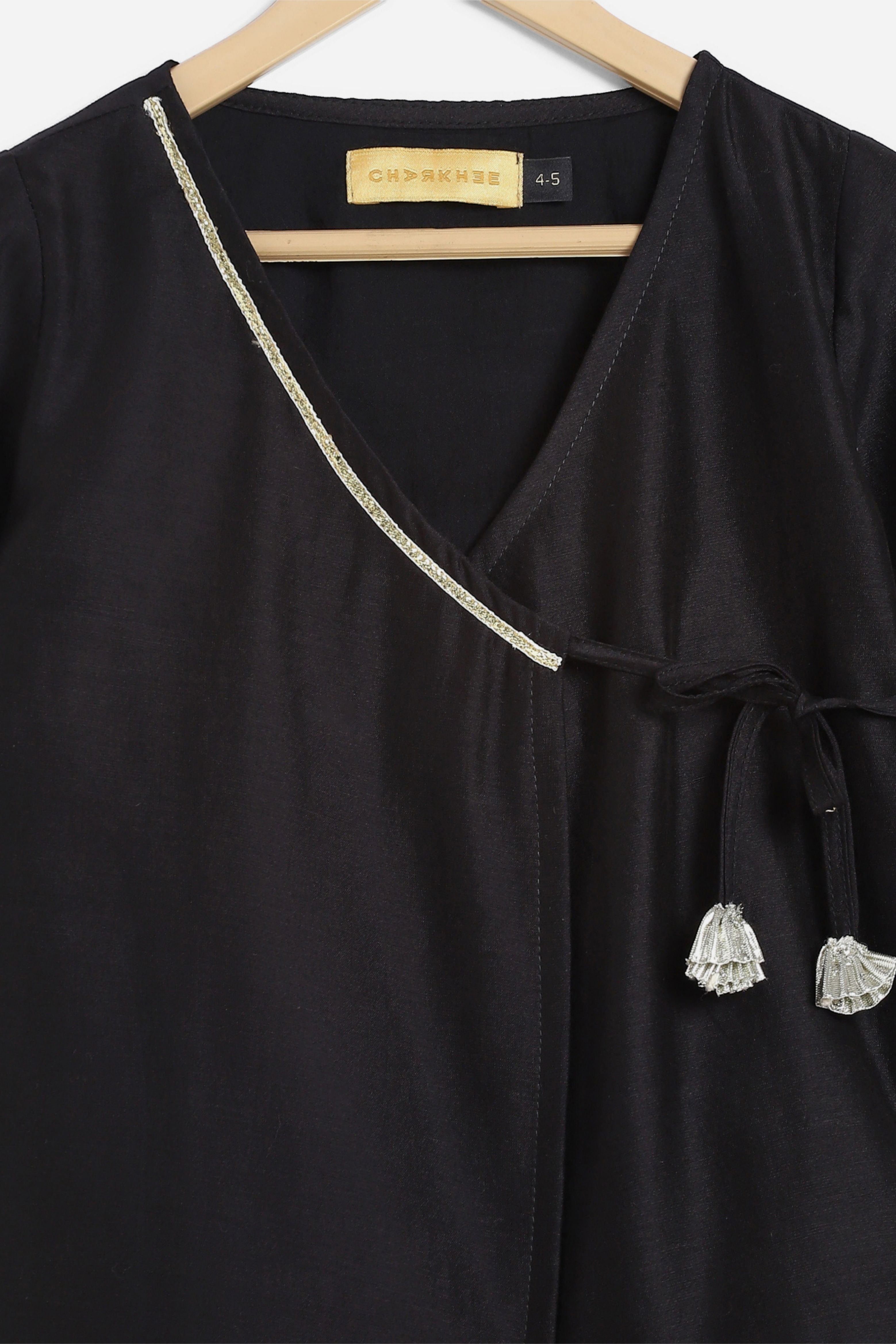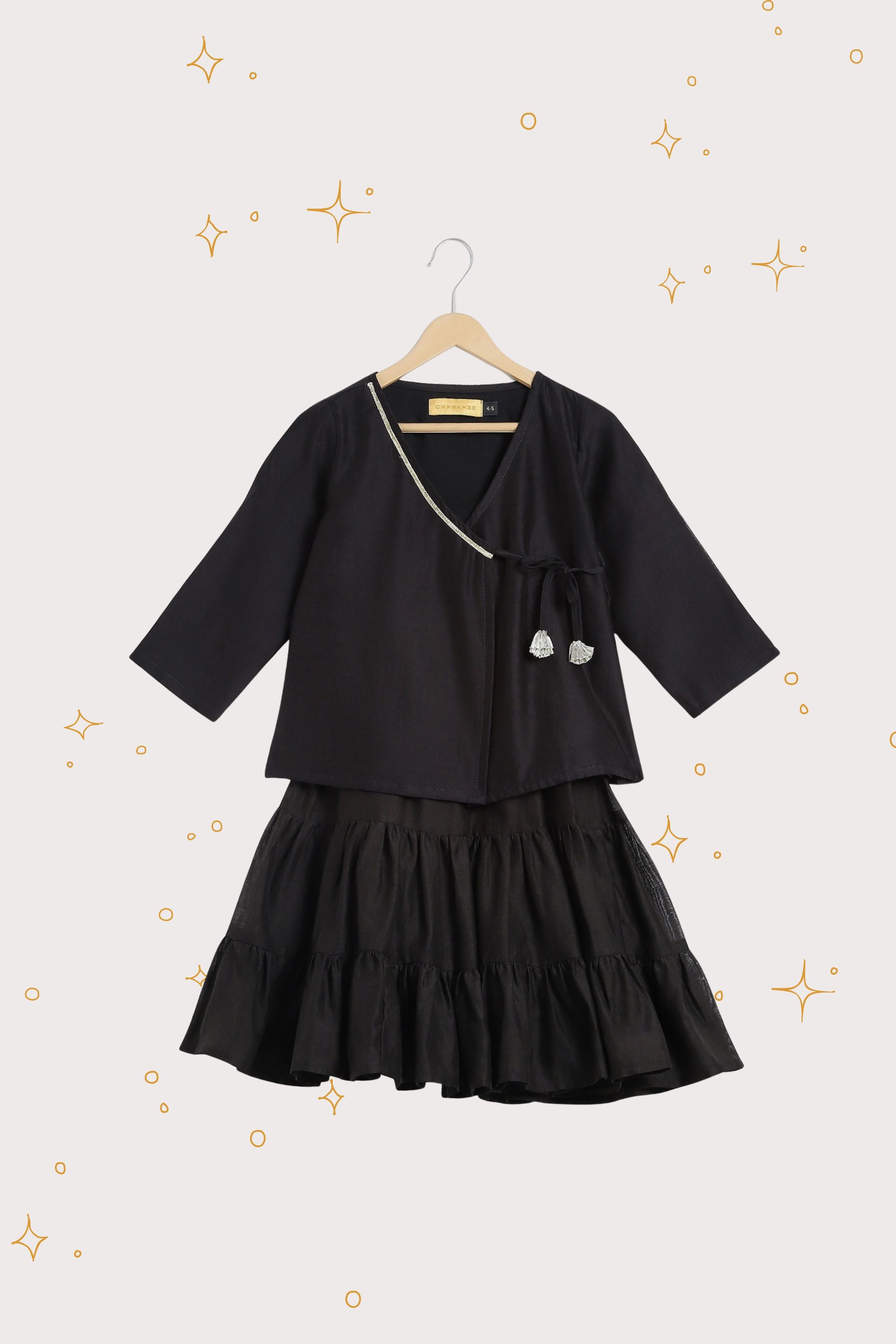 This Chanderi Angrakha Style Lehenga for girls showcases elegant lace details that enhance its sophisticated charm. The set features a classic tie-up Angrakha top paired with a graceful tiered short skirt, blending traditional craftsmanship with contemporary design. Perfect for special occasions, it offers comfort and style in one exquisite ensemble.