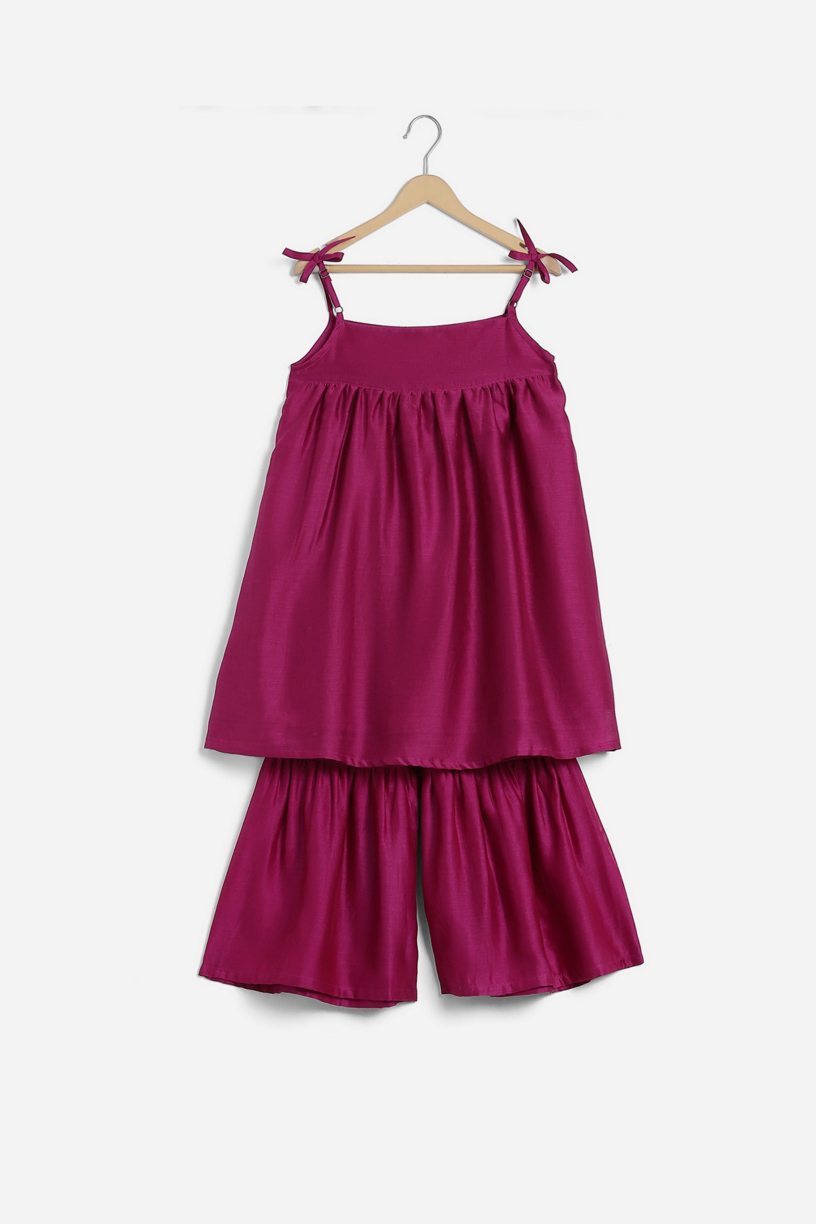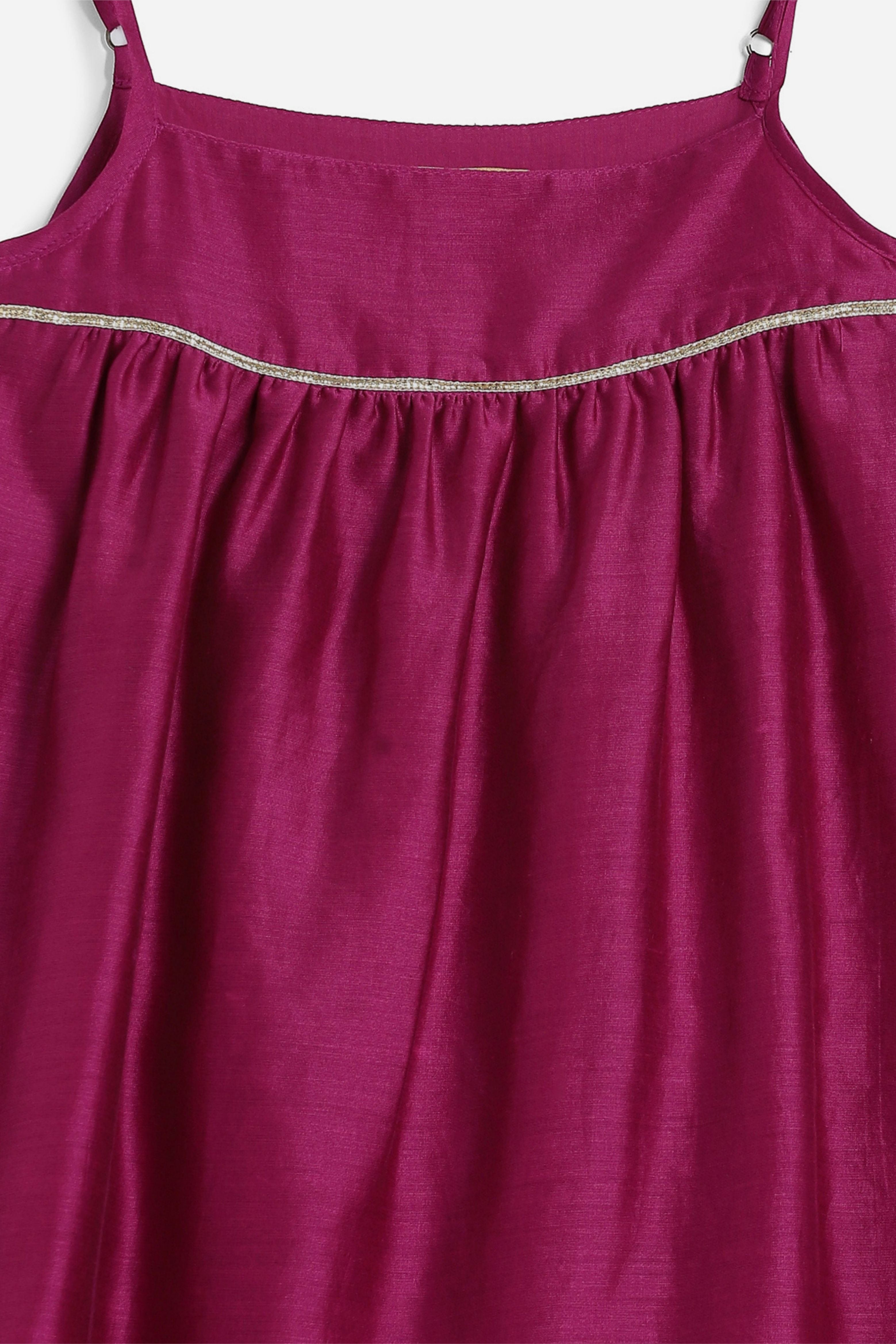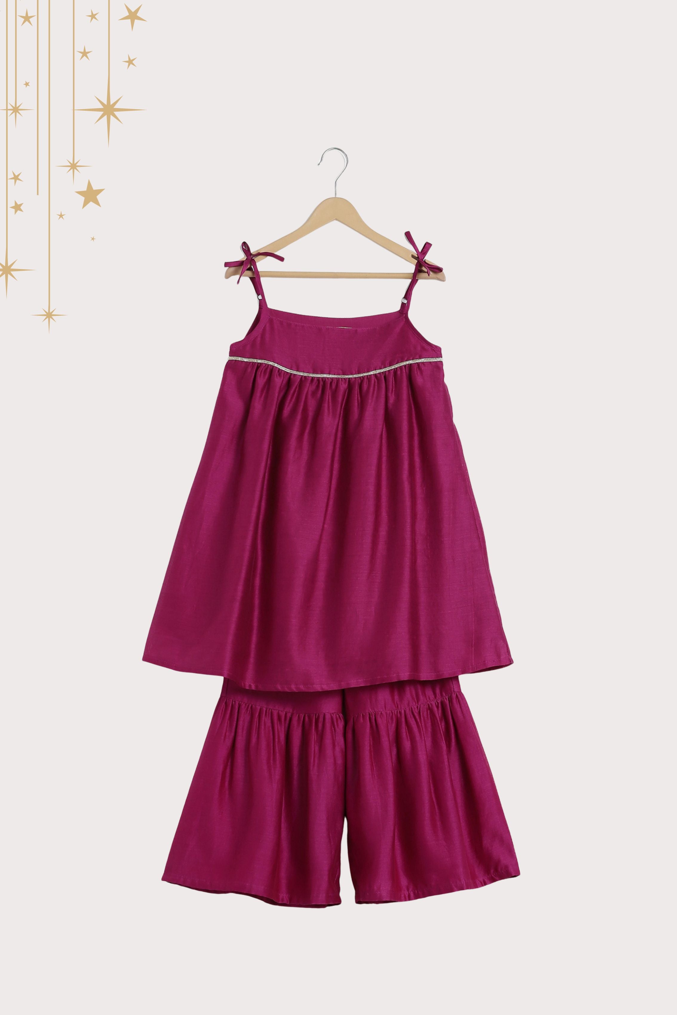 This tie up Chanderi kurta for girls features a soft cotton lining and elegant placement gota work. Accompanied by a tiered sharara, it seamlessly combines traditional artistry with contemporary flair. Ideal for special events, this ensemble offers both refined style and comfortable wear.