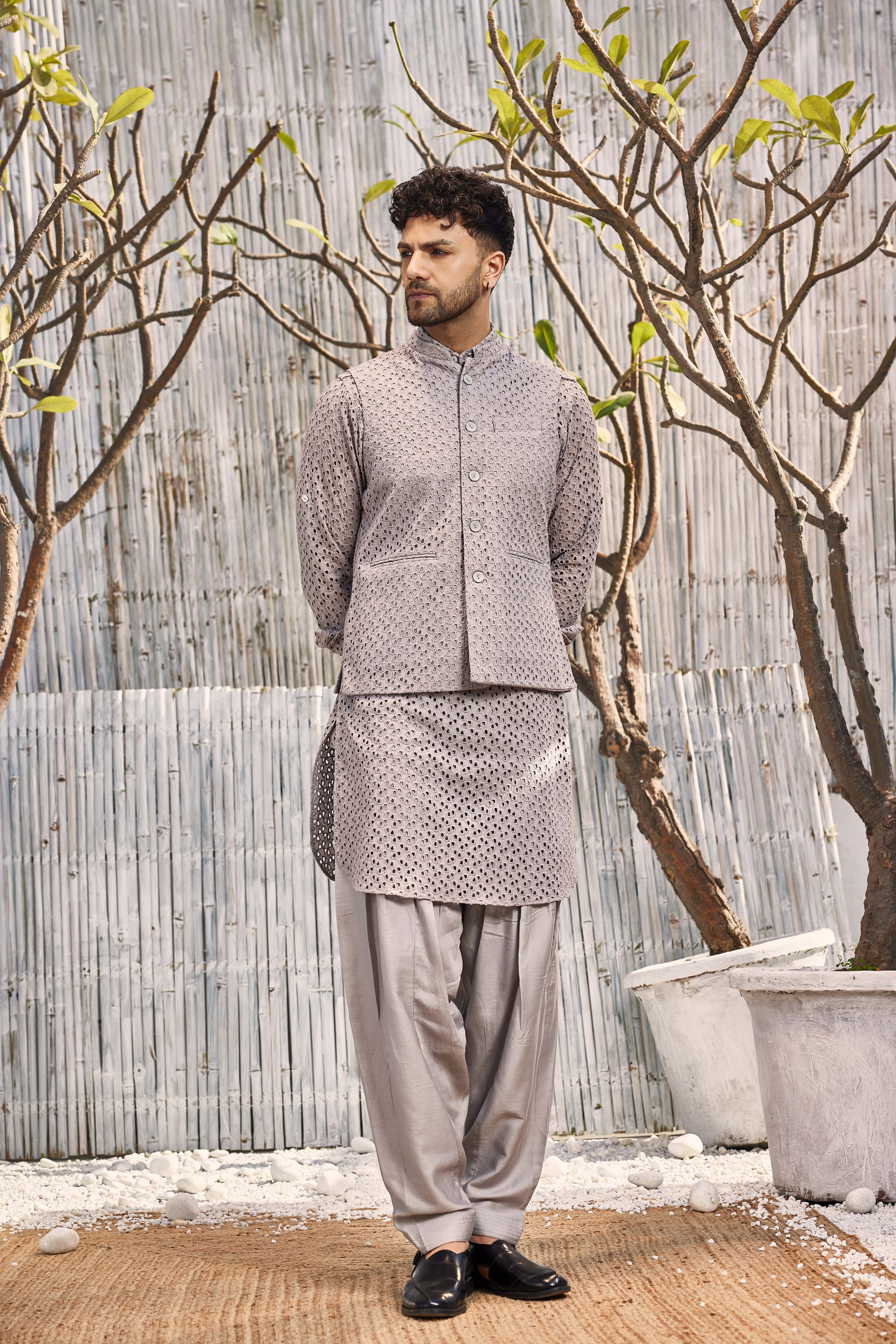 Bundi jacket in steel grey schiffli cotton can transform any outfit into occasion wear. This jacket can be combined with pathani set or an ensemble of classic shirt & trousers,