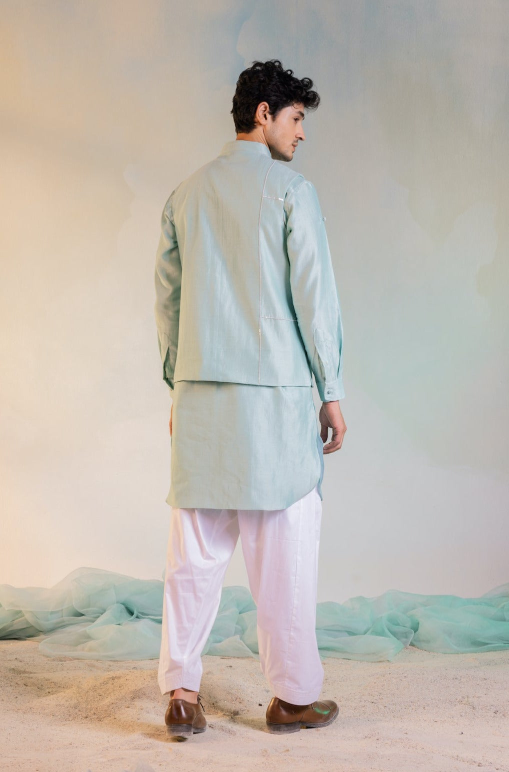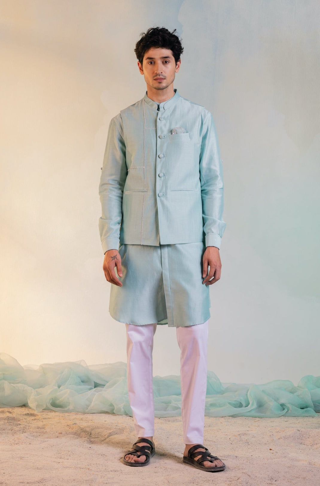 Chanderi Nehru jacket with subtle sequin embroidery on one side of front panel, accessorize it with organza sequin work pocket square.