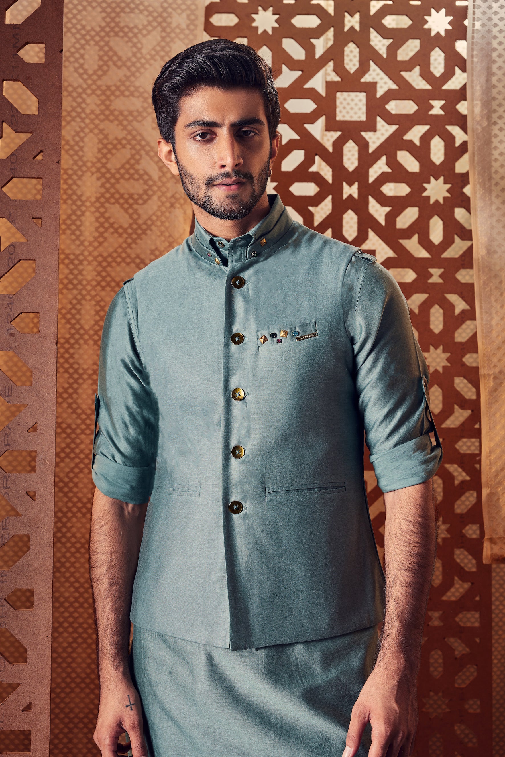 The royal sage green nehru jacket in chanderi can transform any outfit into occasion wear. The look is elevated with antique metal buttons and subtle embroidery work that adds dimension.