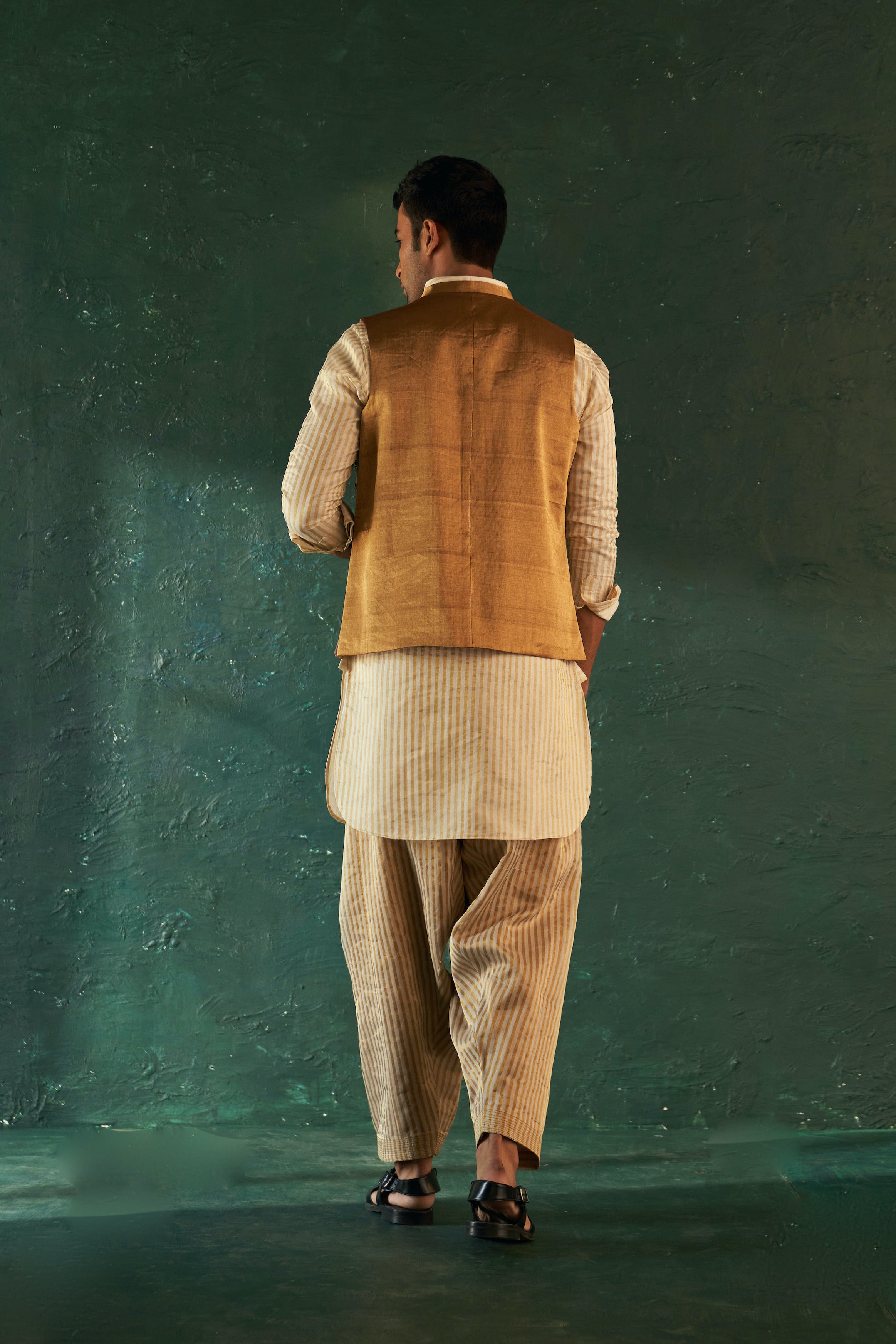 This luxurious, regal multi-patch Nehru jacket crafted from the softly-woven silk tissue can instantly elevate any ensemble to occasion-suitable attire.