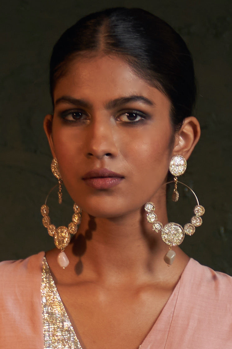 Our chicly constructed chandbalis, delicately woven with zari and gota and enlivened with multi-hued gemstones. This distinctive piece with one side featuring a grey stone and the other a pink stone, exudes an aura of timeless sophistication to any ensemble.