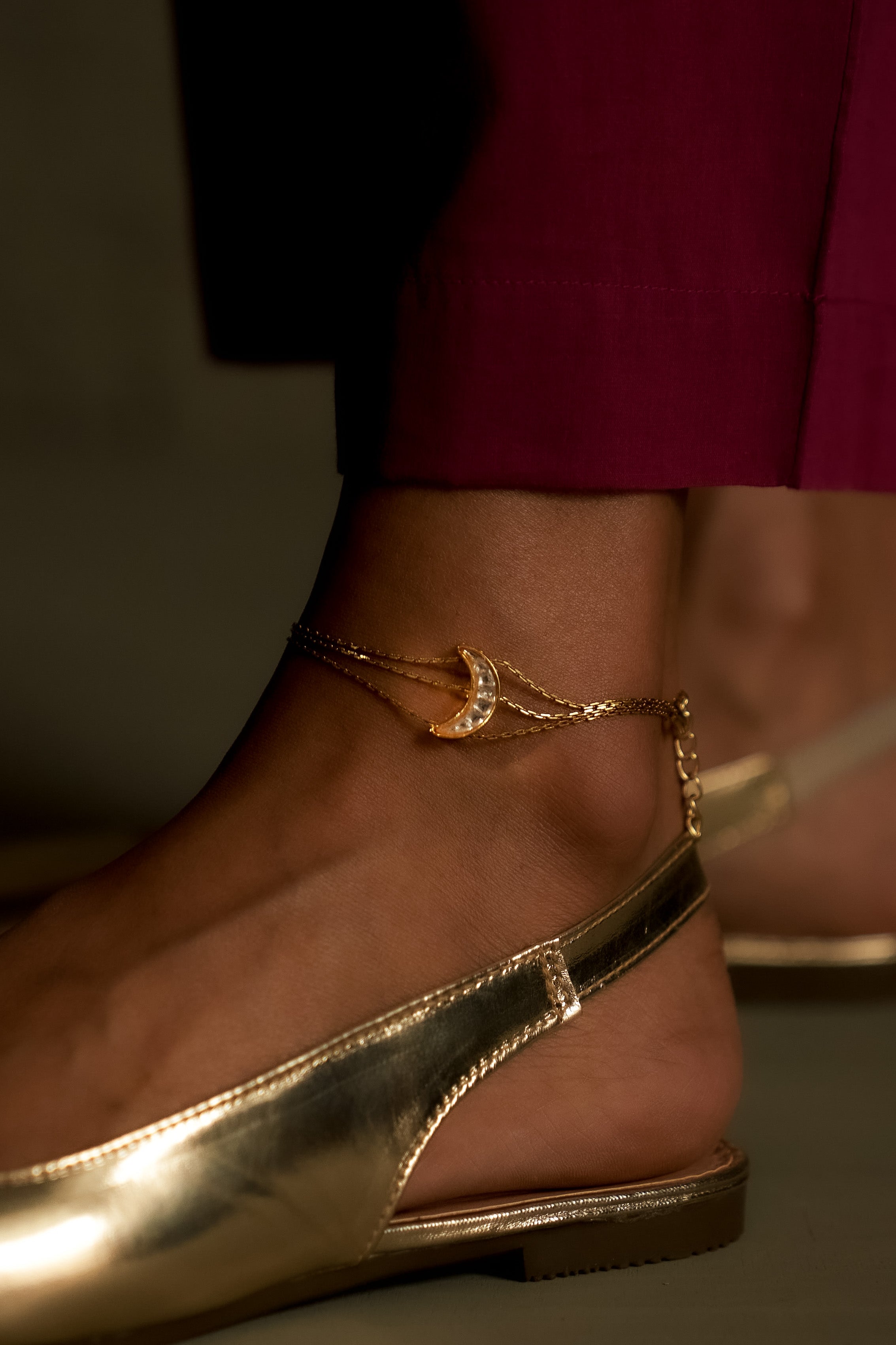 A multi-chain anklet adorned with a delicate kundan crescent, blending sparkling elegance with playful movement. Perfect for adding a subtle yet festive shimmer to every step