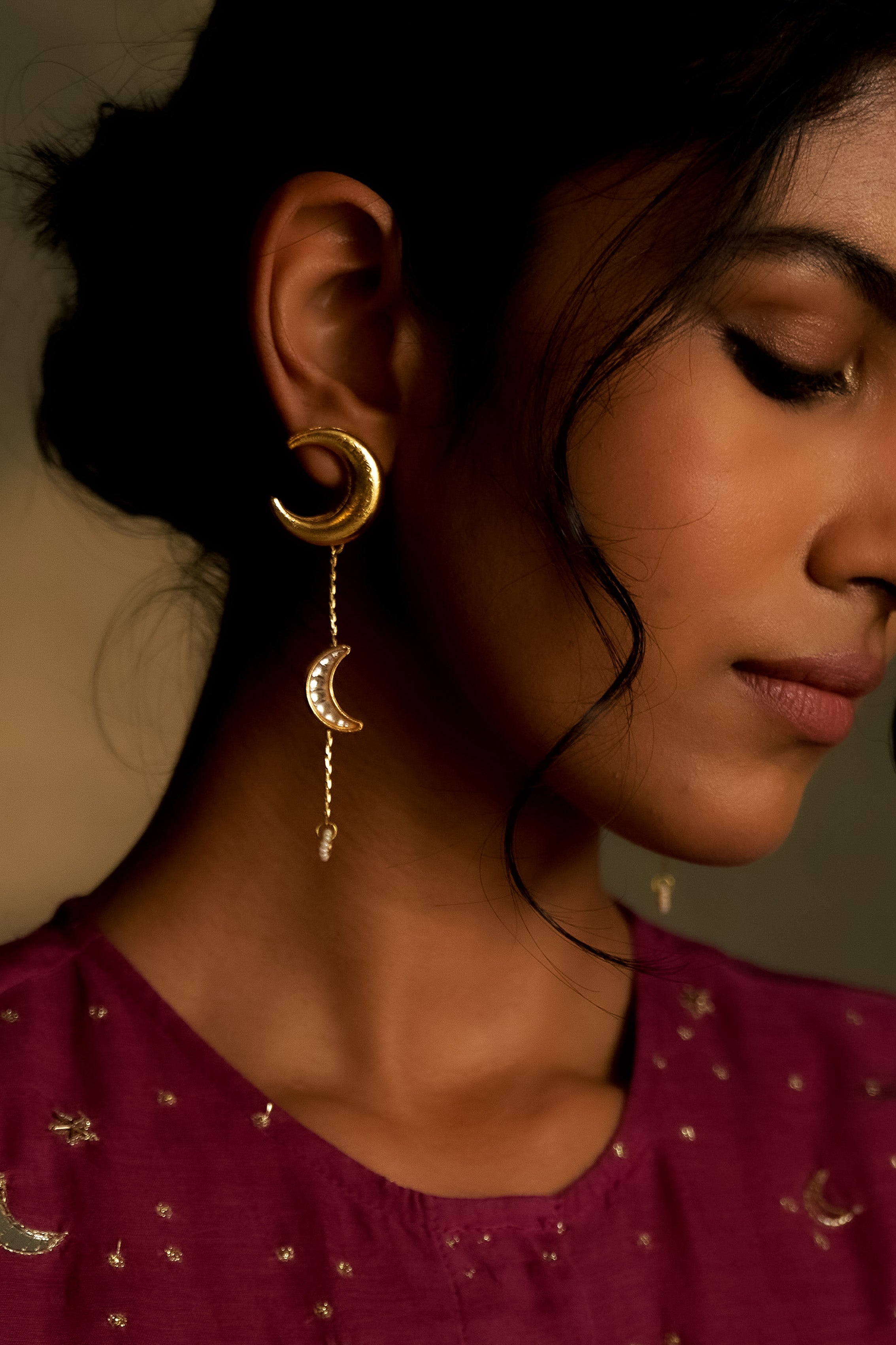 Delicate gold crescent earrings featuring a fine chain drop, accented with a kundan crescent charm and a dainty pearl at the tip. A graceful balance of tradition and modern minimalism, perfect for festive evenings and elegant occasions.