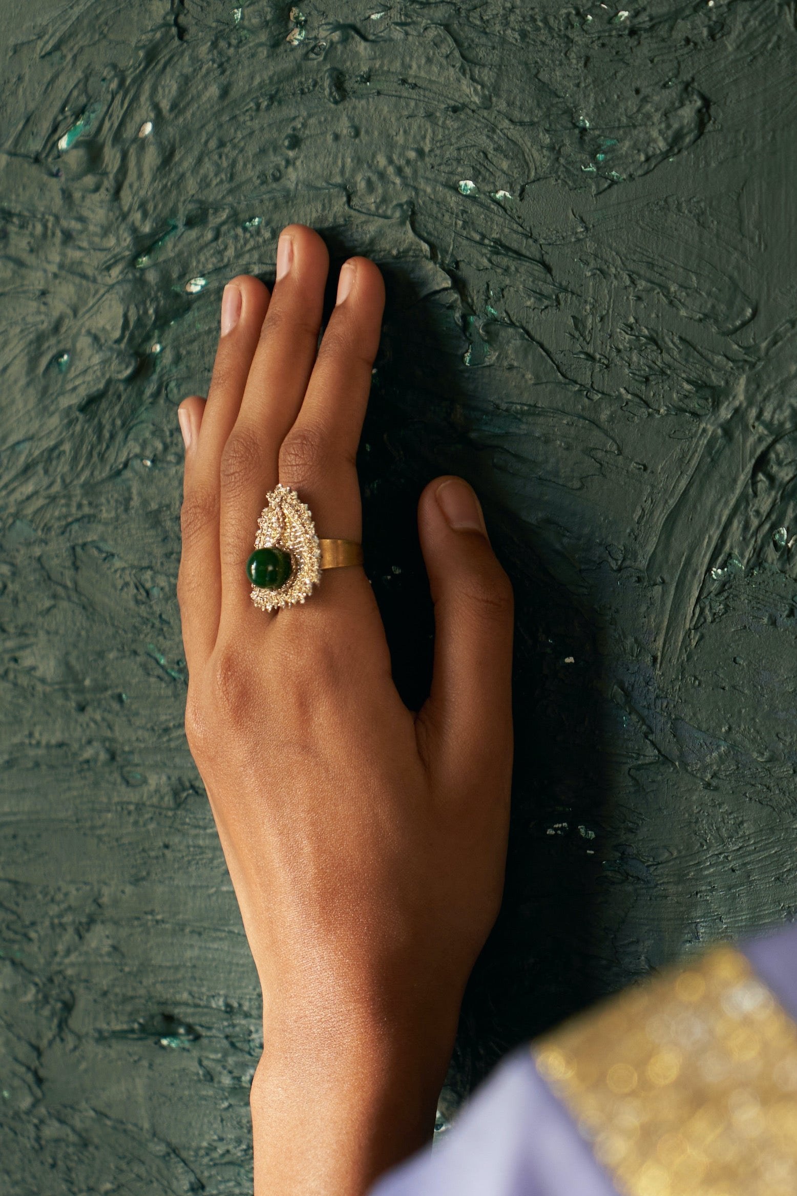 These exquisite ring combine the timeless beauty of warm gold tone with the grace of rich green gem. Handcrafted with gota and zari, it adds a touch of sophistication and a pop of color to any outfit Its subtle brilliance makes it a perfect statement piece for a special occasion or a night on the town. Get ready to sparkle and shine.