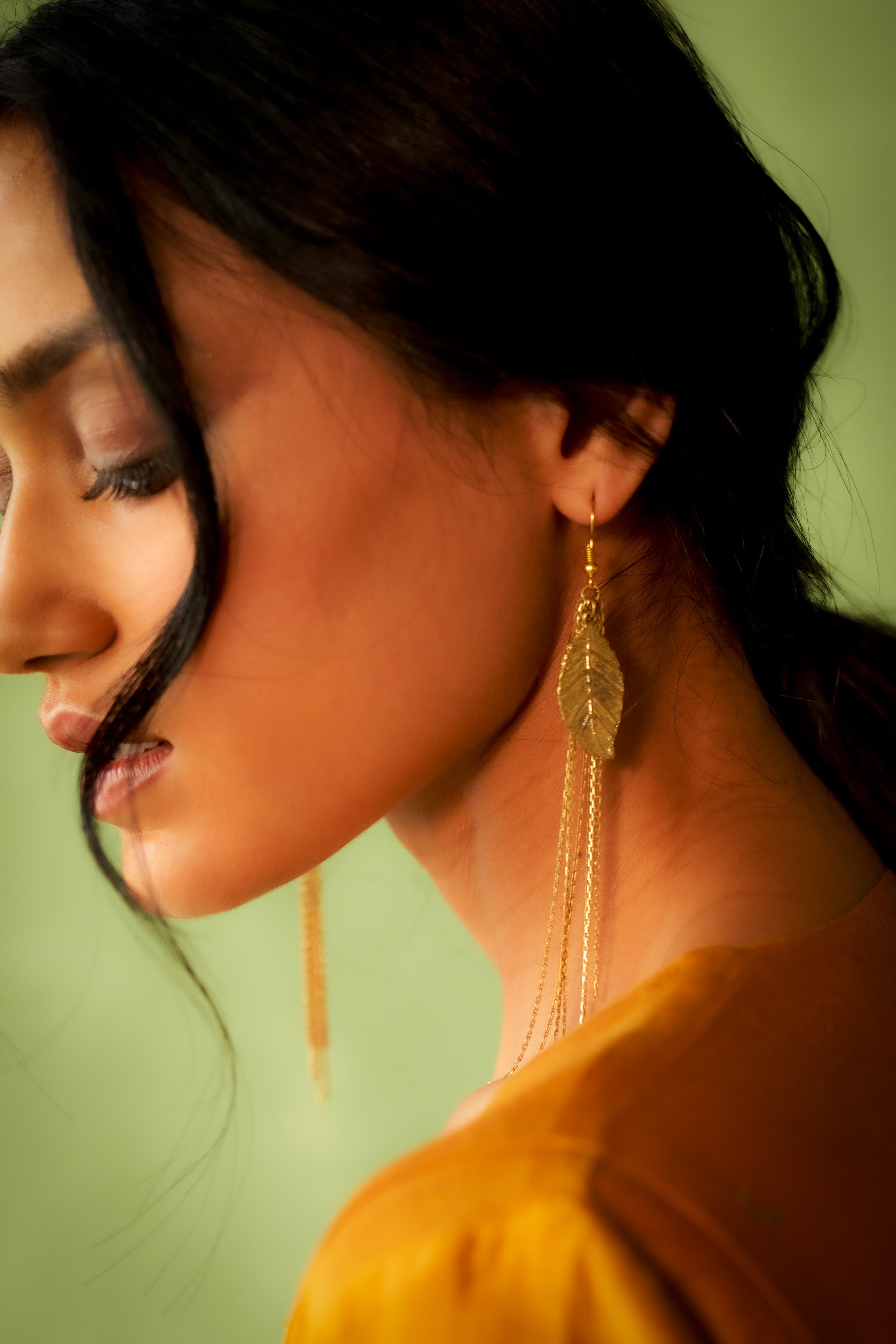 Sleek and graceful,long chain earrings finished with a single bold leaf that dangles effortlessly. Minimal yet striking, they bring a touch of nature’s elegance to any look, perfect for day or evening wear.