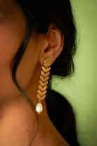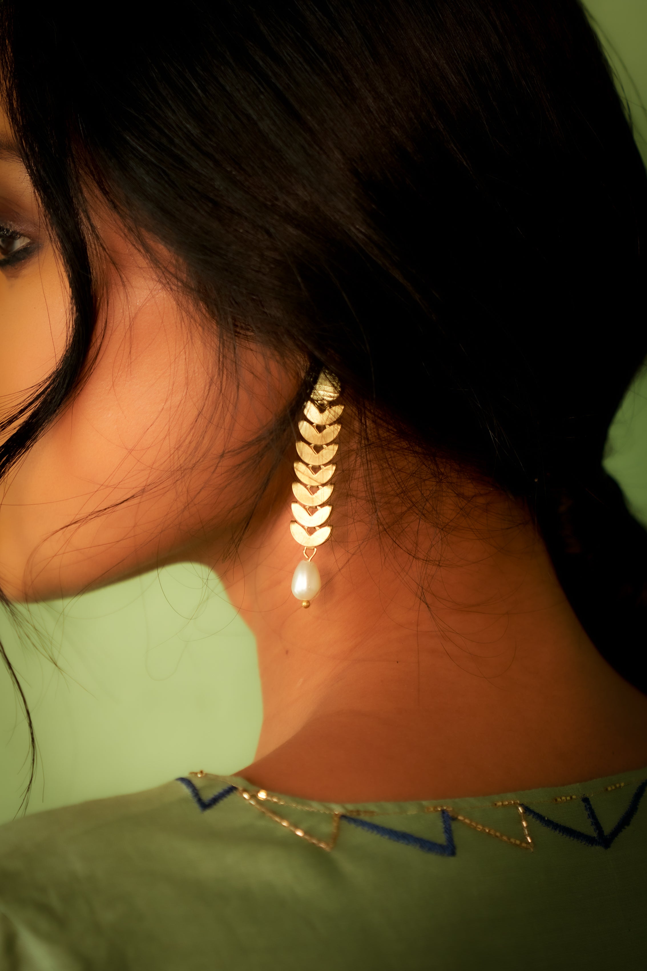 Crafted with an exquisite design, these earrings feature intricate brass petals design, gracefully tapering to a delicate pearl drop. The petal shape evokes a sense of nature's beauty, while the metallic brass sheen adds a contemporary touch.