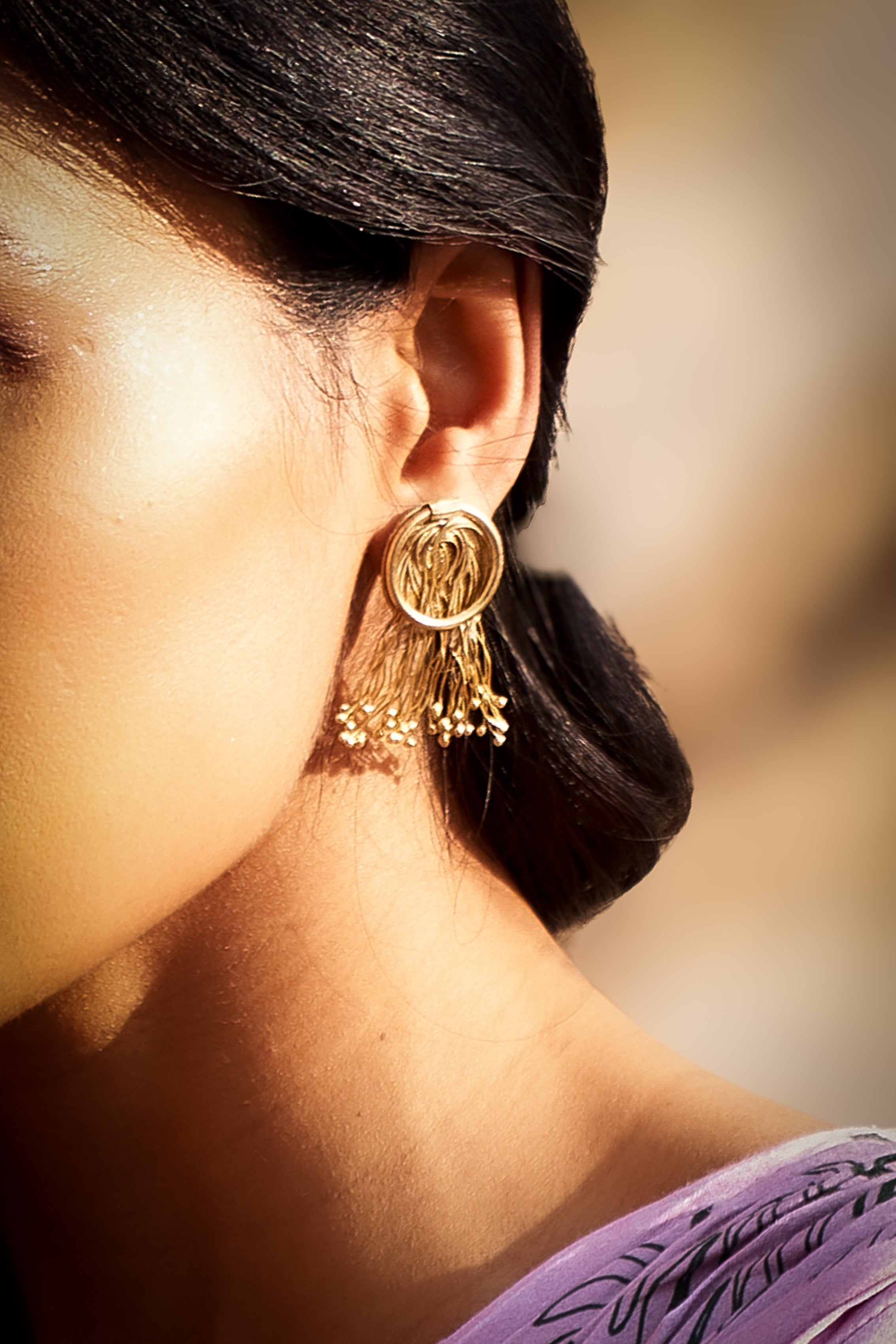 A round, nature-inspired earring with fine gold strands falling like pollen. Light, textured, and full of movement — a statement piece with organic charm.