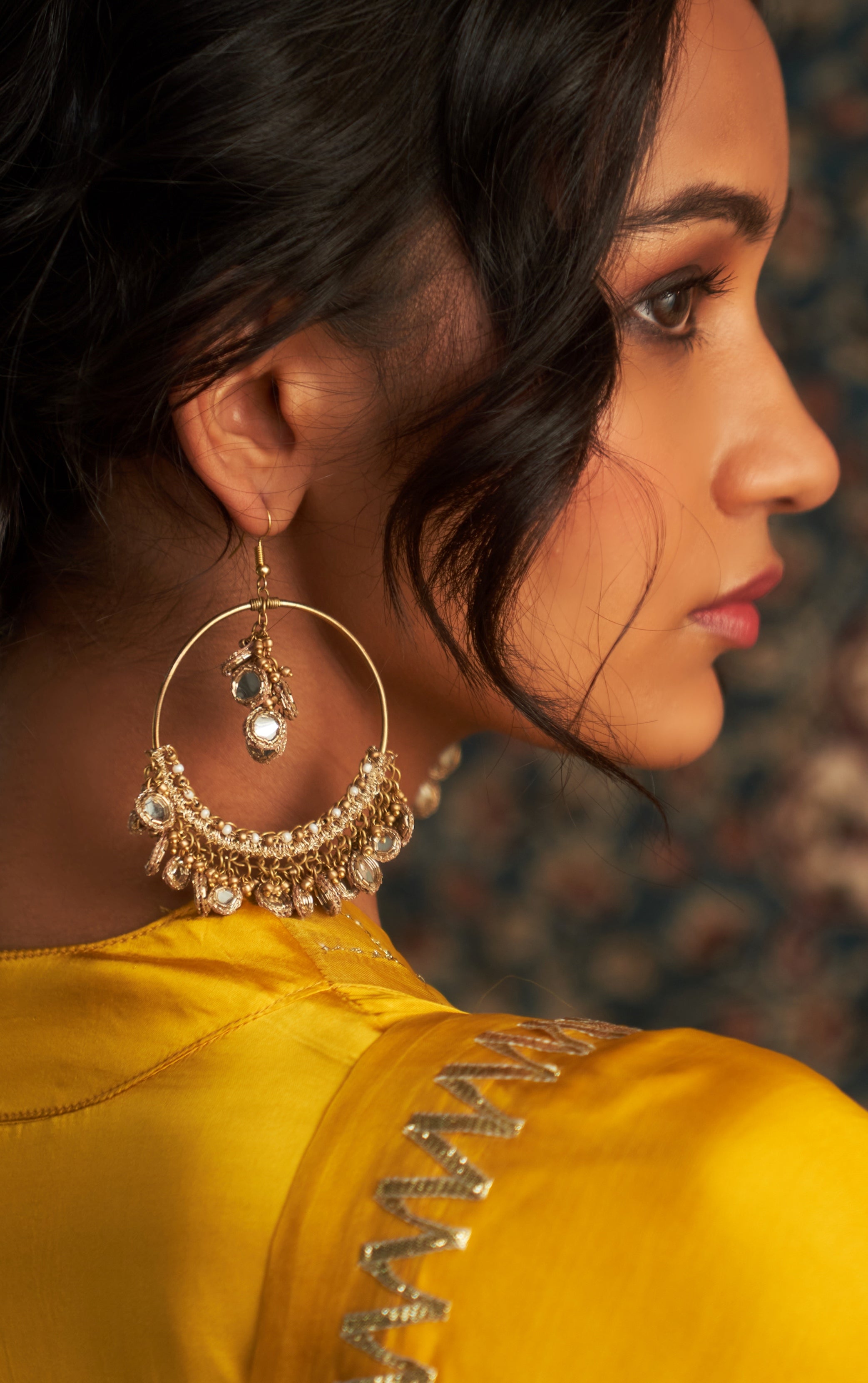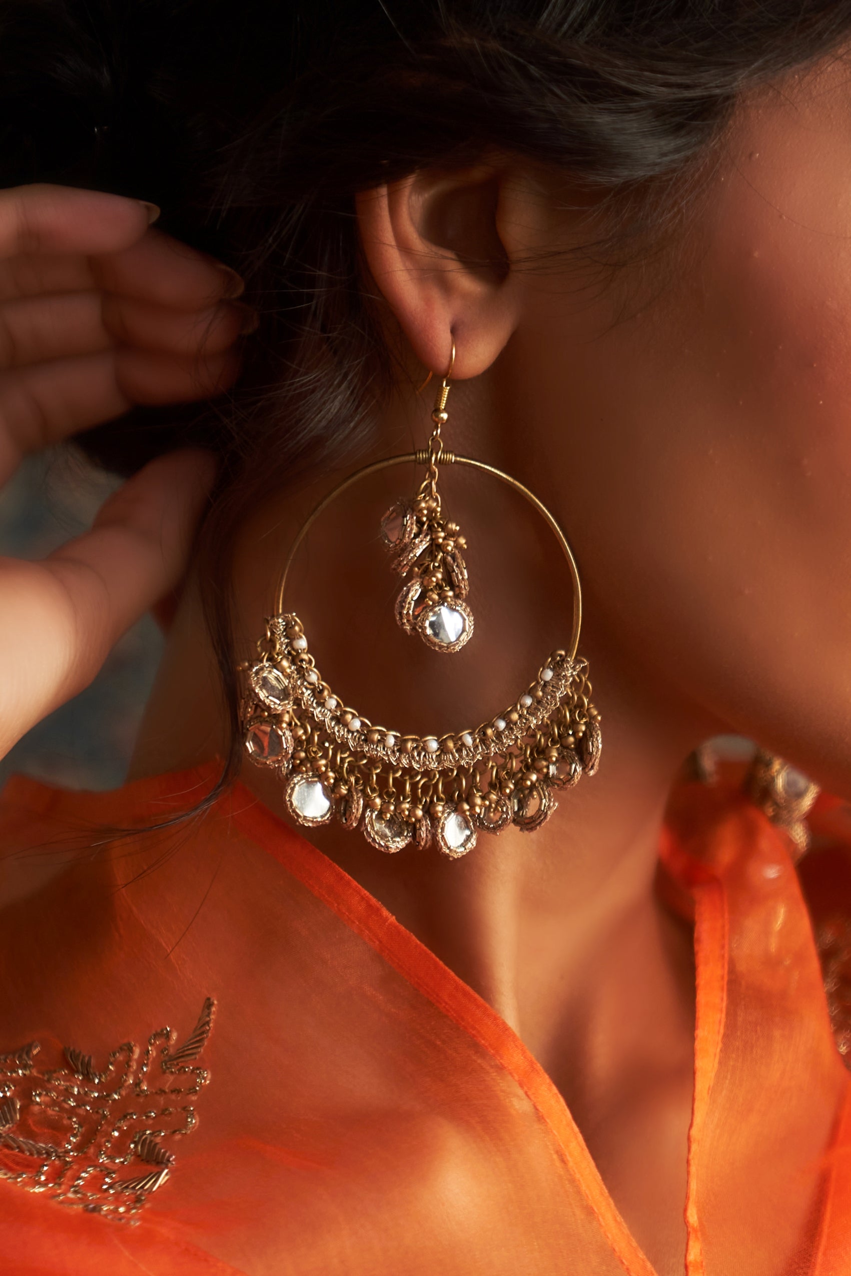 Adorn yourself with the regal charm of our Handmade Gold toned Chandbalis, embellished with delicate mirror work and intricate bead detailing. These handcrafted earrings are inspired by traditional Indian designs, offering a perfect blend of heritage and modern elegance. The gleaming gold finish, paired with sparkling mirrors and dainty beads, creates a mesmerizing effect, making these chandbalis ideal for festive occasions, weddings, or special events. Lightweight and comfortable, these statement earrings will leave a lasting impression wherever you go.