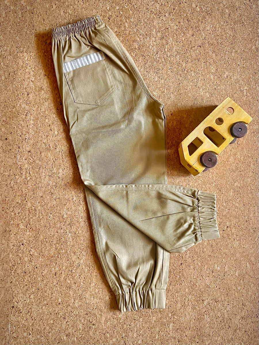 Beige woven mid rise joggers has an elasticated waist band at back, two side pockets and elasticated hem. The back pocket has a block printed styling patch.