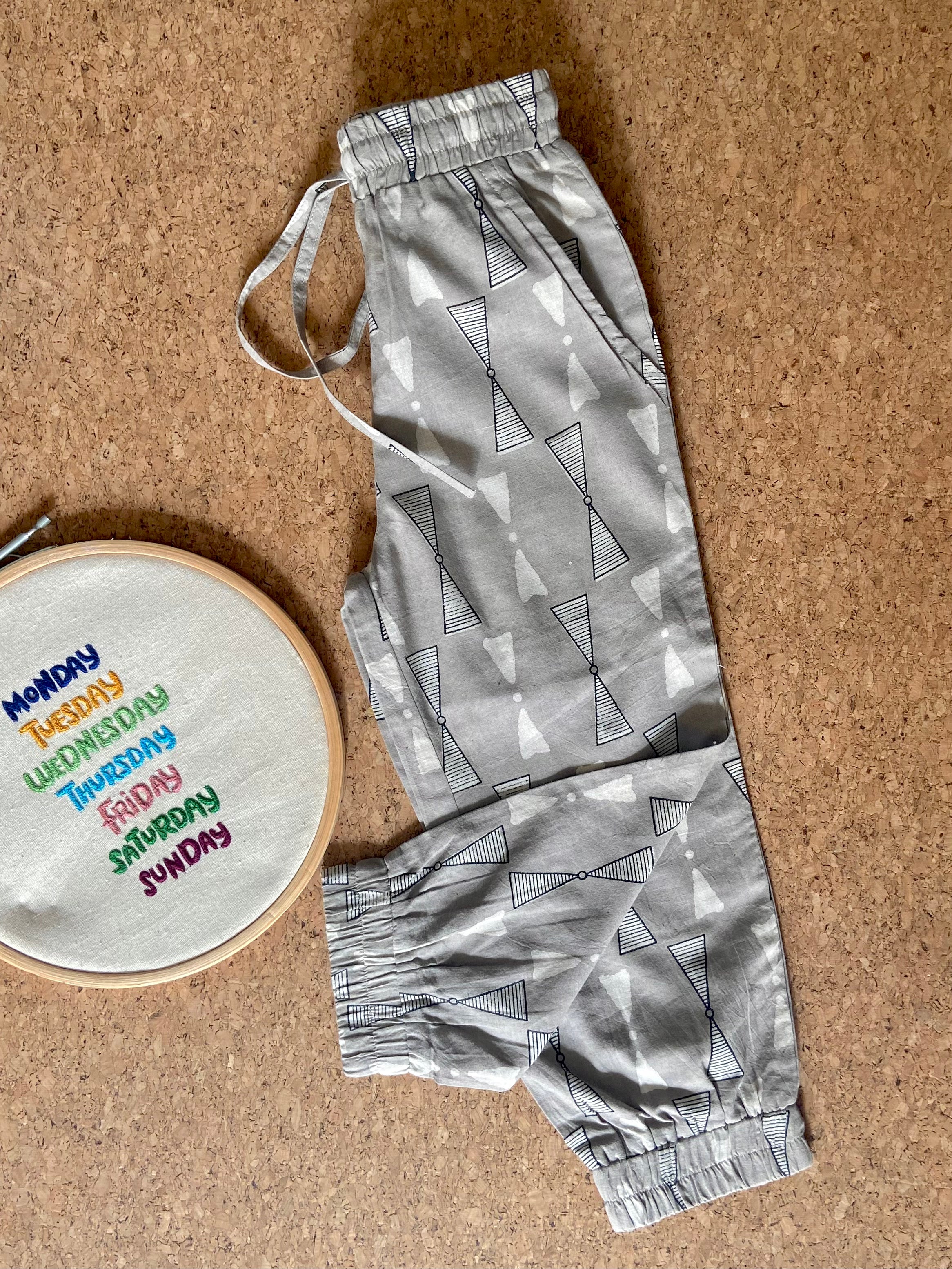 Grey block print joggers with an elasticated waist band and a drawstring, two side pockets and elasticated hem.