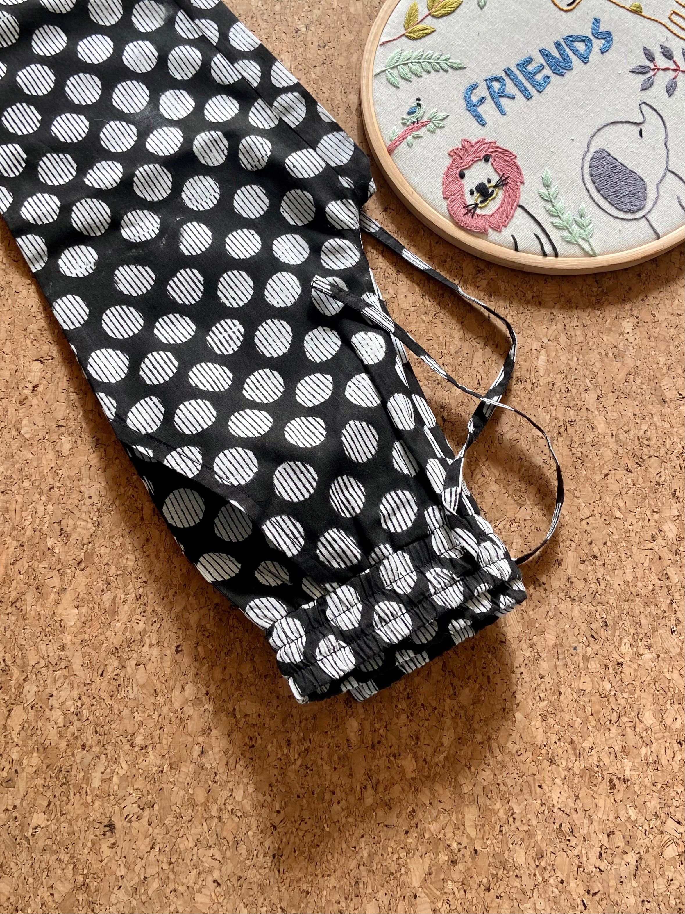 Black polka block print joggers with an elasticated waist band and a drawstring, two side pockets and elasticated hem.