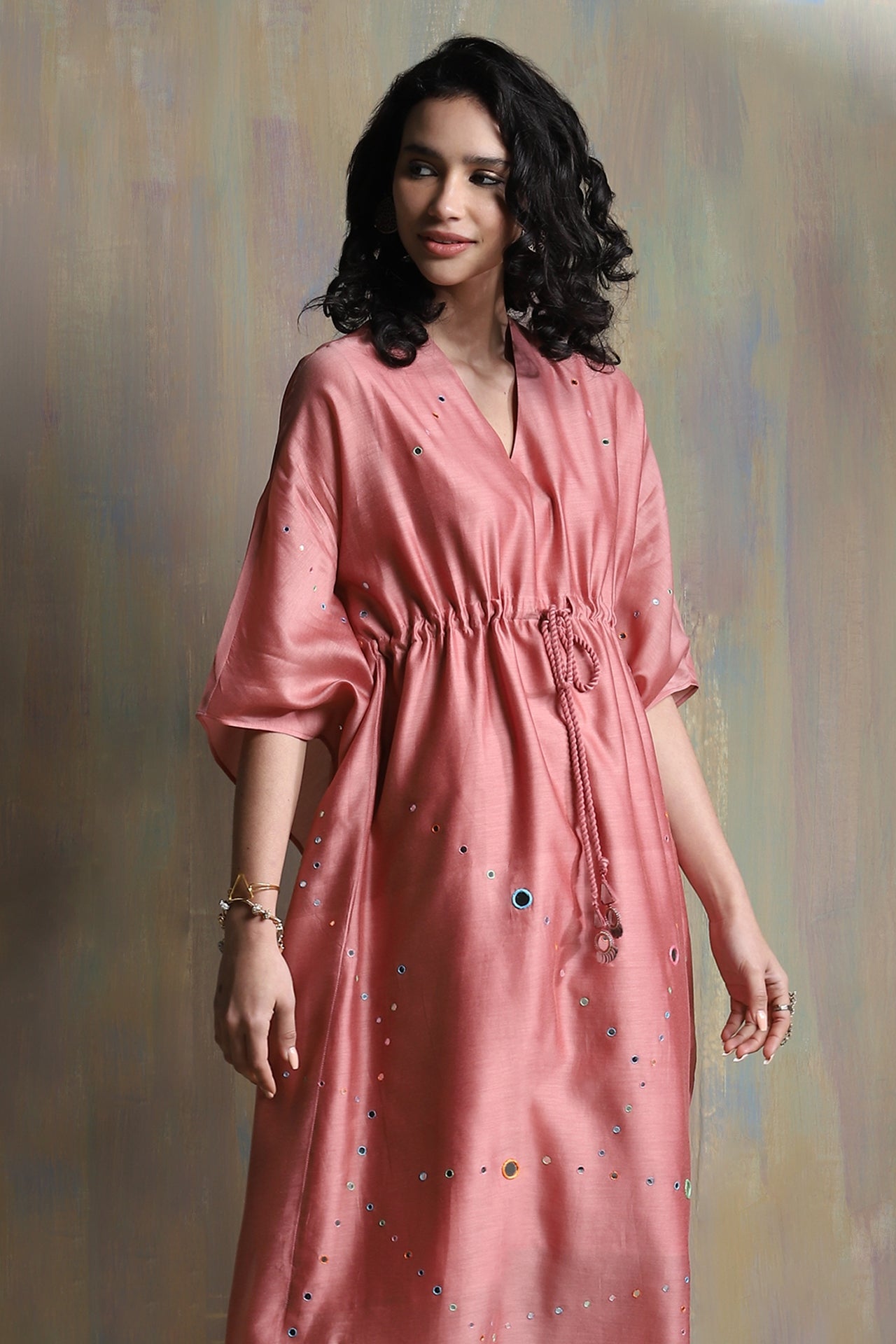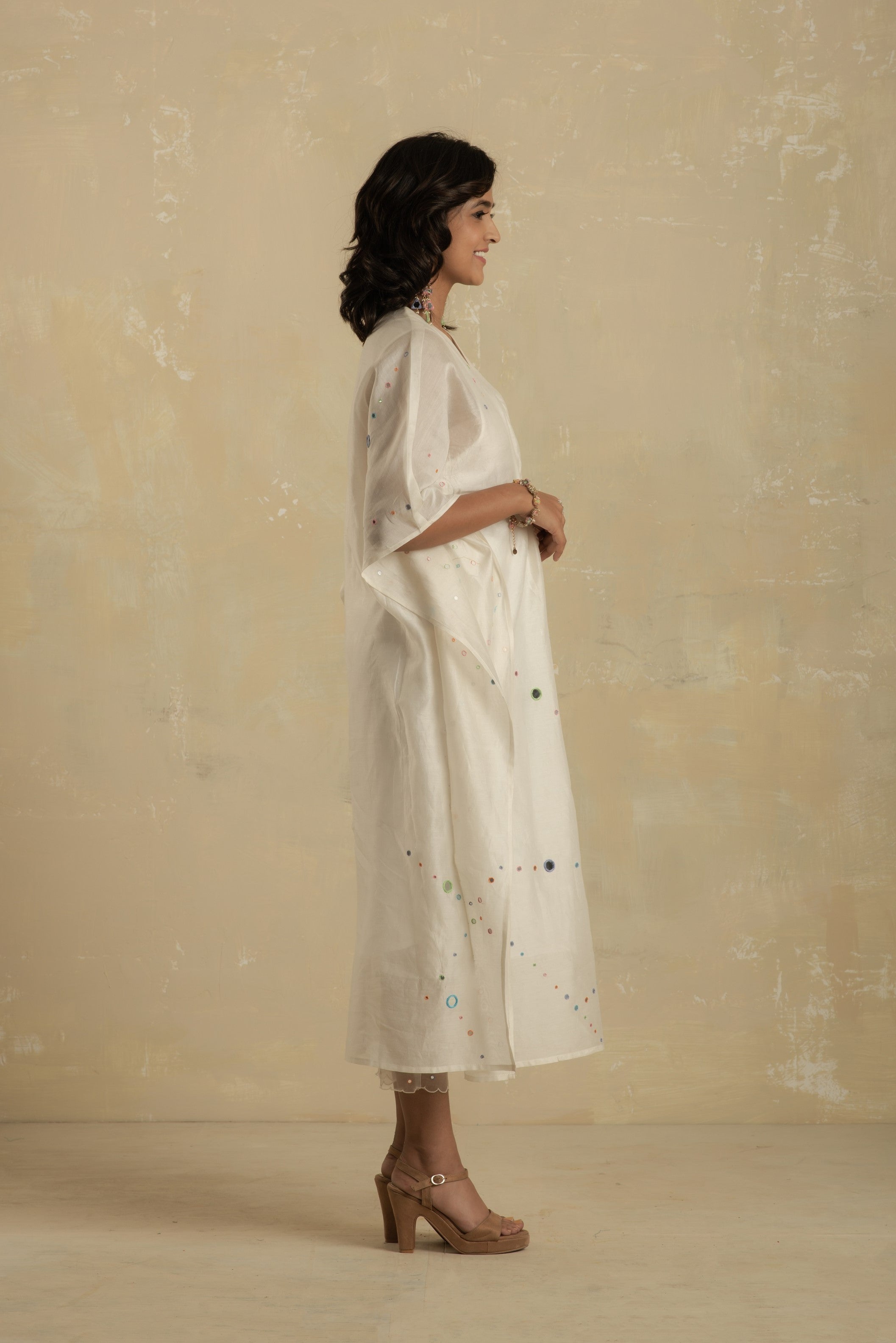 Chanderi white kaftan with colored embroidery embedded with mirrors and a front drawstring with mirror hangings, loose fit with gathers and side slit.