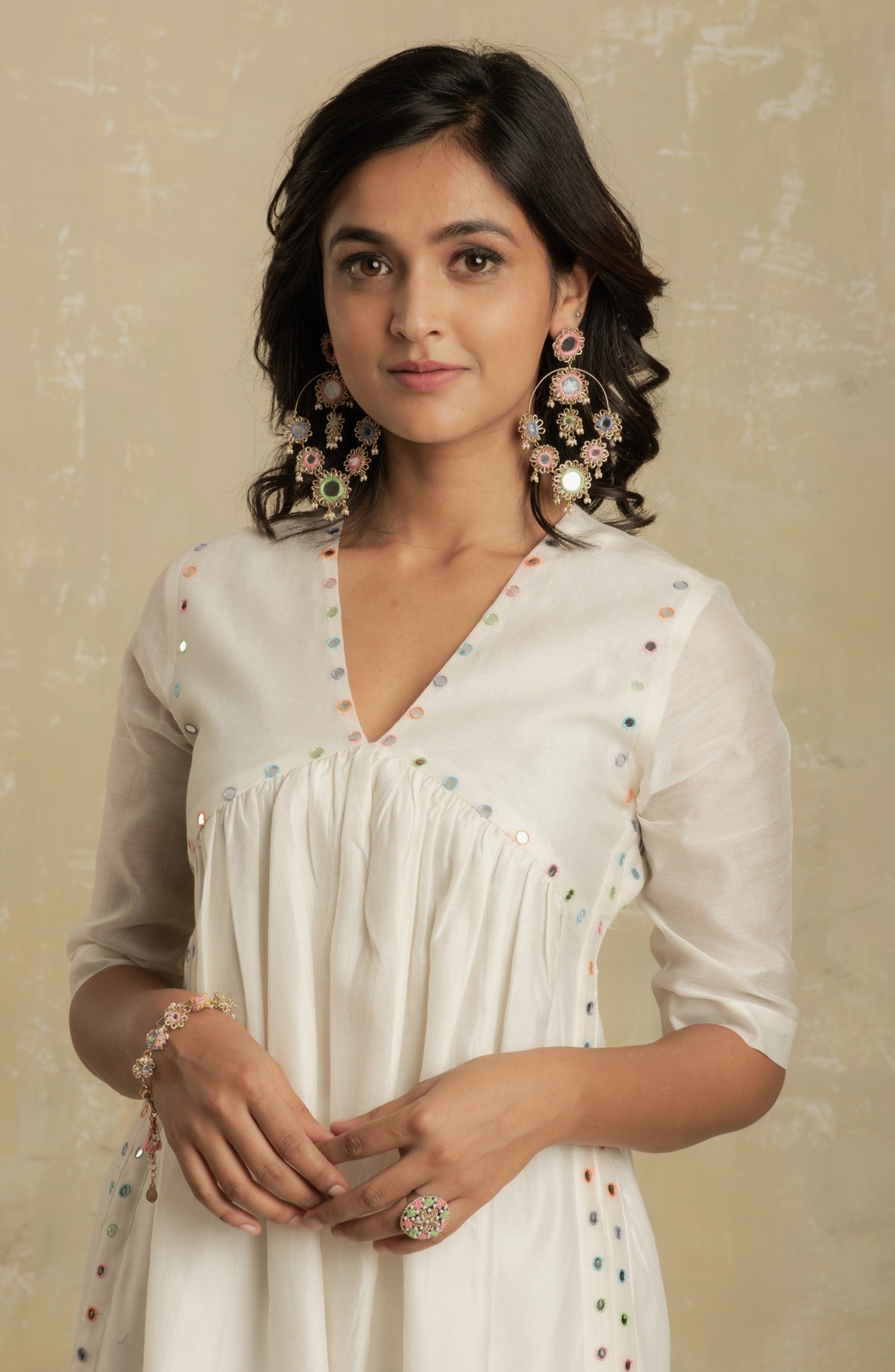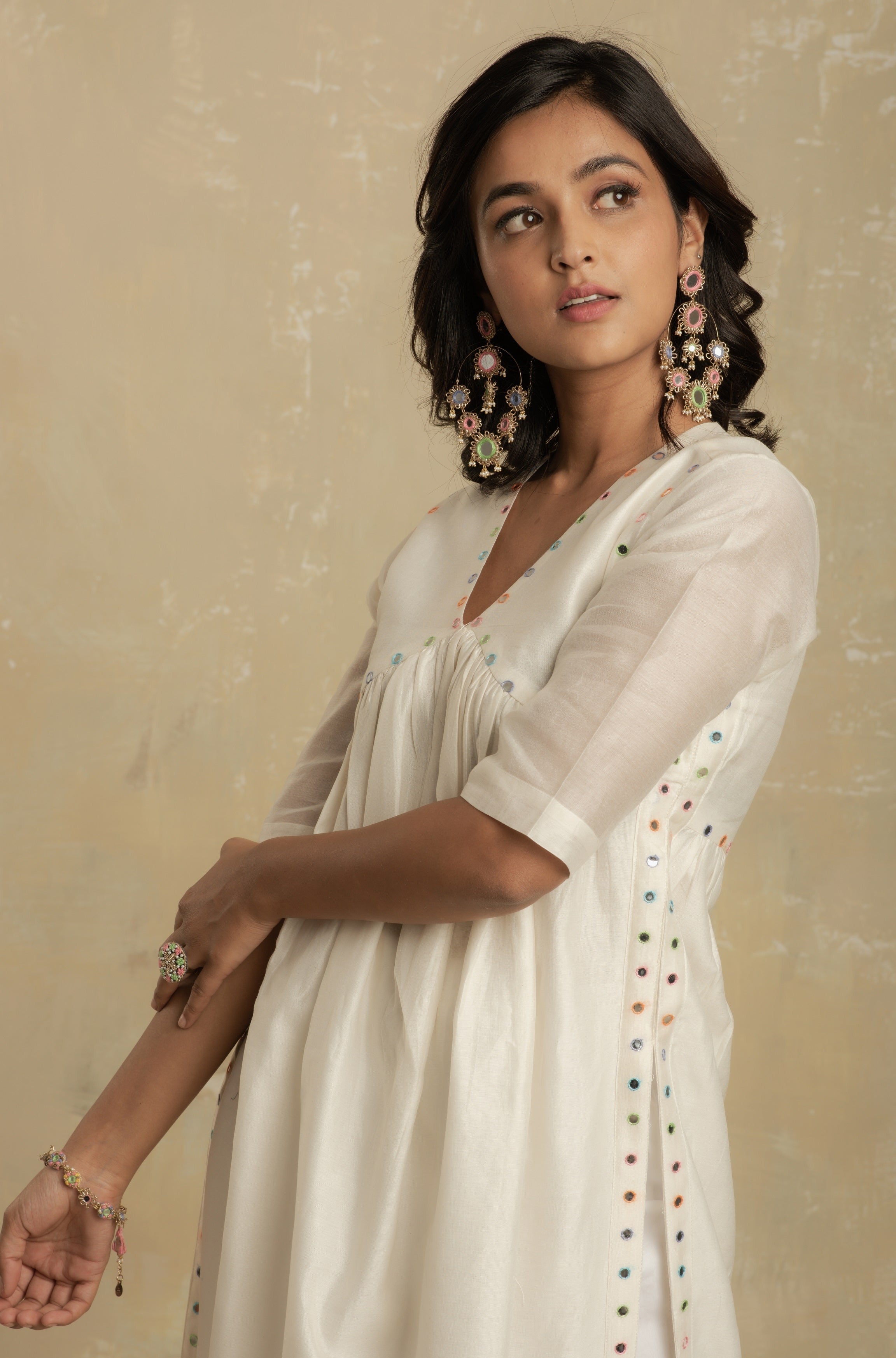 Chanderi Chanderi kurta with colored embroidery, embedded with mirrors on yoke and side slits. This kurta is paired with straight organza panel pants & sheer organza dupatta embellished with silver sequins.