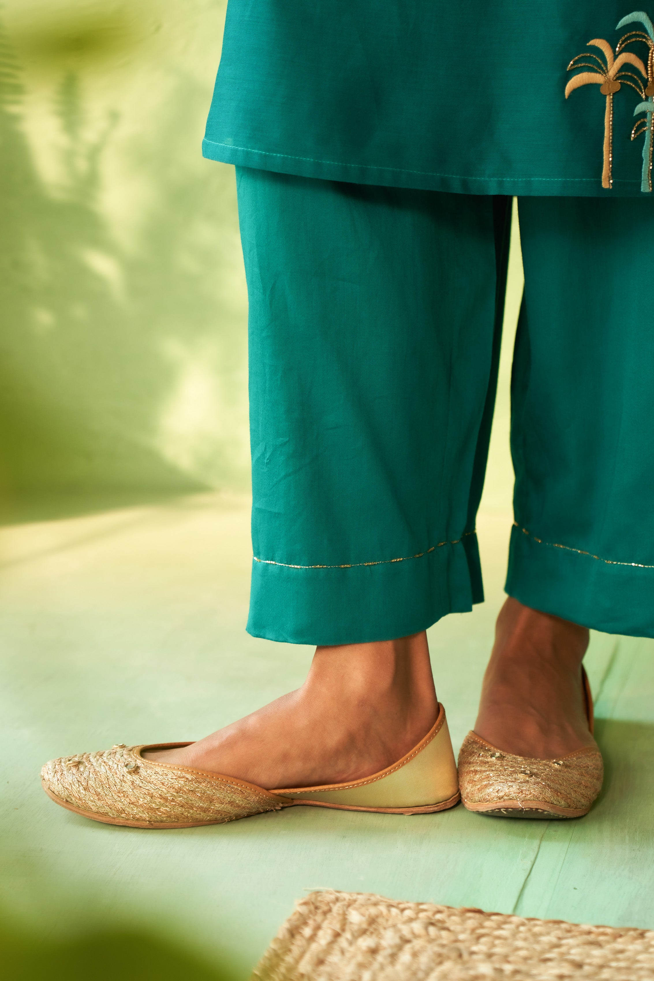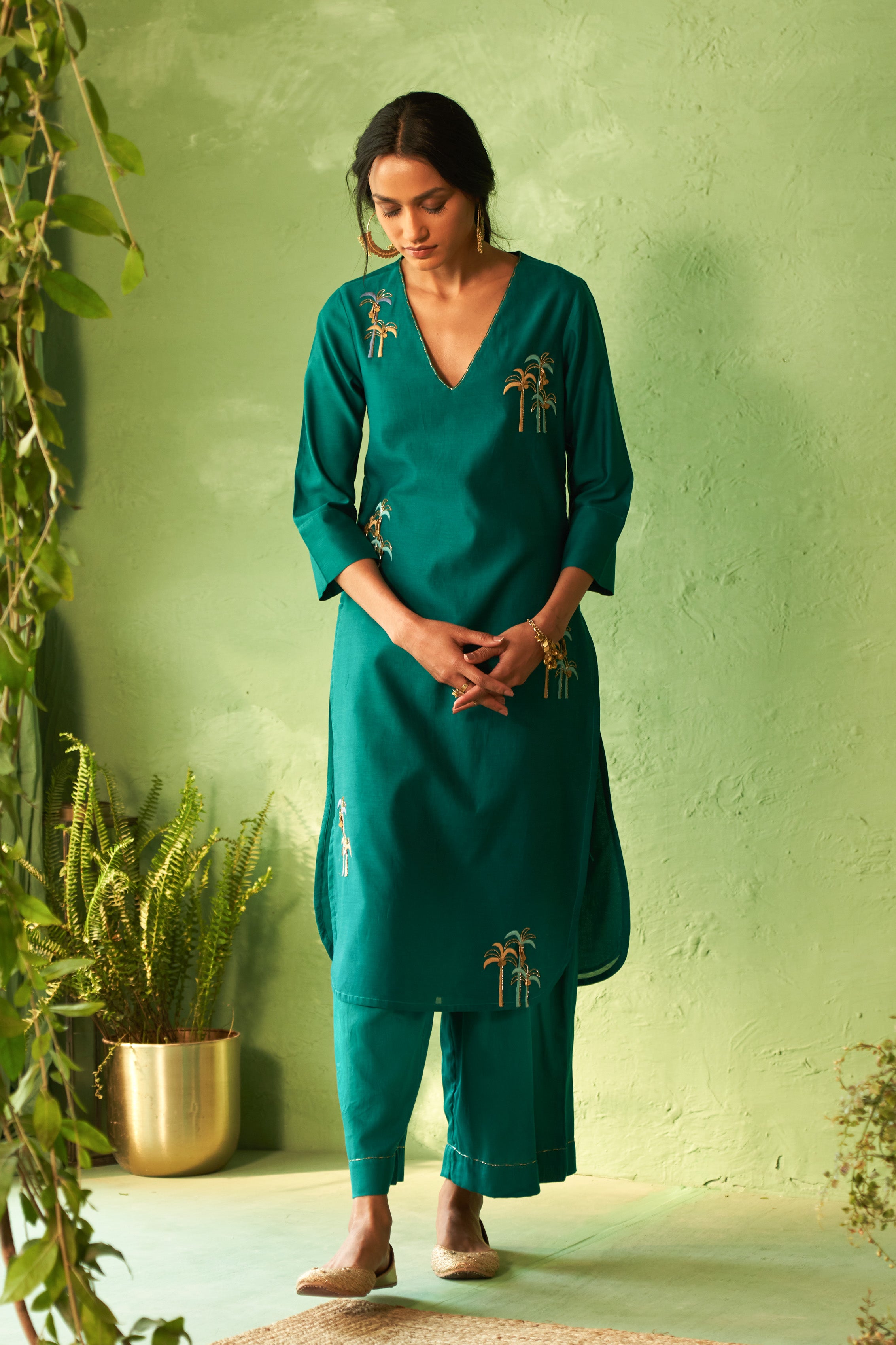 A straight kurta with a curved hem, dotted with palm tree motifs on front panel—subtle, minimal, and made for modern-day ease. Wear it with a soft organza dupatta (optional) for a delicate touch, or go without. Pair it with loose, lightly embroidered pants for a look that’s effortless yet refined.