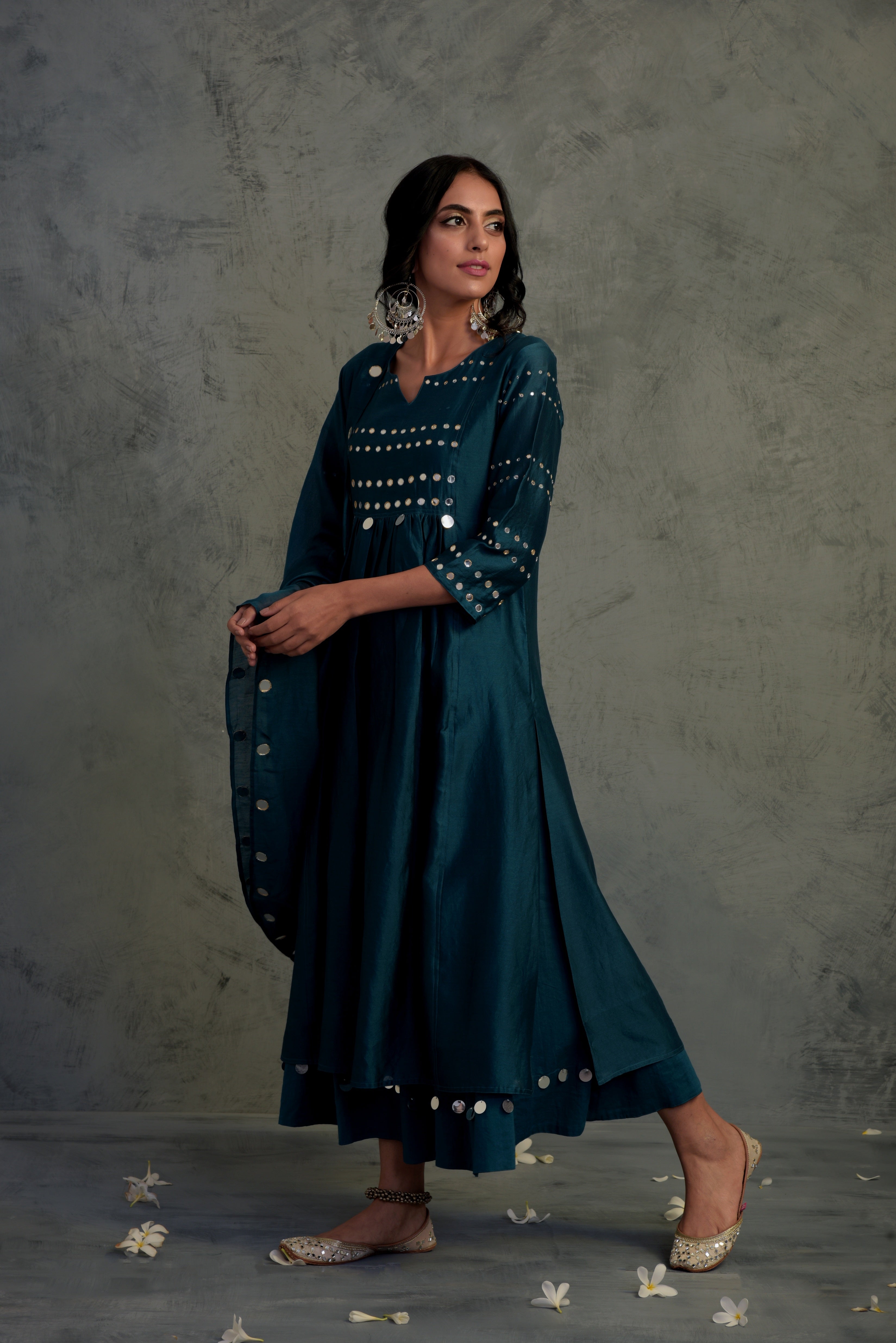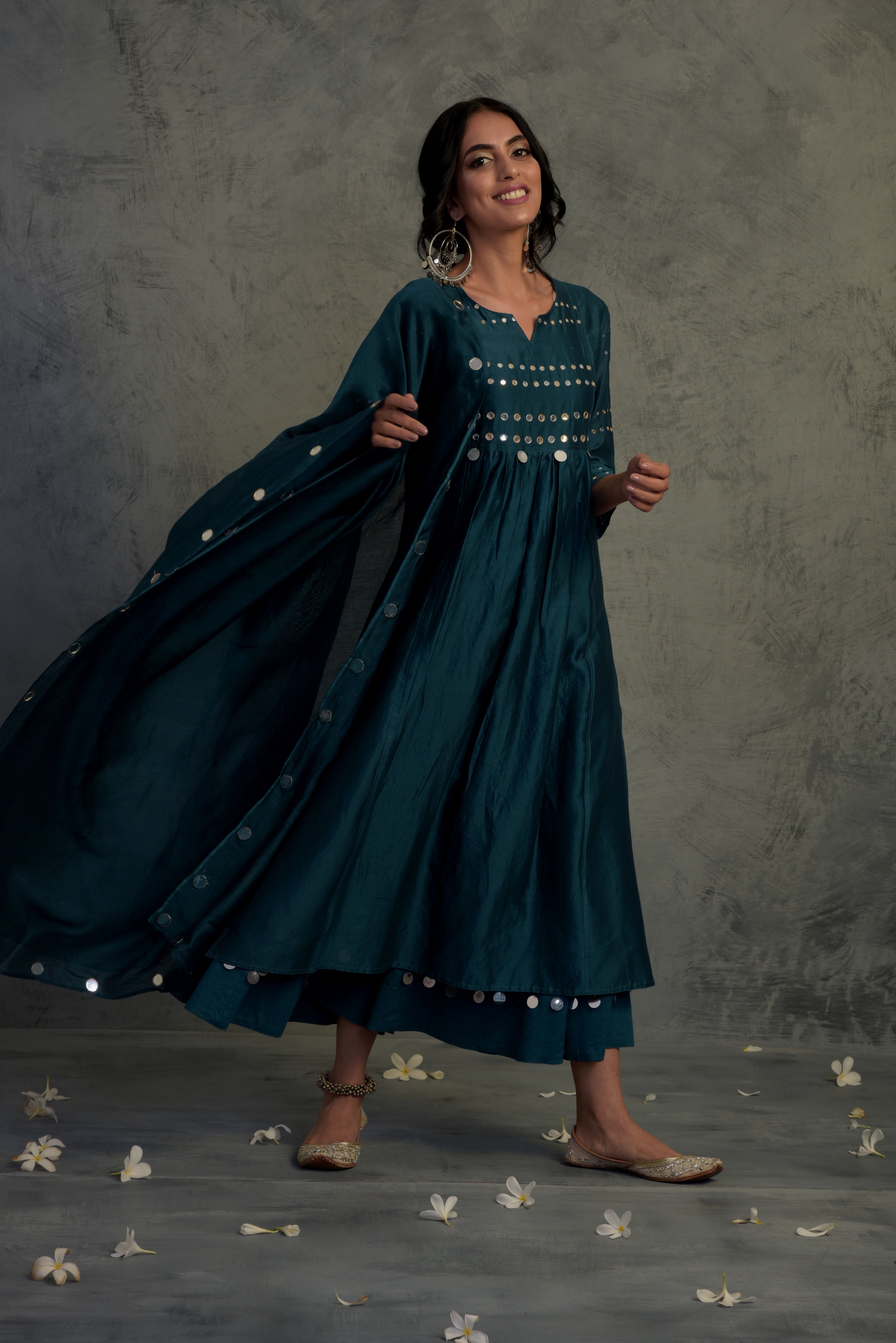 Chanderi kurta in Teal Blue color with mirror work on yoke and sleeves. This Front yoke gathered kurta set is paired with a chanderi dupatta with mirror work on borders and comes along with cotton wide flared palazzos highlighted with mirrors. Perfect festive dressing for a glittery evening.