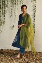 This true blue kurta set in a straight silhouette with side slits and beautiful scalloped neckline is elegant and enchanting. Designed with intricate nakshi and zari antique silver hand embroidery , this contemporary ensemble is ideal for your festive celebrations.