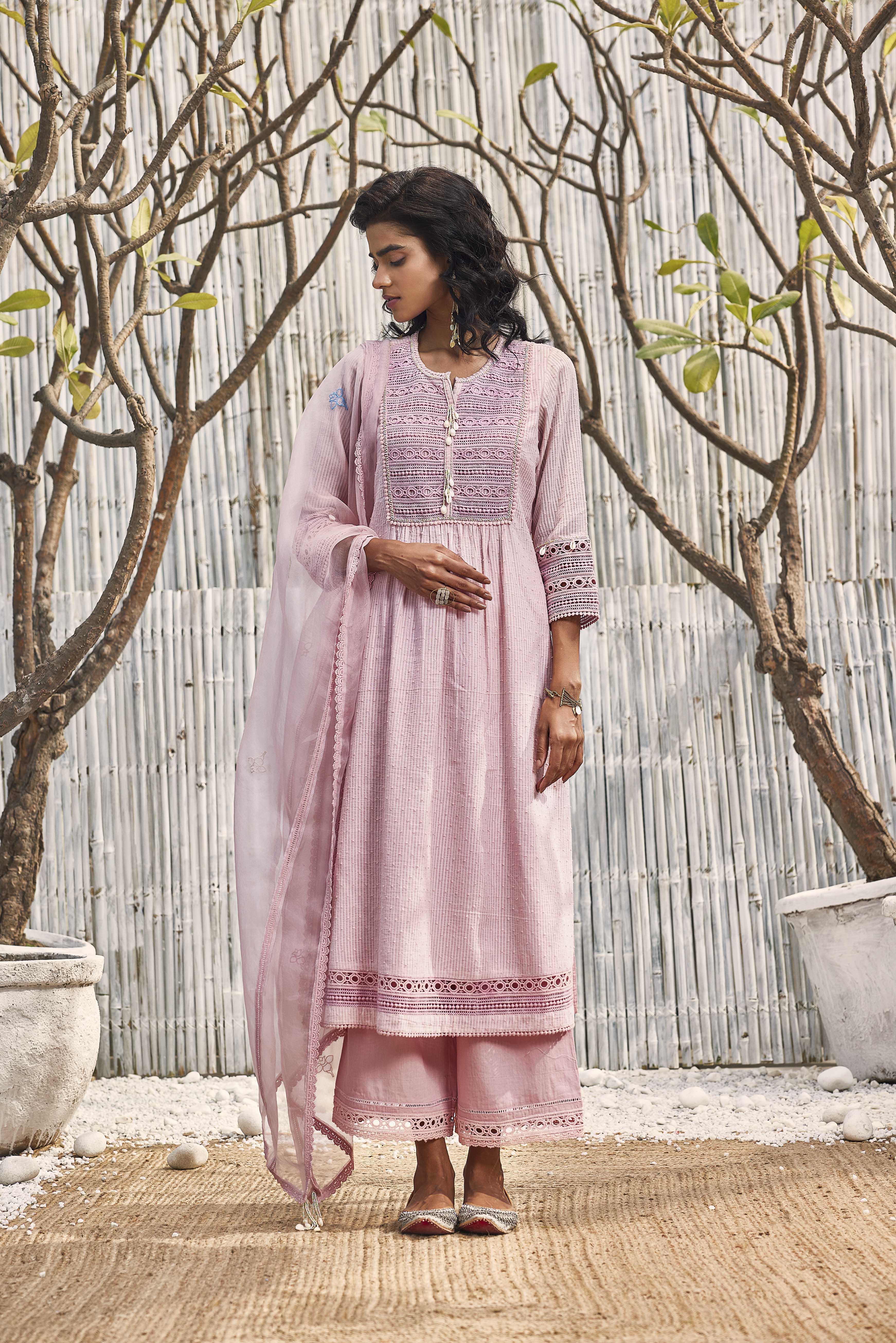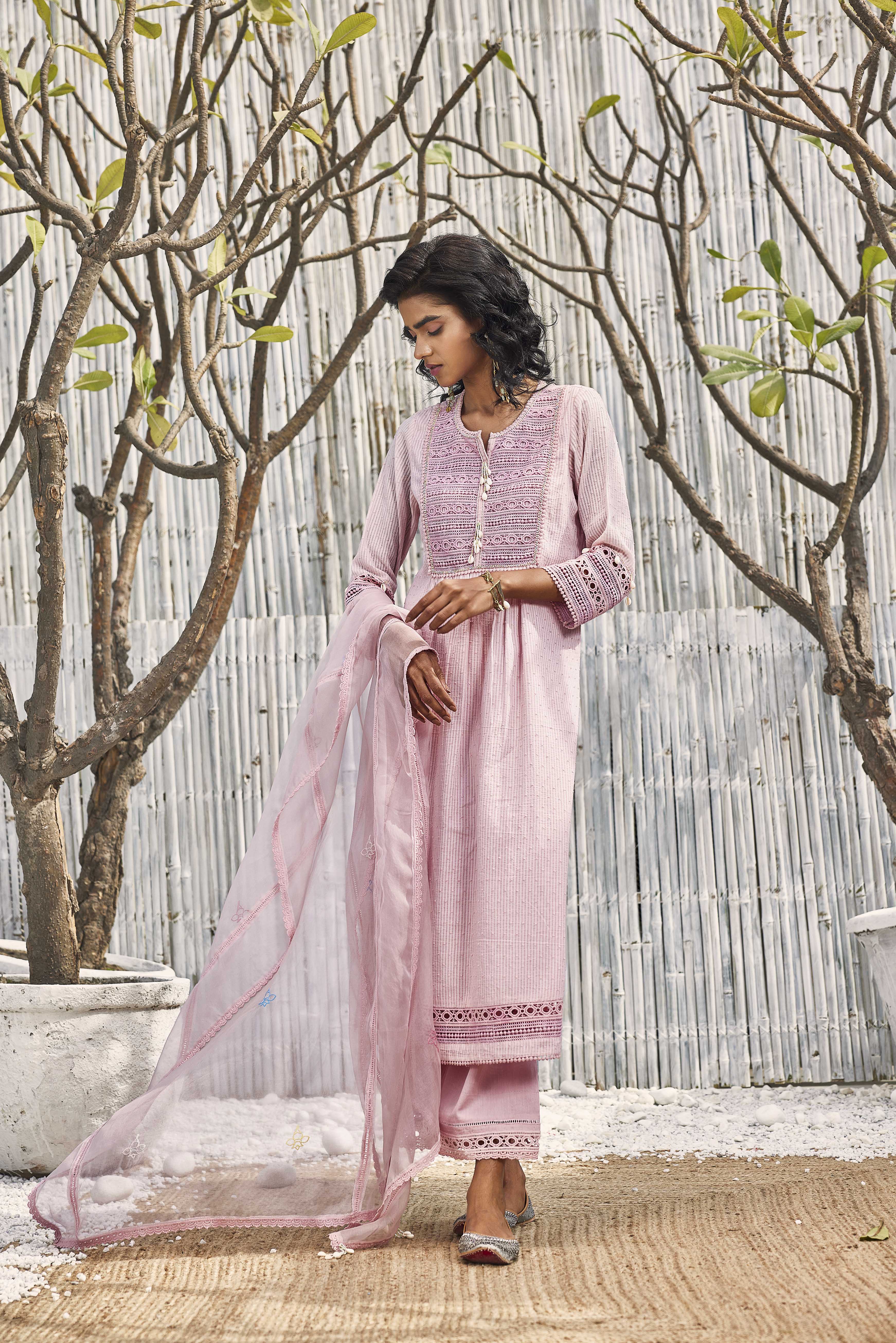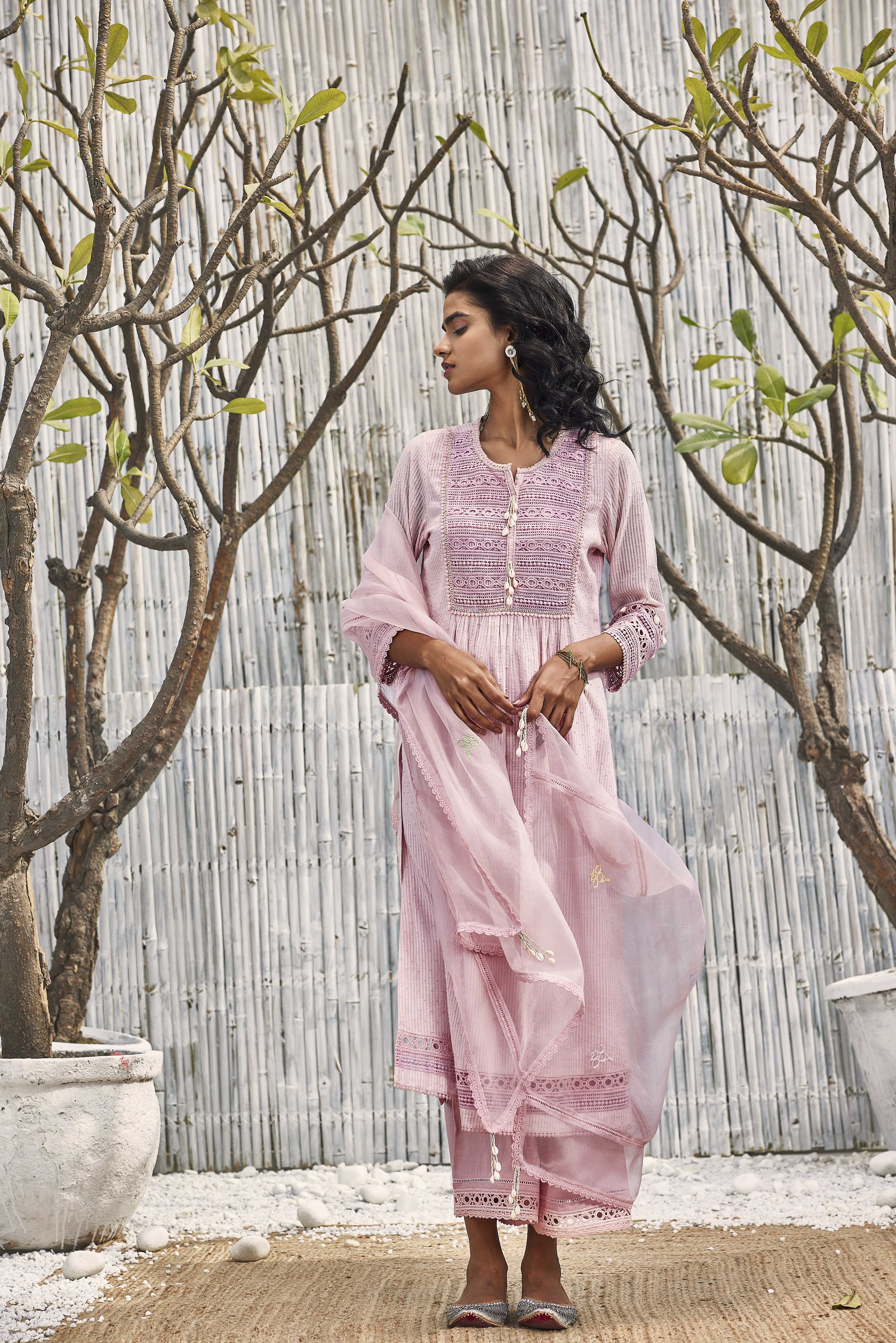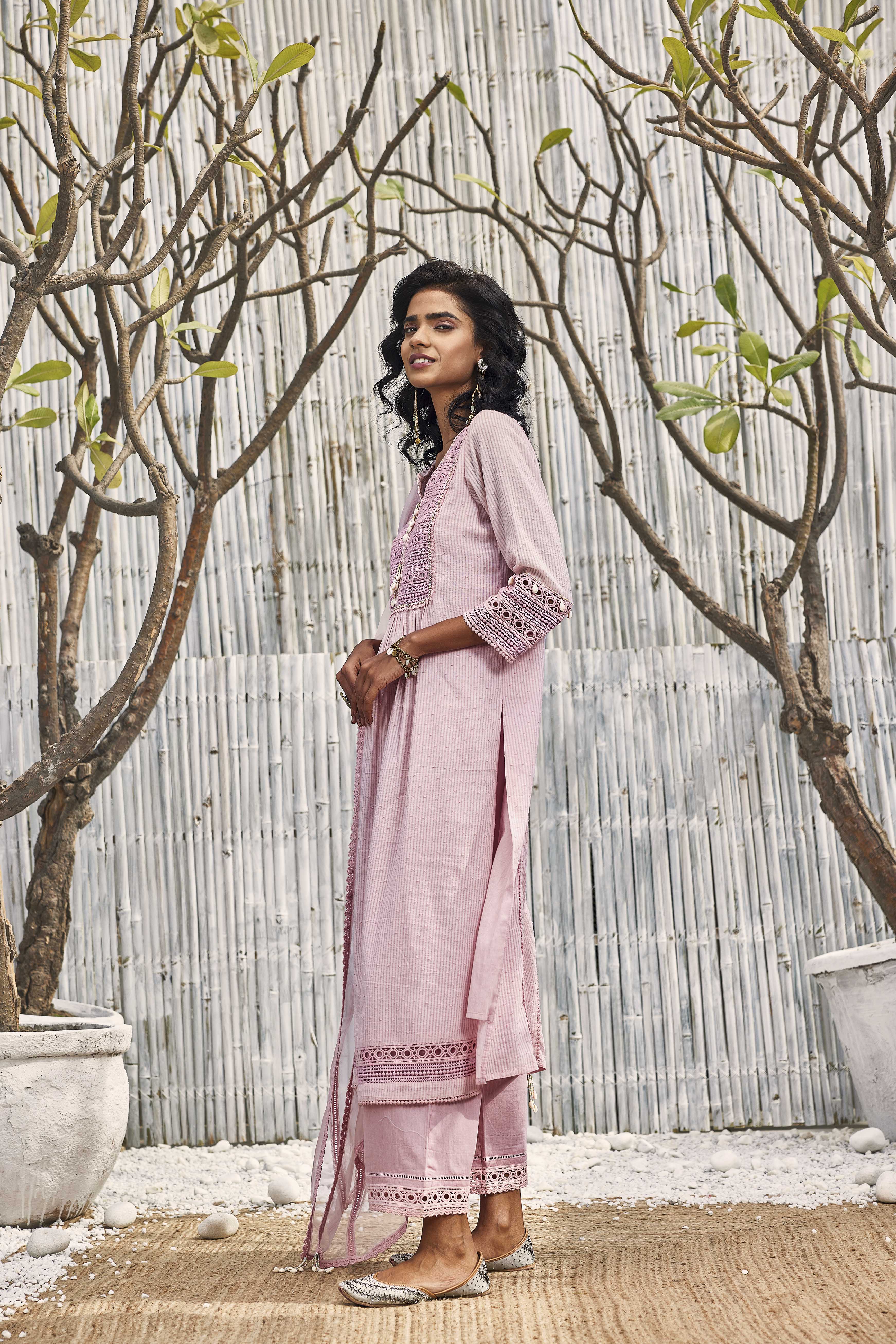 This elegant blush pink kurta set is crafted with intricate lace pattern all over the yoke and sleeves. Delicate beadwork and shell tassels makes it a perfect choice for all occasions.