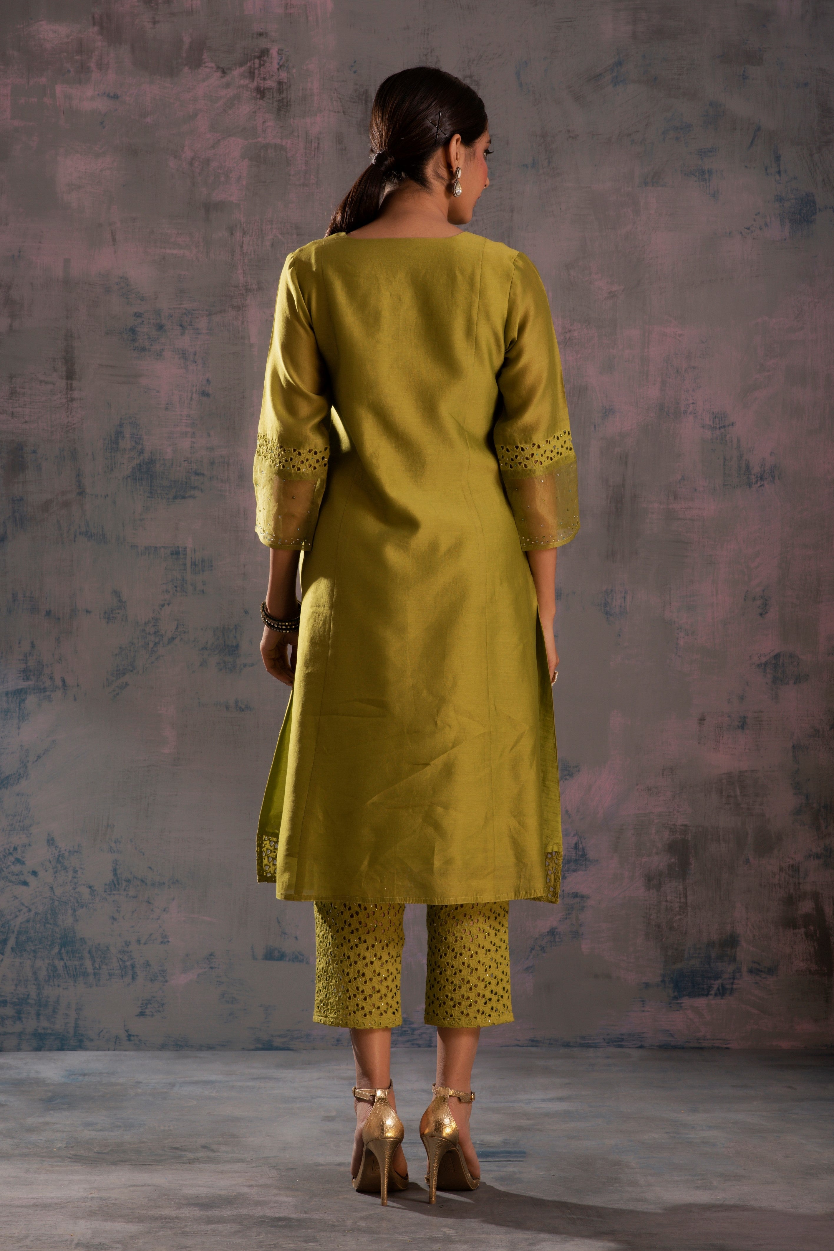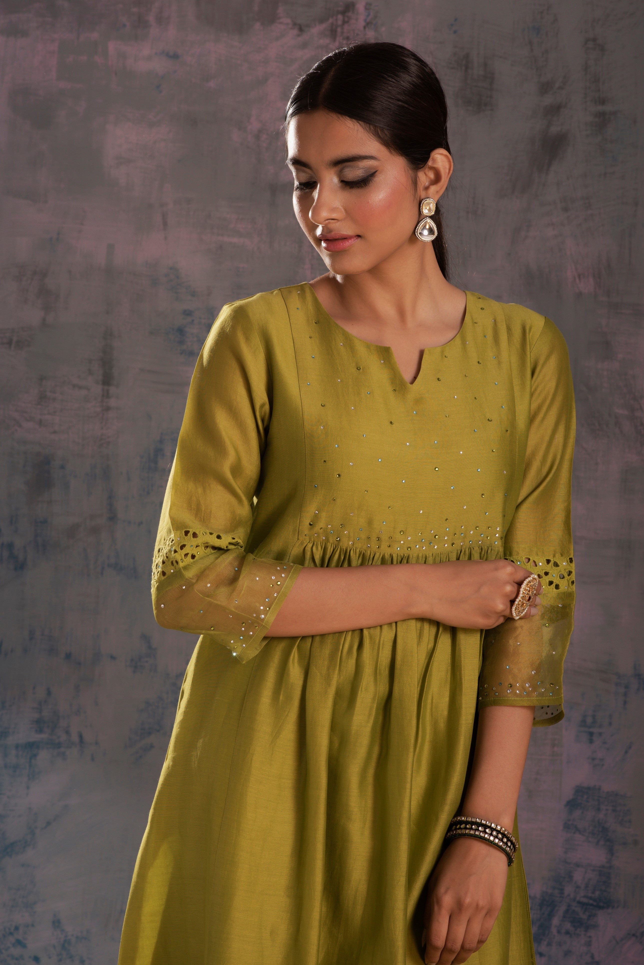 Chanderi berry green kurta with swarovski work on yoke & sleeves. This front gathered kurta is paired with straight cutwork pants studded with swarovski and organza dupatta embellished with swarovski.