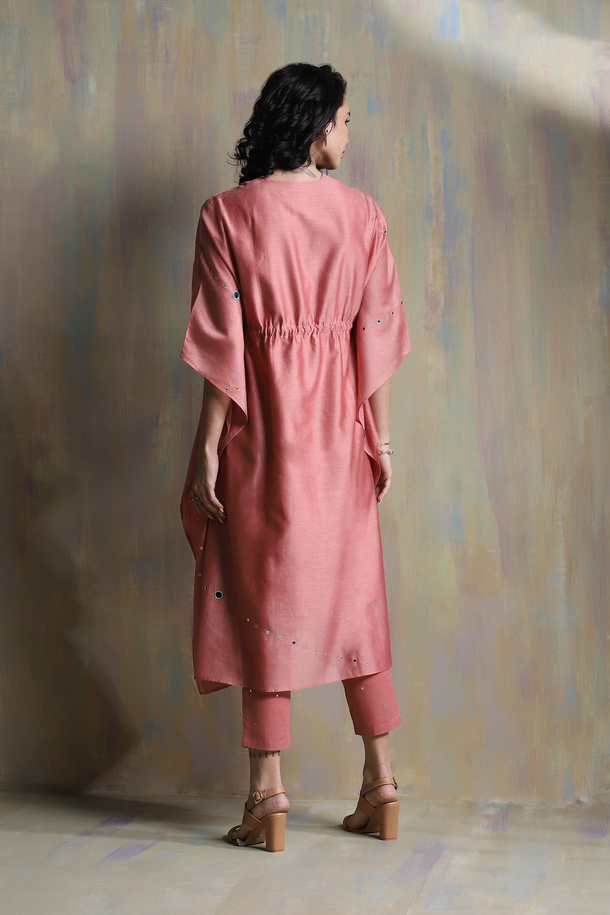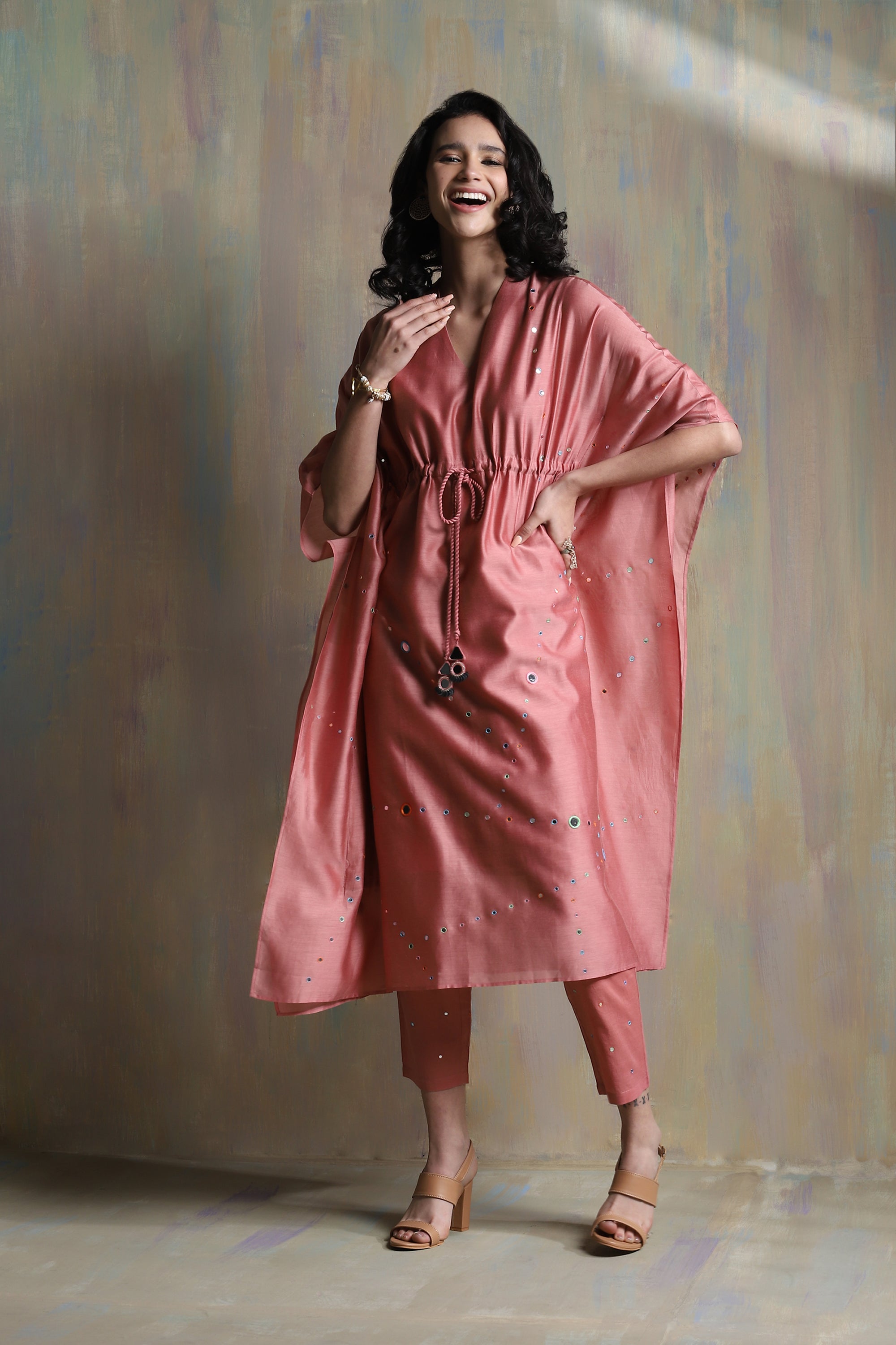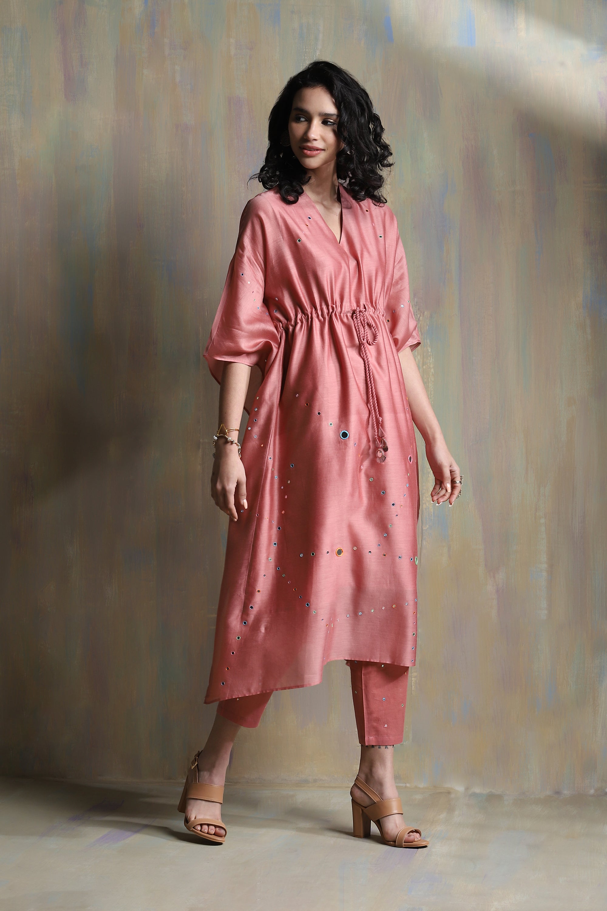 Chanderi kaftan with colored embroidery embedded with mirrors and a front drawstring with mirror hangings, loose fit with gathers and side slit, paired with straight pant.