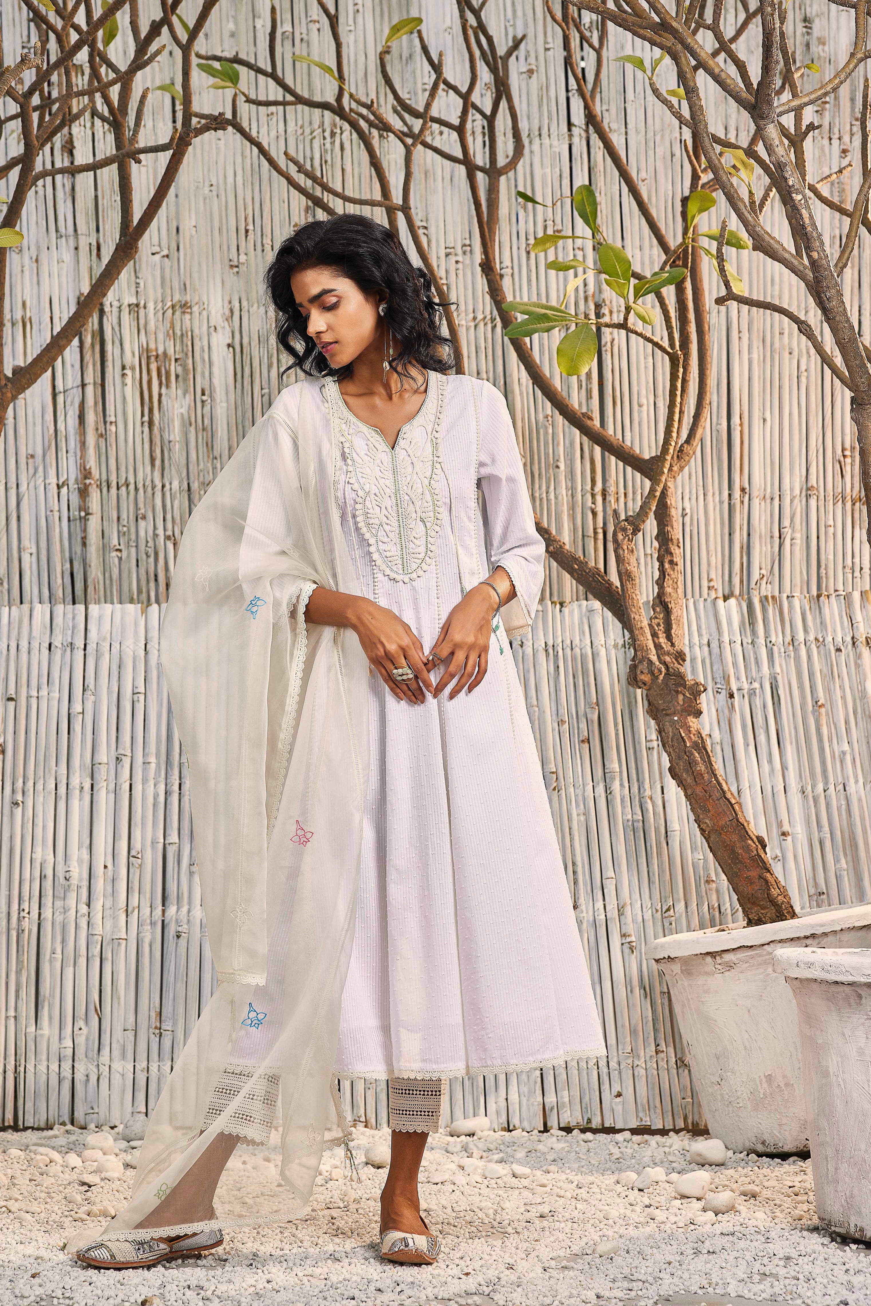 Off-White Lace Flairy Cotton Kurta with Pant - Set of 3