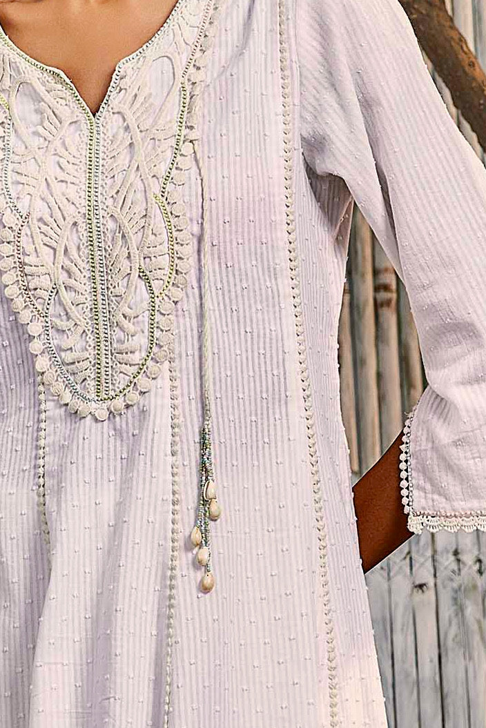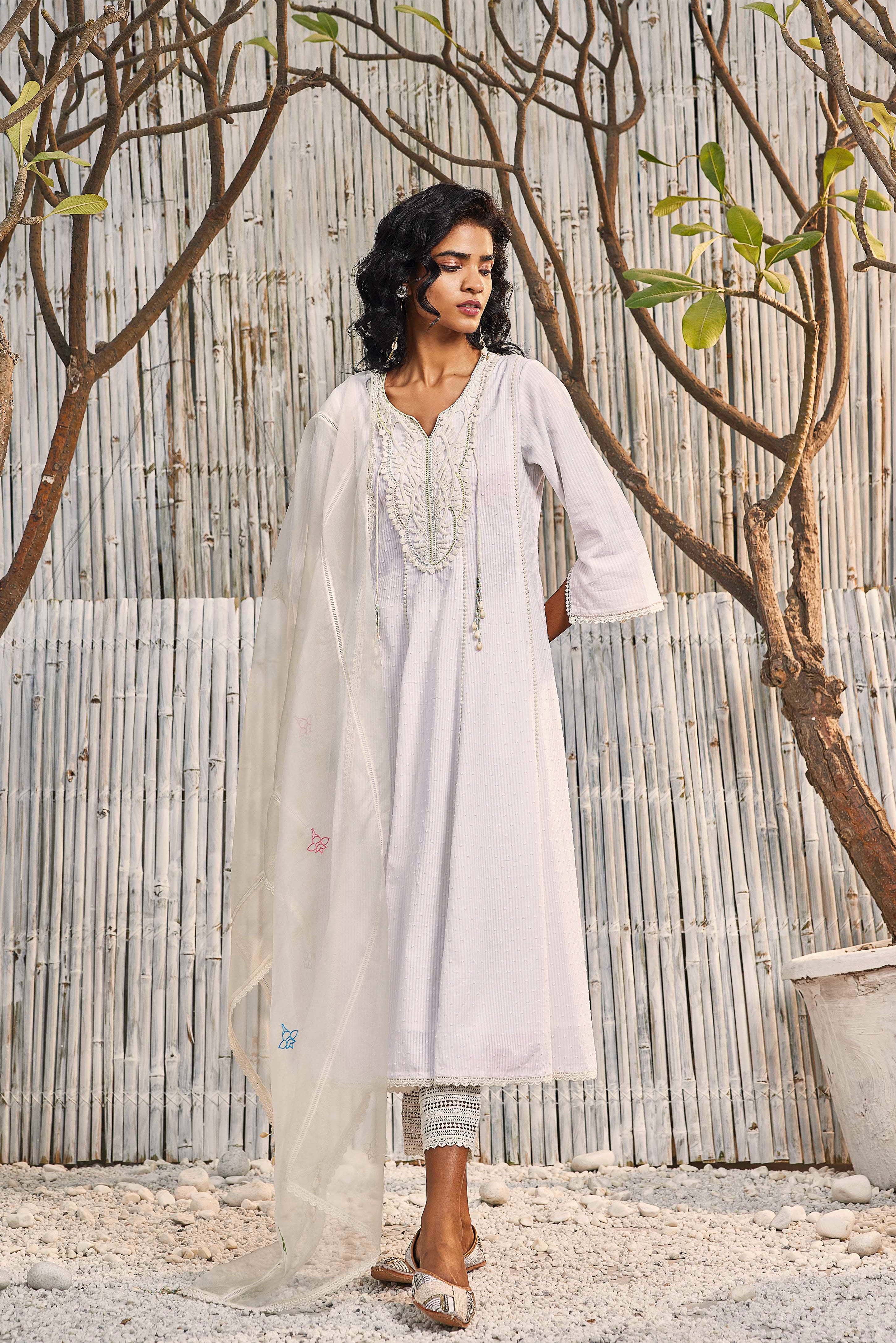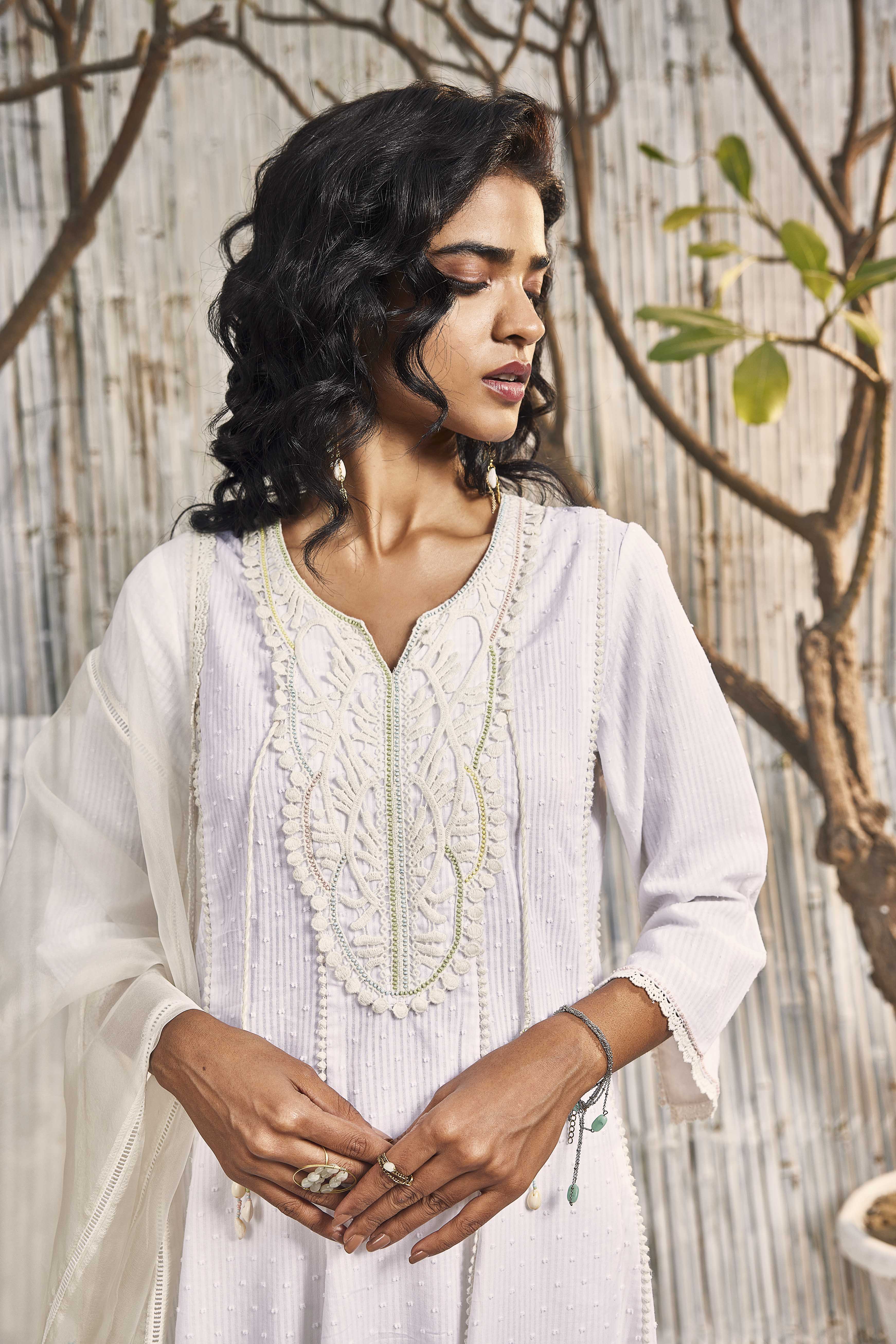Our bead Off-white kurta set in a flairy silhouette with side slits is crafted to match your summer vibe. Intricate bead work, handmade shell tassels intertwined with dainty laces elevates the look of this breezy kurta set.
