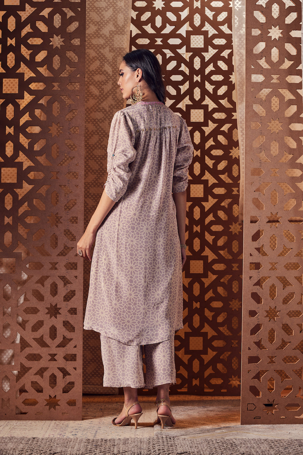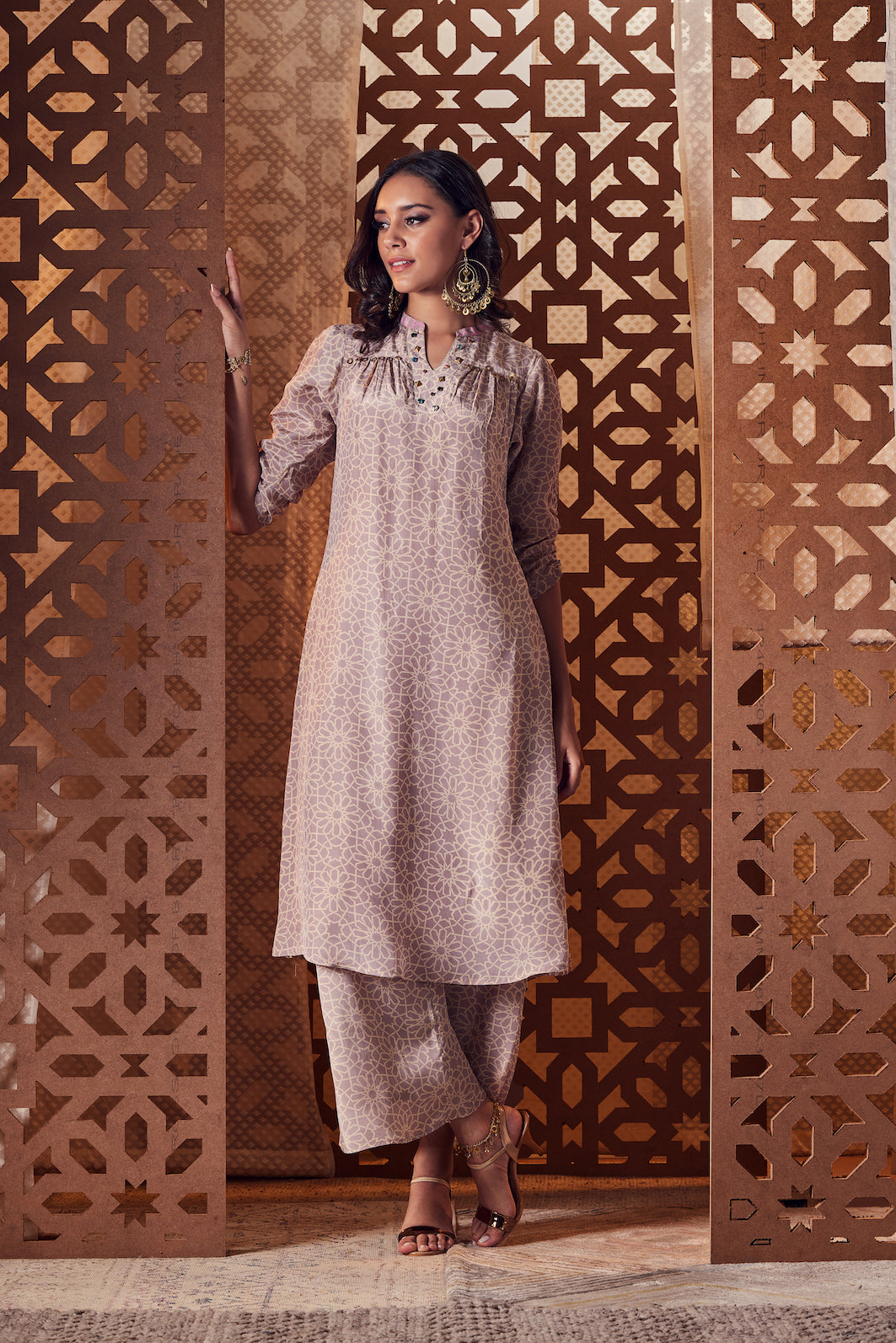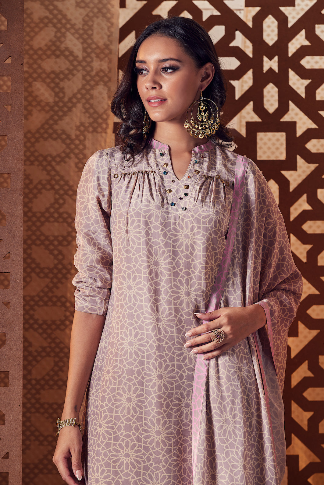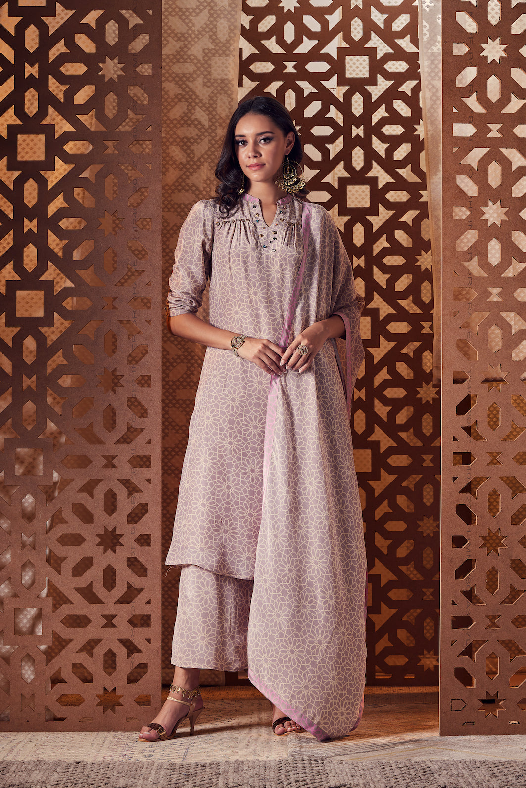 This A-line kurta Set features bespoke prints in a subtle palette. The neckline is embellished with gems and studs and three quarter sleeves with gathers adds a unique charm to the outfit.