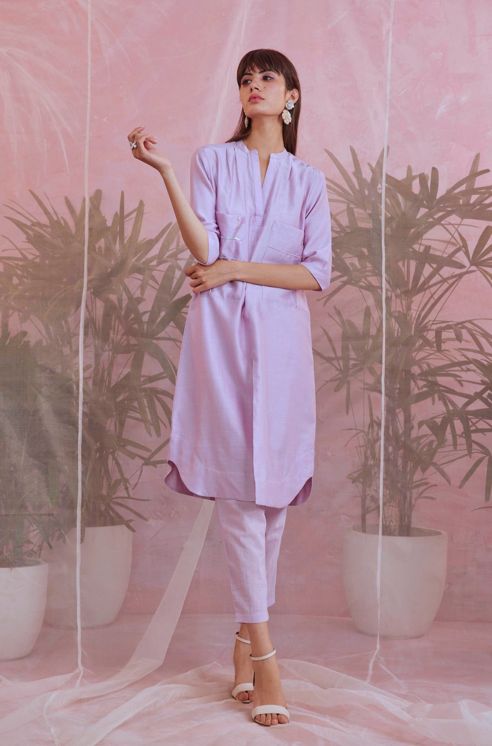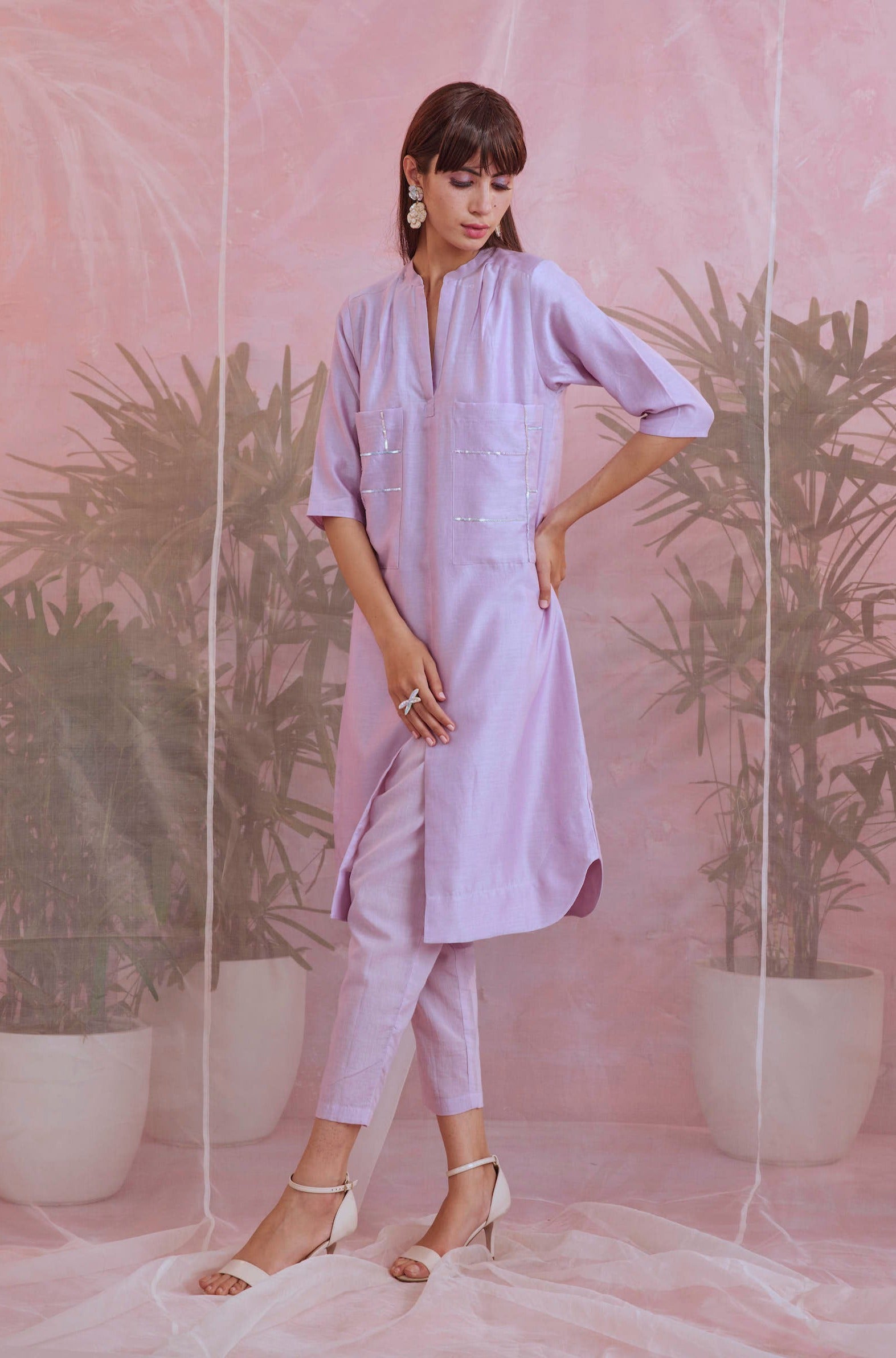 Contemporary style comfort fit straight kurta with front slit. Sequin hand work on big patch pockets in front paired with straight pants.