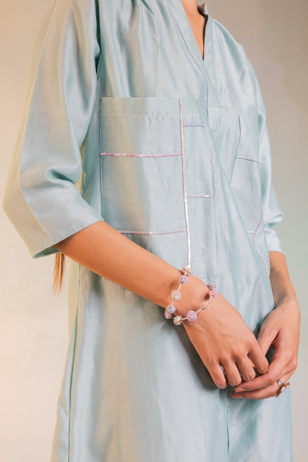 Contemporary style comfort fit straight kurta with front slit. Sequin hand work on big patch pockets in front paired with straight pants.