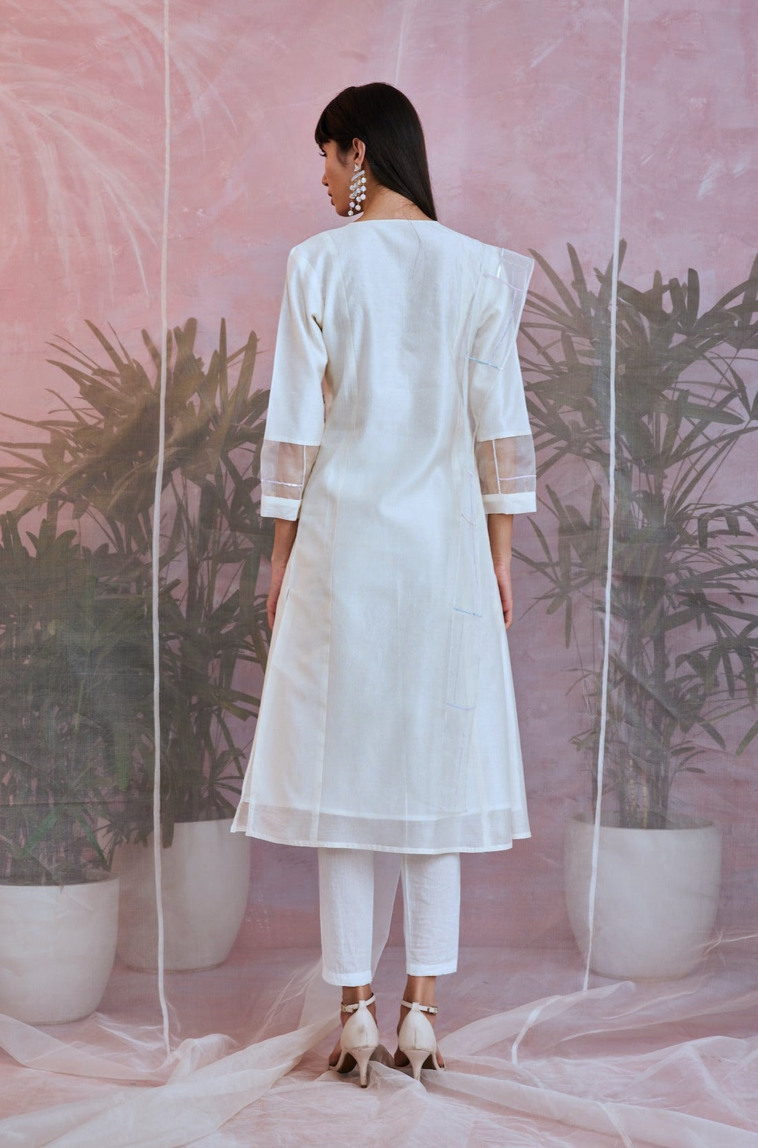 Our classic straight kurta with yoke and gathers in front, sequin embroidery on yoke and sleeves with organza inlay. This kurta is paired with straight cotton pants and an organza narrow dupatta with sequin work.